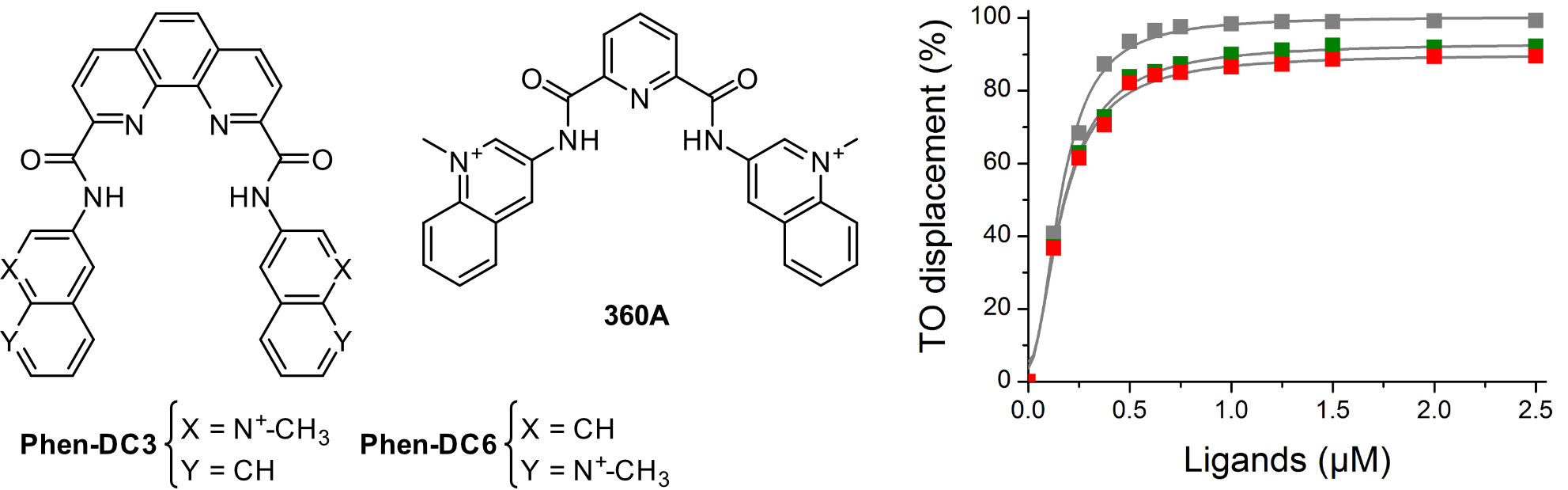 Les avantages du FID sont nombreux. C’est une méthode peu chère, rapide (notamment en microplaque ; voir les sections 1.4.1.2.1, 1.4.1.2.2), exacte et précise, et dotée d’une bonne résolution. Par rapport au FRET-melting, elle a l’avantage d’être isotherme et ne nécessite qu’un fluorimètre standard. En revanche, elle ne permet généralement pas de mesurer de constantes d’affinité, même si cela est possible dans certains cas particulier que j’ai eu la chance de rencontrer (Section 1.4.1.3.2). Le FID peut aussi apporter des informations qualitatives sur le mode d’interaction. Par exemple, le déplacement partiel du TO par le ligand TOxaPy suggère que ce dernier n’interagit pas sur les G-quartets, comme le TO, mais plutôt dans les sillons (Figure 1.15) [73].