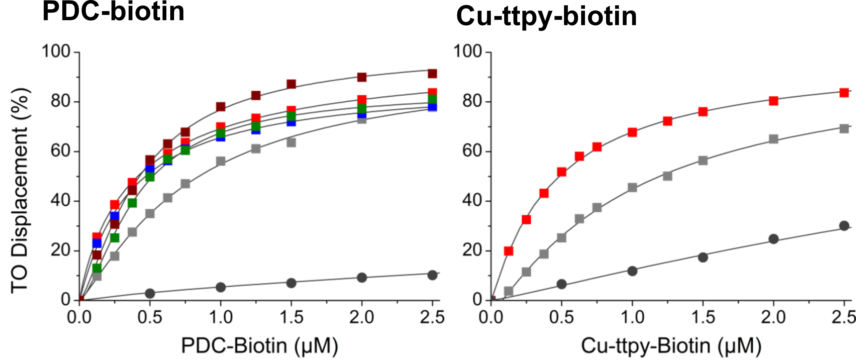 Les expériences HT-G4-FID ont confirmé que le ligand PDC‑biotin conserve une affinité élevée pour les G4s, comparé à 360A, ainsi qu’une sélectivité remarquable par rapport à l’ADN duplex (Figure 1.29). À l’inverse, Cu-ttpy-biotin a une affinité nettement plus faible pour les G4s et, en outre, est moins sélectif que Cu‑ttpy, ce qui en fait un moins bon candidat pour les expériences de SELEX.