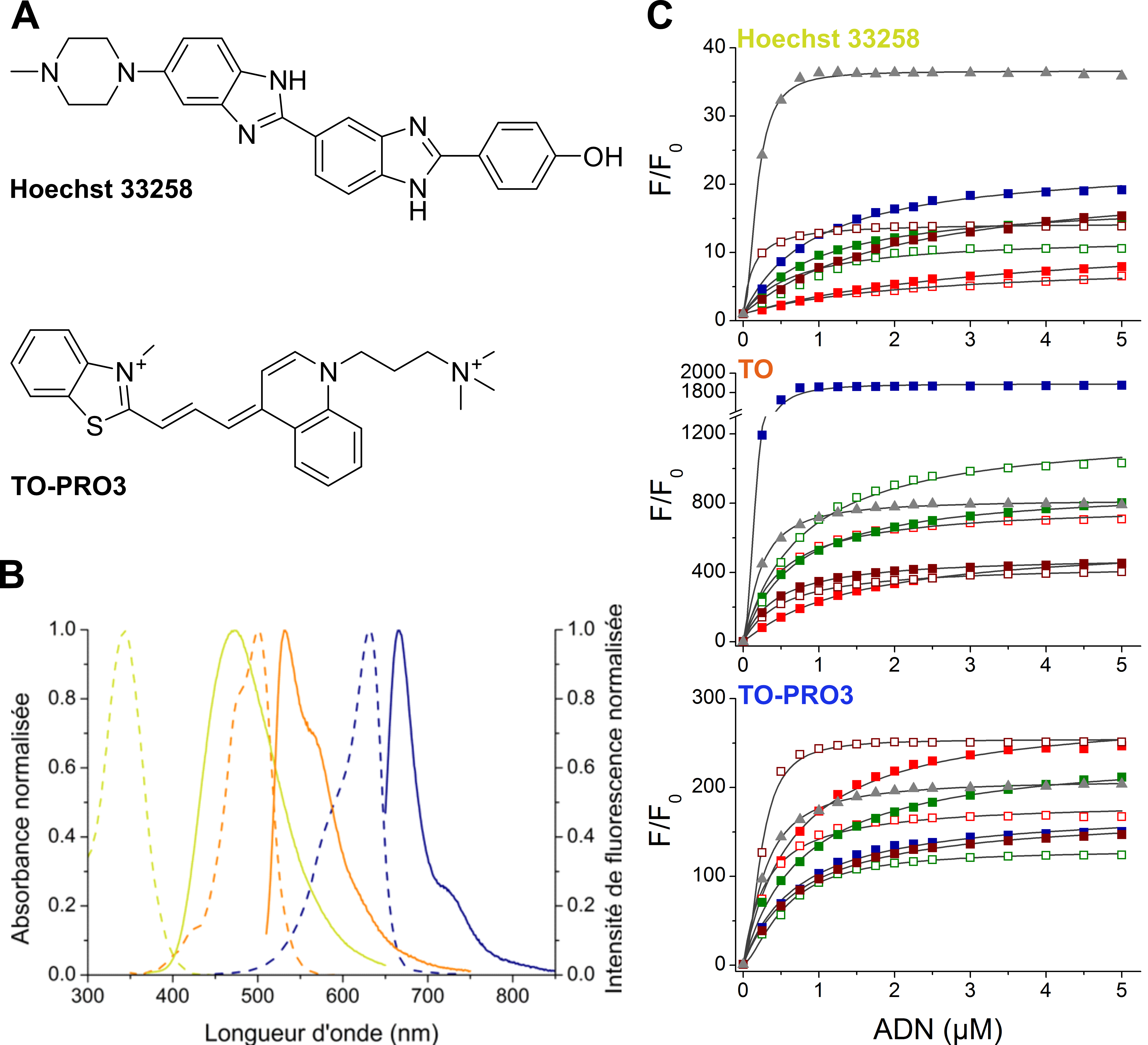 Dans le même temps, et à l’instar de D. Boger, j’ai étendu la gamme spectrale de l’essai en utilisant deux sondes fluorescentes supplémentaires (Hoechst 33258 et TO-PRO3 ; Figure 1.23), dont les spectres d’absorption et d’émission sont complémentaires de ceux du TO [89]. Cela permet de cribler des ligands susceptibles d’absorber et/ou d’être fluorescents dans la même gamme spectrale que le TO (comme la porphyrine TMPyP4), et donc de fausser les résultats. Ces améliorations ont été validées avec un panel cinq oligonucléotides d’ADN et cinq ligands d’affinité et sélectivités variées.