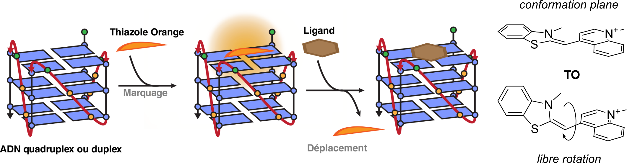 Concrètement, l’oligonucléotide est marqué de façon non covalente par une sonde dont la fluorescence est fortement exaltée en sa présence (on ; structure plane et isolé du solvant aqueux). L’ajout de quantités croissantes de ligand entraîne le déplacement de la sonde et donc une diminution de la fluorescence (off ; structure en libre rotation et accessible par l’eau; Figure 1.21). Le suivi de l’intensité de fluorescence permet d’estimer l’affinité de la molécule pour l’oligonucléotide testé. Plus un ligand est affin, plus de faibles concentrations de celui-ci suffisent à déplacer la sonde.
