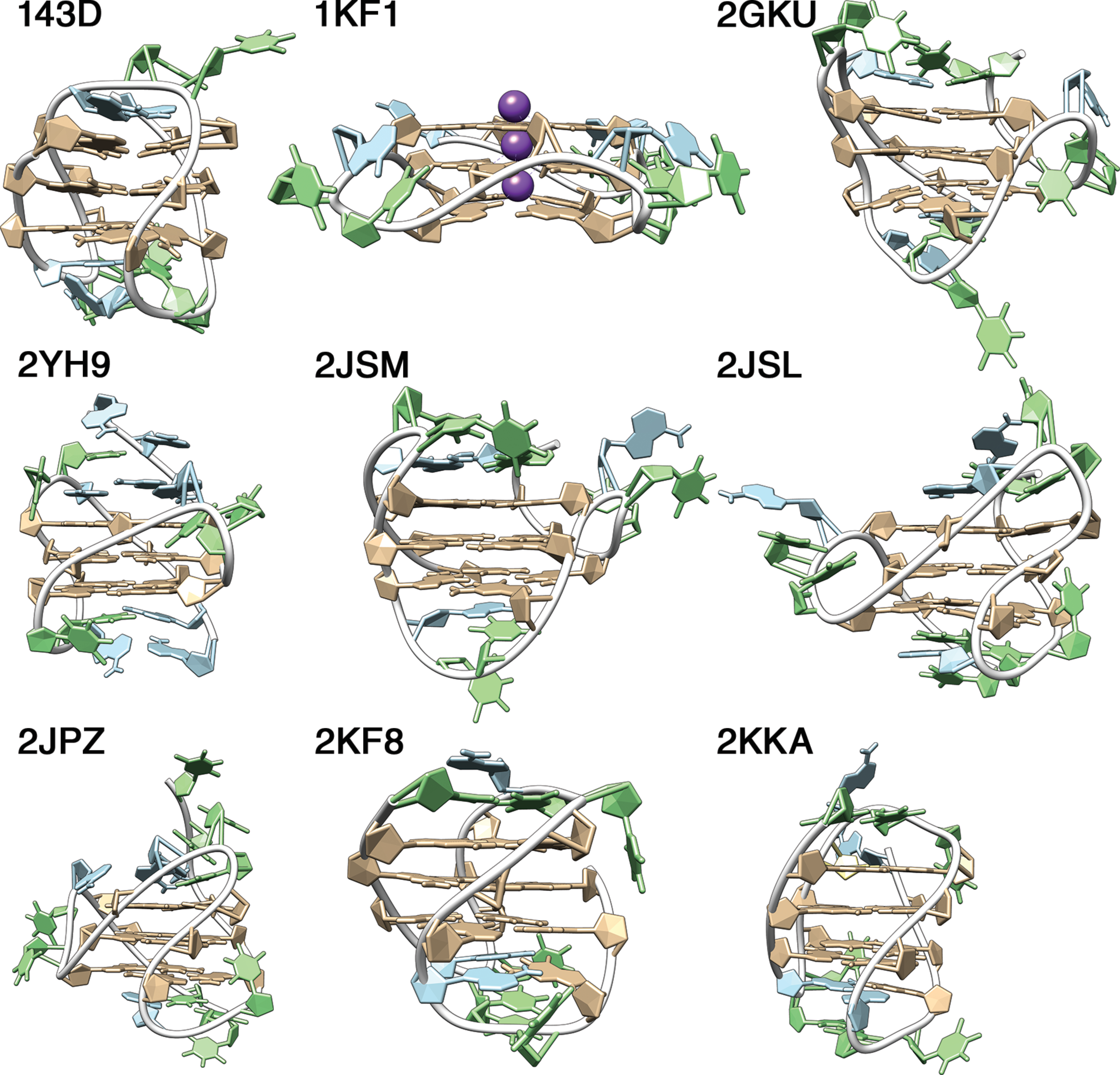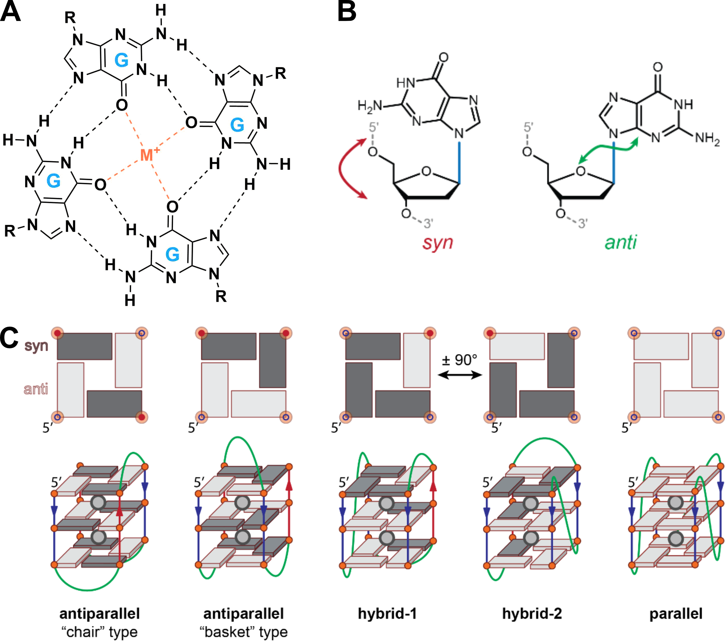 Les G4 sont particulièrement polymorphes ; certaines séquences peuvent adopter des conformations distinctes, coexistant parfois en équilibre [17, 18]. Les résidus des termini et des boucles peuvent favoriser des conformations spécifiques en formant des paires de bases avec d’autres résidus de termini ou des boucles et en s’empilant sur des tétrades externes [19–21]. En règle générale, les séquences avec des boucles plus courtes ont tendance à adopter une géométrie propeller et à produire des G4s plus stables que celles avec des boucles longues [22].