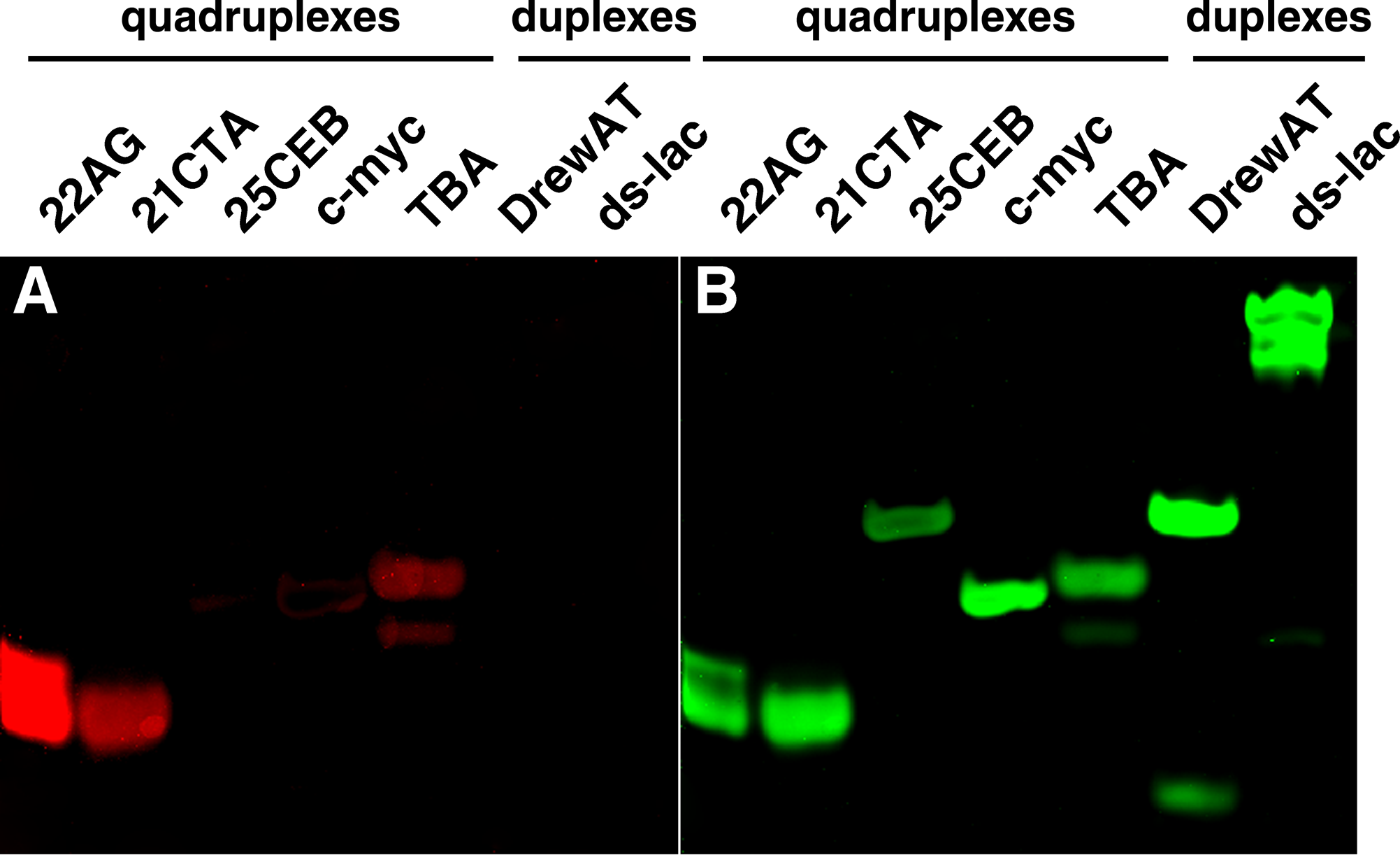 En revanche, presque aucune fluorescence n’a été observée dans les bandes contenant des ADN duplex (ds-lac, DrewAT) et TBA. Ce quadruplexe à deux tétrades est très souvent peu lié par les ligands de G4, comme j’aurai l’occasion de le voir dans de nombreuses autres études présentées ici.