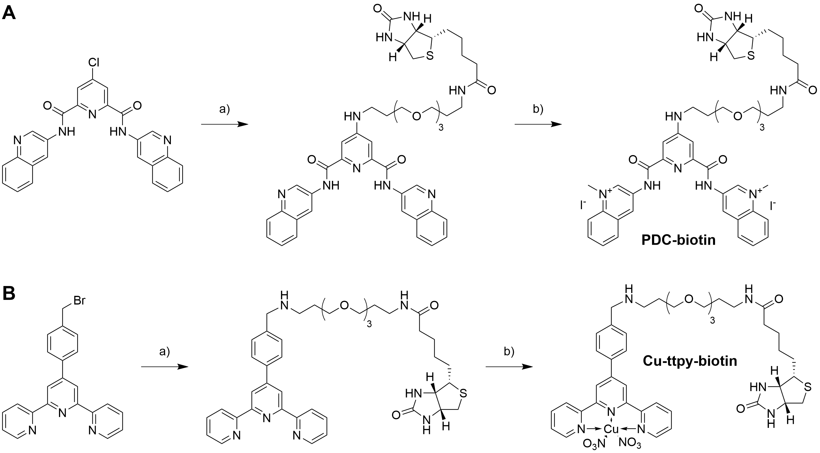 Florian Hamon est reparti d’un intermédiaire de synthèse de Cl-360A (celui précédant la méthylation finale des quinolines) pour y coupler la chaîne biotinylée. Le ligand final PDB-biotin a ensuite été obtenu après méthylation des quinolines. De mon côté, j’ai couplé la chaîne biotinylée sur un dérivé bromé de ttpy, puis ai complexé du cuivre(II) pour obtenir Cu-ttpy-biotin.