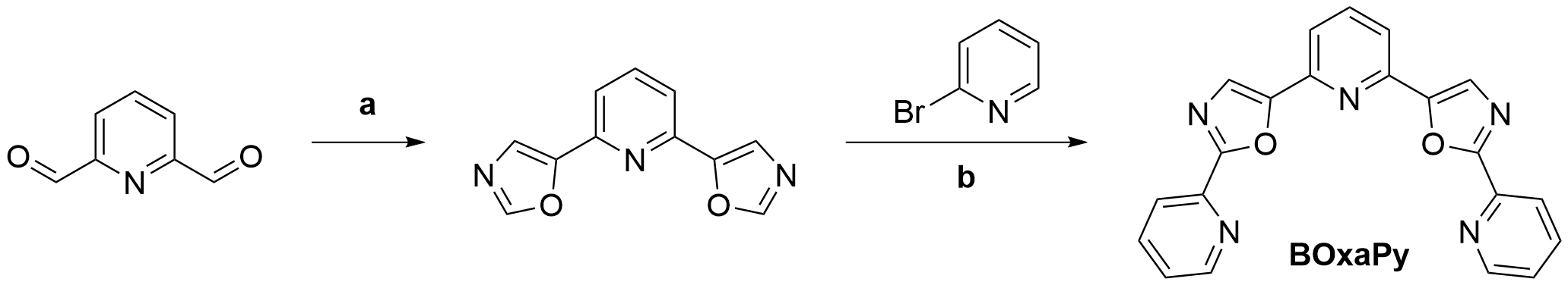 Leur synthèse initiale s’est appuyée sur une procédure convergente basée sur le couplage de la 2,6-bis(oxazol-5-yl)pyridine avec des dérivés de la 2-bromopyridine par la double activation des CH des oxazoles [75] (Figure 1.12). La 2,6-bis(oxazol-5-yl)pyridine a été obtenue en deux étapes par l’oxydation de la 2,6-lutidine avec du dioxyde de sélénium pour obtenir la pyridine-2,6-dicarbaldéhyde [76], qui a été soumise aux conditions de Van Leusen. Le couplage dans des conditions classiques avec deux équivalents molaires de 2-bromopyridine a conduit au penta-hétéroaryle BOxaPy (bisoxazoletrispyridine). La même réaction de couplage a été effectuée en utilisant le 2-bromo-5-(pyridine-2-yl)oxazole pour préparer l’homologue heptaaryle TOxaPy (tétraoxazoletrispyridine).