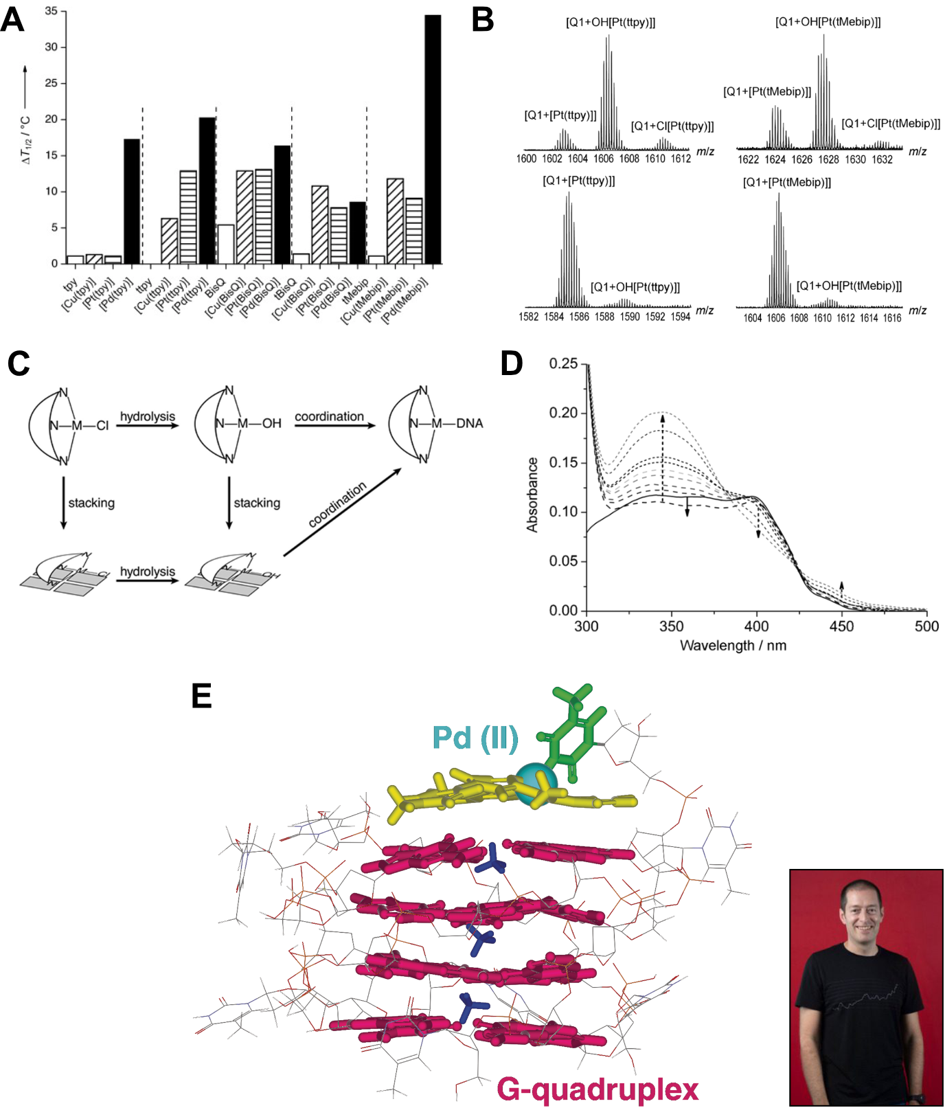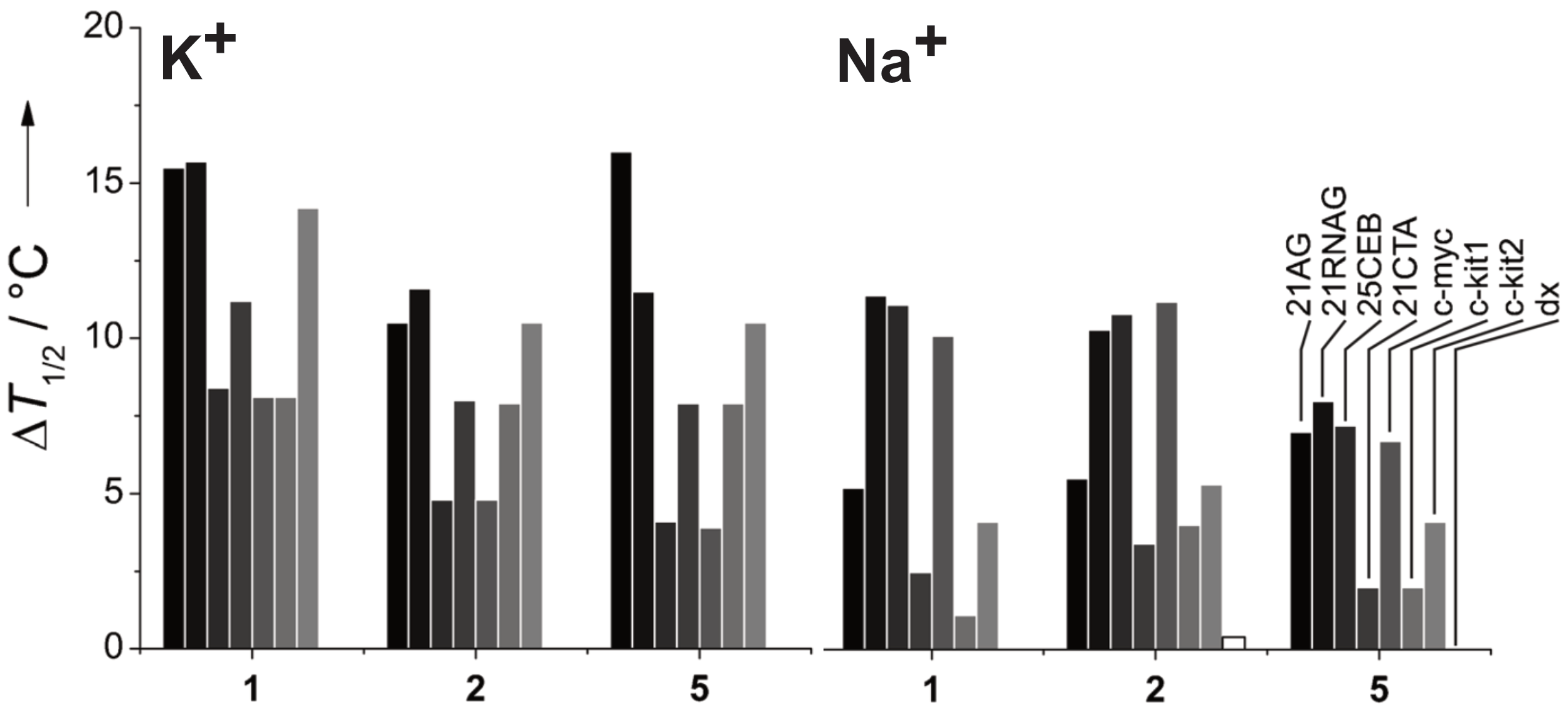 Nous avons observé une augmentation de la température de dénaturation des G4s impressionnante en présence des complexes de palladium, qui suggère une interaction forte (collaboration avec Aurore Guédin et Jean-Louis Mergny, ARNA, Bordeaux) (Figure 1.10A). Les complexes de platine et de cuivre donnent des stabilisations moindres, montrant l’importance de la nature du métal. La structure du ligand organique exerce également une influence, les surfaces aromatiques plus larges favorisant le stacking.