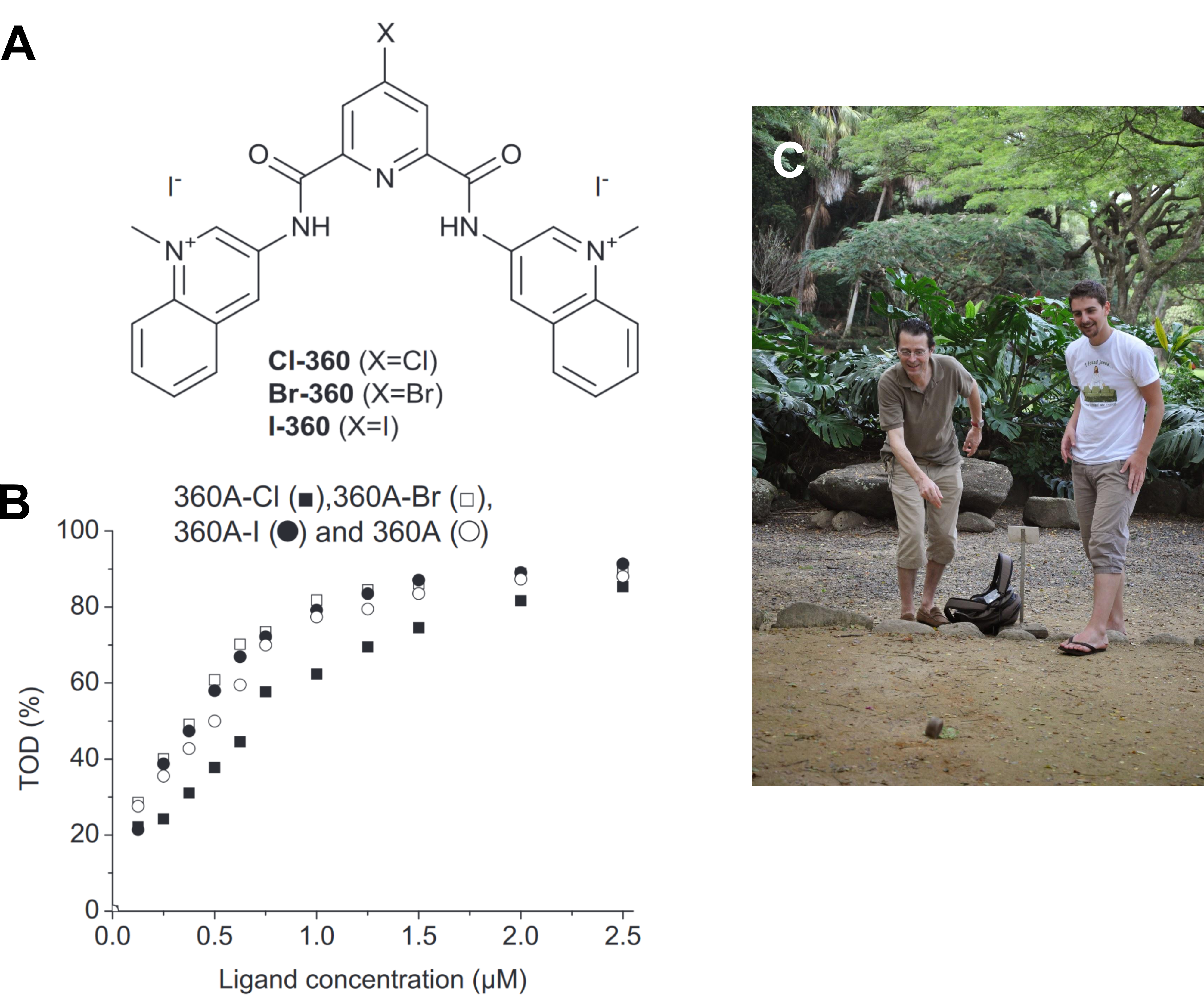 J’ai assisté à la synthèse d’une série de dérivés halogénés du ligand 360A (Figure 1.28A), pour laquelle j’ai encadré Julien Botton (Master, Université Pierre et Marie Curie, Paris VI) avec Florian Hamon, puis j’ai évalué leur affinité pour les G4s télomériques humains avec le test HT-G4-FID. Les dérivés bromé et iodé, mais pas le chloré, ont une affinité légèrement supérieure à celle de 360A, tout en conservant une excellente sélectivité contre l’ADN duplex (Figure 1.28B). Malheureusement, nous n’avons pas pu rationaliser le comportement différent du dérivé chloré sur la base de l’électronégativité et de considérations stériques. Au final, les cellules de fibrosarcome HT1080 traitées jusqu’à 24 jours avec 360A-Br ont présenté des variations mineures mais significatives de leur composition en nucléotides terminaux du brin C, avec également une déplétion partielle de POT1.