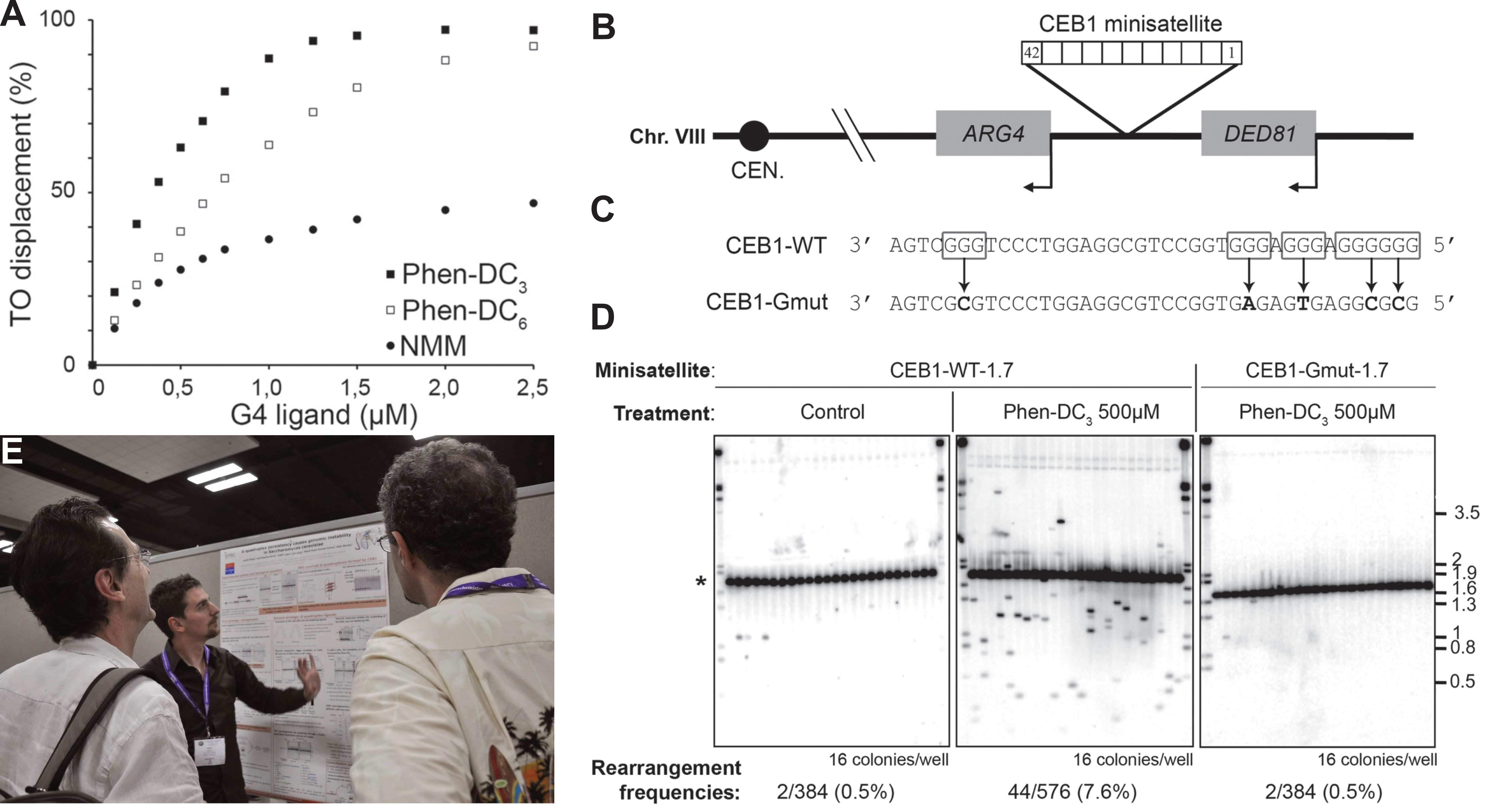 Dans le cadre d’une collaboration avec l’équipe du Dr. Alain Nicolas (Institut Curie, Paris), j’ai ainsi utilisé le test HT-G4-FID pour démontrer la grande l’affinité des ligands PhenDC3 et PhenDC6 pour le G4 formé par le minisatellite humain CEB1, et leur sélectivité par rapport à l’ADN duplex [108]. Cela a permis d’expliquer leur capacité à inhiber la déstructuration de ce G4 par l’hélicase Pif1 chez Saccharomyces cerevisiae. In vivo, les deux composés ont rapidement induit des réarrangements dépendants de la recombinaison de CEB1, mais n’ont pas affecté les séquences ne formant pas de G4. Pour ces expériences, j’ai encadré Katie Mingo, alors étudiante en médecine (MIT, Boston, USA) et désormais oto-rhino-laryngologue a la Cleveland Clinic (Minneapolis, MN, USA).4