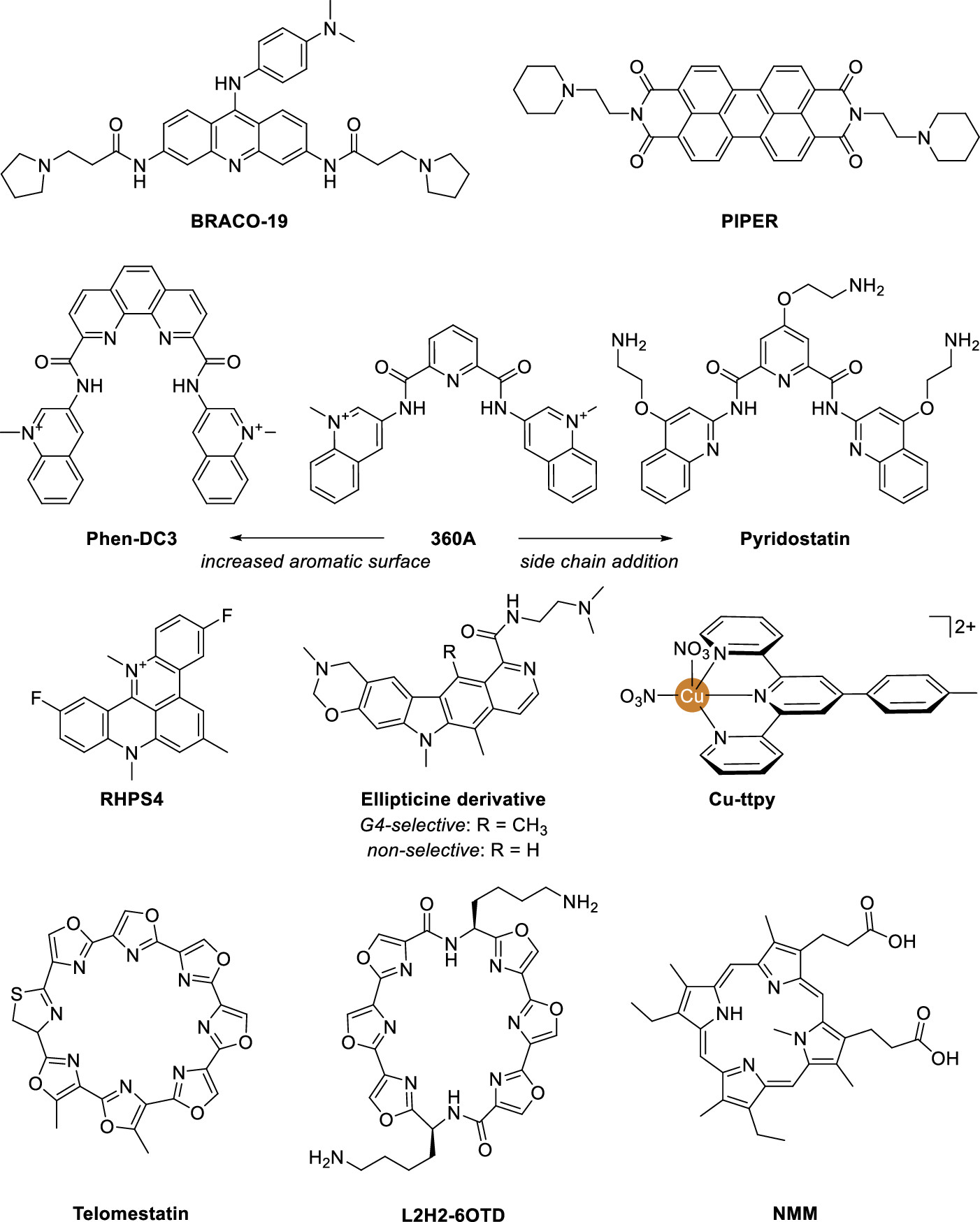 La découverte de molécules capables de se lier sélectivement à ces structures est une piste thérapeutique prometteuse [39–41]. Les premières générations de ligands de G4s a été fortement inspirée par les intercalants d’ADN duplex. Ainsi, un des premiers ligand de G4 connu est RHPS4, qui est un ligand d’ADN duplex (Figure 1.6) [42]. Compte tenu de la différence de taille et de forme entre les tétrades et les paires de bases, l’augmentation de l’affinité et de la spécificité peut reposer sur une simple augmentation de la surface aromatique afin d’optimiser son chevauchement avec tétrades tout en empêchant son intercalation. Le PhenDC3, qui présente une excellent affinité pour les G4s et une sélectivité élevée contre l’ADN duplex, est un bon exemple d’optimisation rationnelle de la taille et de la forme du cœur aromatique [43]. L’ajout de chaînes latérales protonables et l’optimisation de leur nature et de leur longueur peuvent également contribuer favorablement à l’interaction, moduler la sélectivité et améliorer la solubilité dans l’eau [44–49]. Un exemple précurseur est BRACO-19, une acridine 3,6,9-trisubstituée dont les pyrrolidines des chaînes latérales permettent des interactions favorables avec les sillons, tandis que le substituant 9-anilino se positionne dans un troisième sillon [42, 44, 50]. De même, la pyridostatine est un dérivé de la 360A dans lequel trois chaînes latérales ont été ajoutées et les quinolines ne sont plus N-méthylées [51].