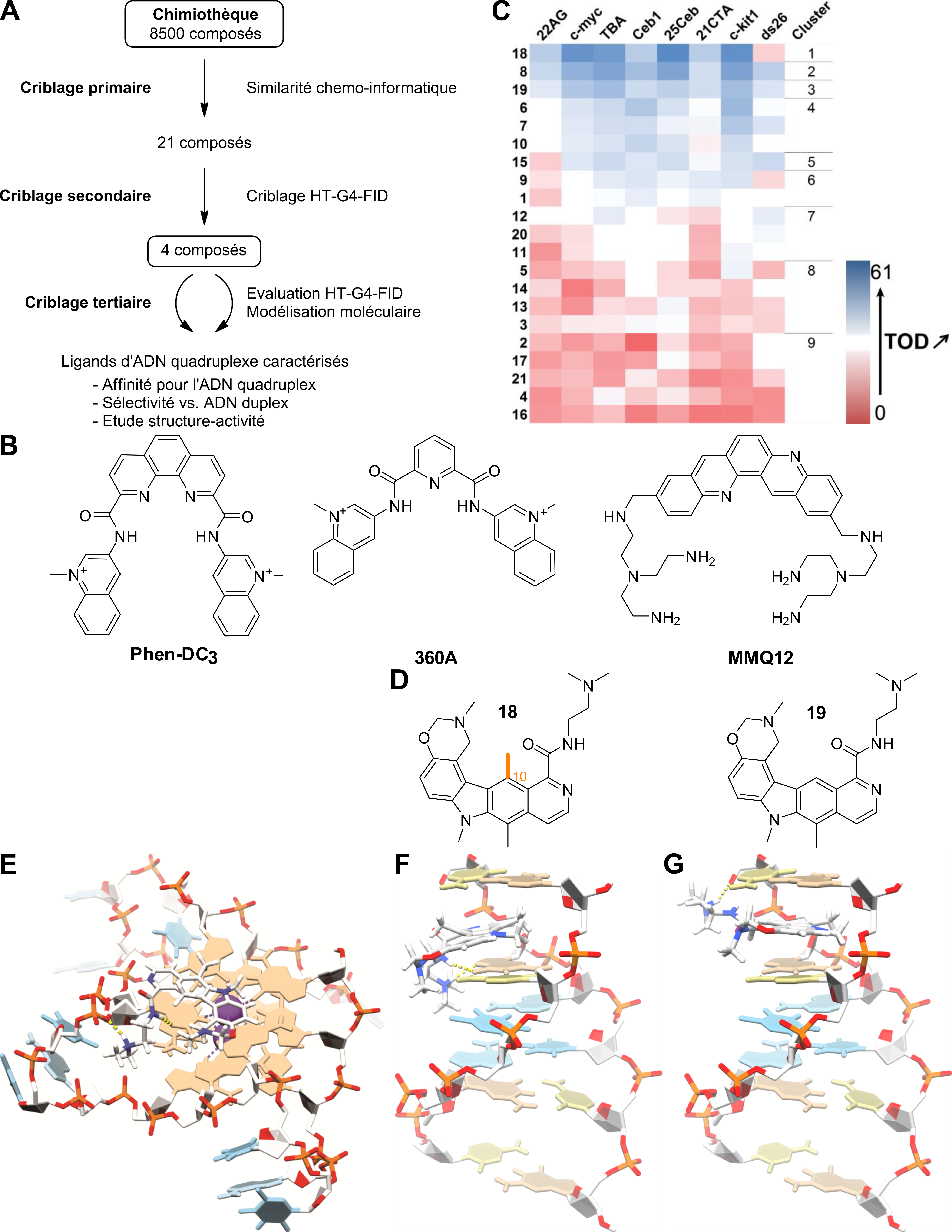 La première étape a permis la sélection des candidats les plus prometteurs par des méthodes chimio-informatiques, en particulier des calculs de similarité moléculaire avec des ligands de référence (PhenDC3, 360A, MMQ12 ; Figure 1.25B). Les molécules retenues ont été évaluées par HT-G4-FID contre divers G4s et un duplex contrôle (Figure 1.25C). La compréhension de la relation structure/activité de ces quatre ligands ellipticines (Figure 1.25D) s’est également appuyée sur des expériences de docking (Figure 1.25E). Nous avons ainsi mis en évidence que seul le ligand ayant un groupe méthyle en position 10 était sélectif contre l’ADN duplex, car il entraîne une perte de planéité de la molécule, ce qui en fait un mauvais intercalant (Figure 1.25D,F).