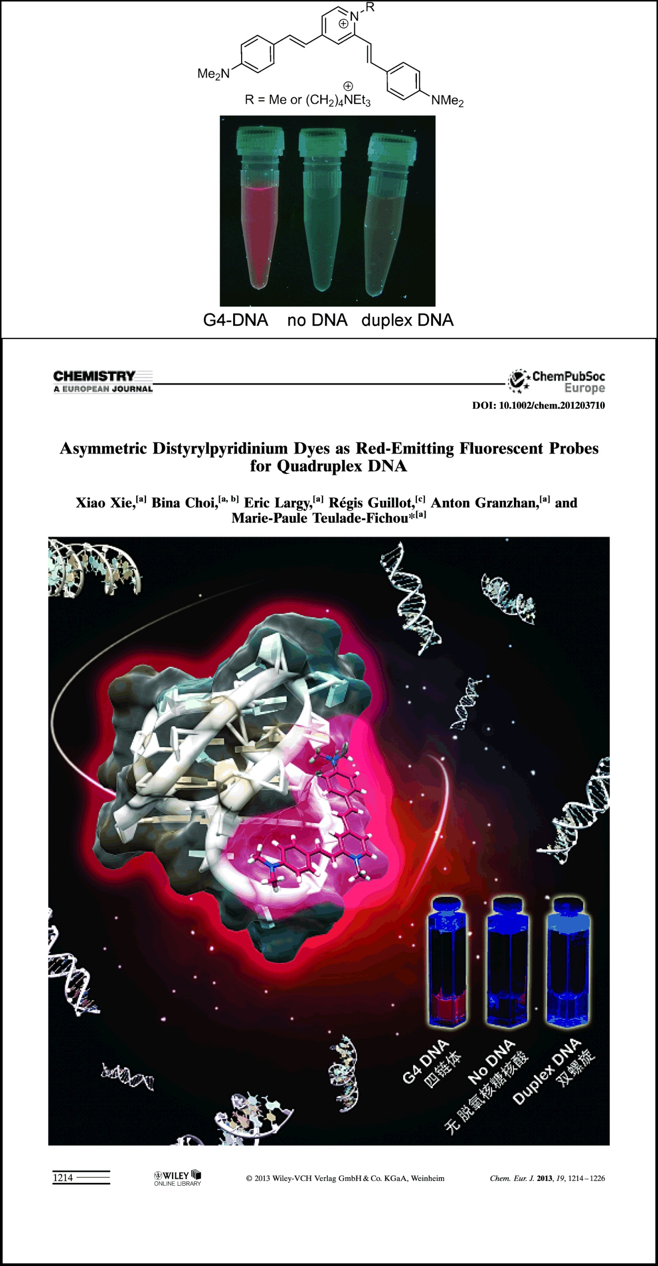 Ces dérivés interagissent sélectivement avec l’ADN G4 et ont une forte émission de fluorescence dans le rouge lorsqu’elles sont complexées (sonde fluorescentes off/on). Leur sélectivité optique, ils sont plus de 100 fois plus fluorescent en présence de G4 qu’en absence d’ADN, ou en présence d’ADN duplex, a été mise en lumière par des titrations fluorimétriques.