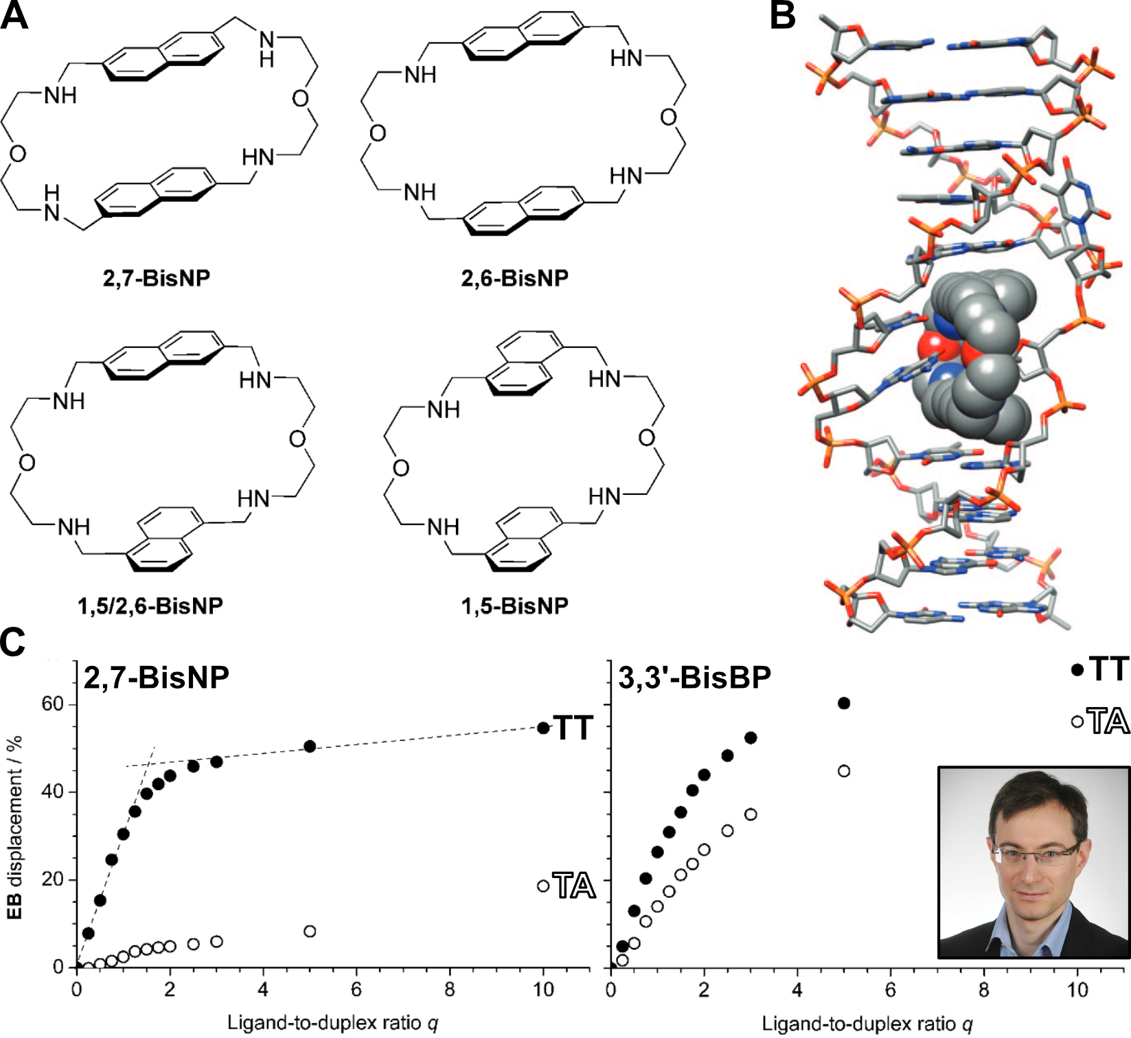 Anton Granzhan avait préparé une série de 20 bis-intercalants macrocycliques lors de son séjour postdoctoral au laboratoire (il y est finalement revenu comme chargé de recherche CNRS, avant de rejoindre l’UMR 8601 de l’Université Paris Cité en 2025) (Figure 1.26A). J’ai été chargé après son départ d’étudier leurs interactions avec des doubles hélices d’ADN, contenant un résidu de thymine mésapparié (TX ; Figure 1.26B) ou correctement apparié (TA), par FID (Figure 1.26C) [95]. L’EtBr a été utilisé comme intercalant plutôt que le TO car il est plus adapté à l’ADN duplex [85].