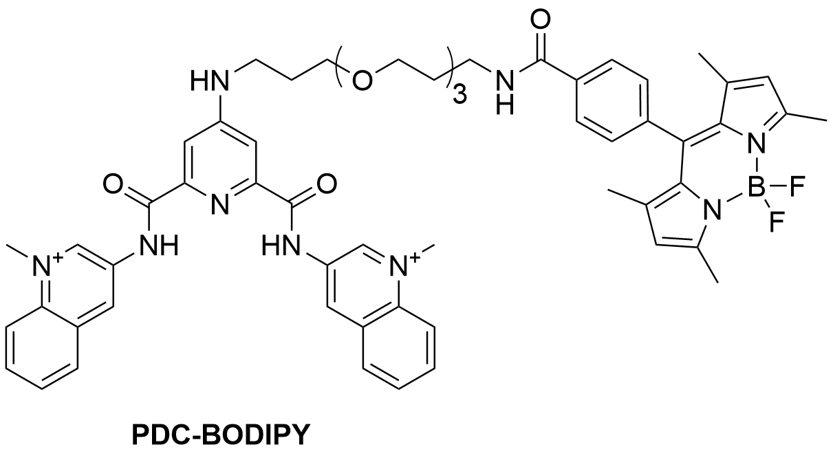 PDC-BODIPY et PDC-L-TO sont deux dérivés de 360A, qui possède une grande affinité et une grande sélectivité pour les G4 [57, 89, 115]. Nous avons vu ci-dessus que a fonctionnalisation de 360A sur sa pyridine ne perturbe pas de manière significative son affinité pour les G4s (Section 1.4.1.3.4), ce qui est confirmé par l’excellente OS de PDC-BODIPY. En revanche, le TO peut se lier avec les G4s et les duplexes - ce qui diminue sensiblement la sélectivité de PDC-L-TO, mais ne fluoresce que lorsqu’il est lié ce qui lui donne un meilleur rapport signal-sur-bruit de fond (SBR).