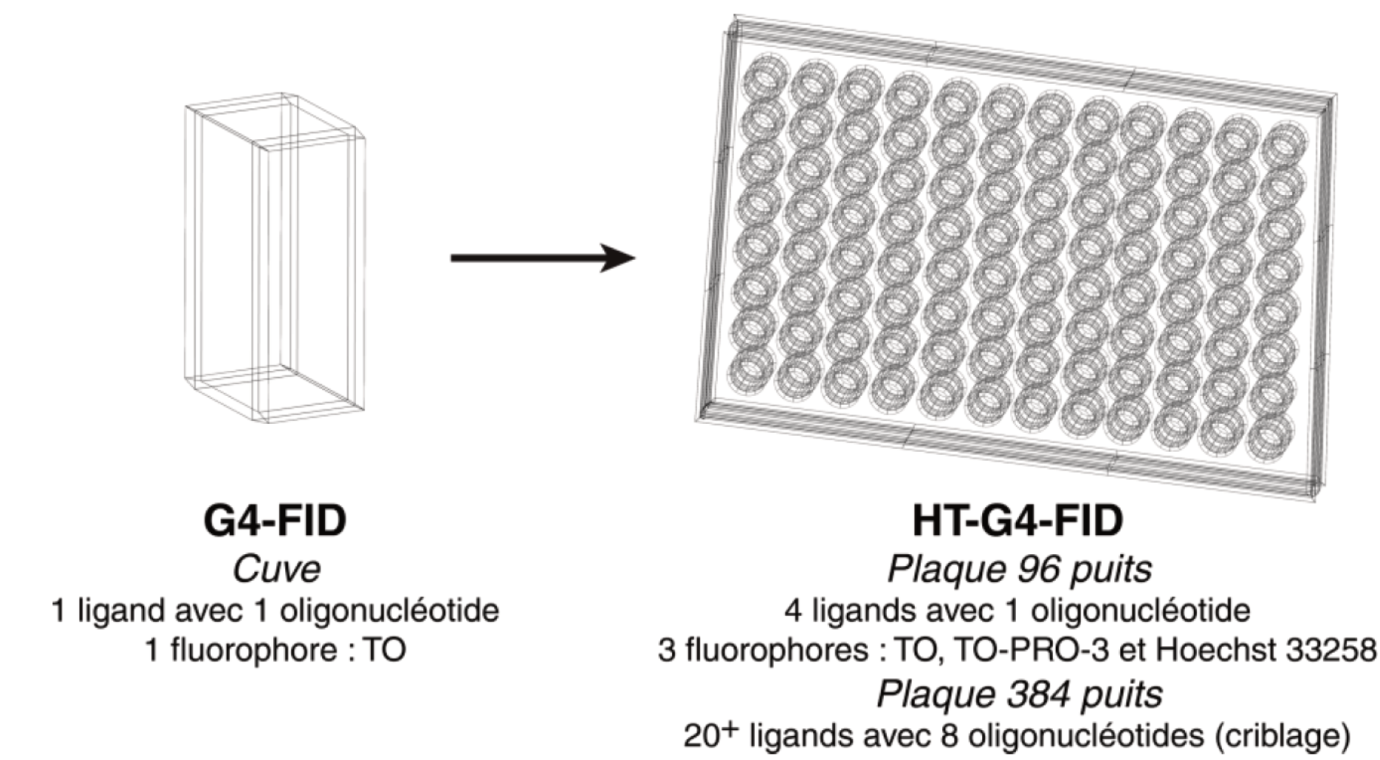 Après avoir utilisé la méthode telle que mise au point par David Monchaud (avec le TO), ou dans la version de Dale Boger (avec l’EtBr ; Section 1.4.1.3.1), en cuvettes, j’ai souhaité développé une version à haut débit de l’essai, nommée HT-G4-FID (High-Throughput Quadruplex Fluorescent Intercalator Displacement), qui est réalisé dans des microplaques à 96 ou 384 puits (Figure 1.22) [89, 90]. En effet, la réalisation du test en cuve implique une acquisition point par point des titrations, avec agitation manuelle de la cuve, et cela pour chaque couple G4/ligand. L’utilisation de plaques permet de réaliser plusieurs titrations entières en parallèle, et ouvre la porte à l’automatisation des opérations de pipetage, ce que j’ai mis en œuvre ultérieurement (Section 1.4.1.2.2).
