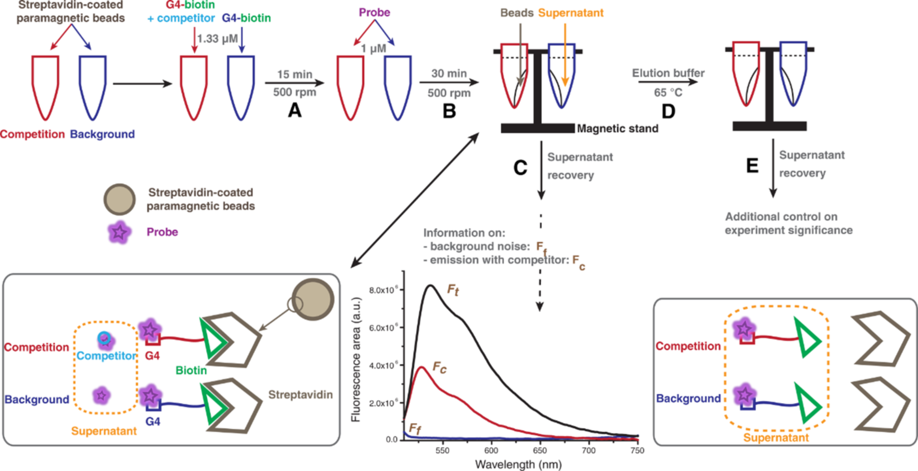 La cible G4 biotinylée est d’abord mélangée ou non à ces compétiteurs (Figure 1.30A). Après incubation en présence du ligand fluorescent (Figure 1.30B), le G4 est immobilisé sur des billes magnétiques couvertes de streptavidine et le surnageant est récupéré (Figure 1.30C). On compare alors l’intensité de fluorescence du ligand en présence de G4 seul, avec celle venant d’une interaction avec le compétiteur (mesure de la sélectivité optique : surnageant du tube bleu dans la Figure 14) et lorsque le ligand est non lié (mesure du rapport signal-sur-bruit : surnageant du tube rouge). J’ai encadré une étudiante d’IUT, Margaux Legrand, lors de cette étude.