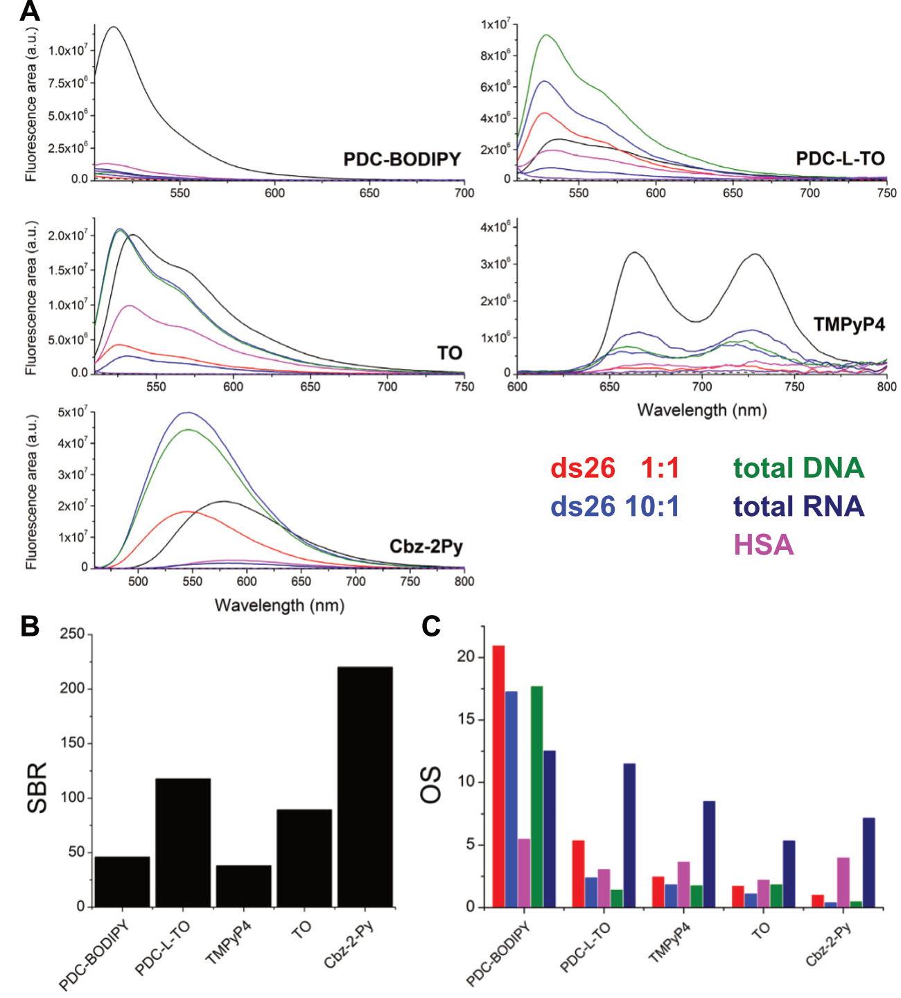 Comme nous l’avons vu ci-avant, je me suis beaucoup intéressé aux ligands fluorescents de G4 [84]. Cela m’a amené à concevoir une méthode originale, G4-POSCA, qui ne s’intéresse pas à proprement parlé à la sélectivité de petites molécules pour les G4s, mais de leur sélectivité optique (OS), c’est-à-dire de leur capacité à révéler la présence de G4s par fluorescence en présence d’autres cibles ‘compétitrices’ [78]. Un des grands avantages de cette méthode est d’ailleurs de pouvoir utiliser n’importe quel compétiteur, sans modification nécessaire, ici : différents excès de duplex, d’ADN total, d’ARN total, de protéine (la HSA) et même un autre G4.