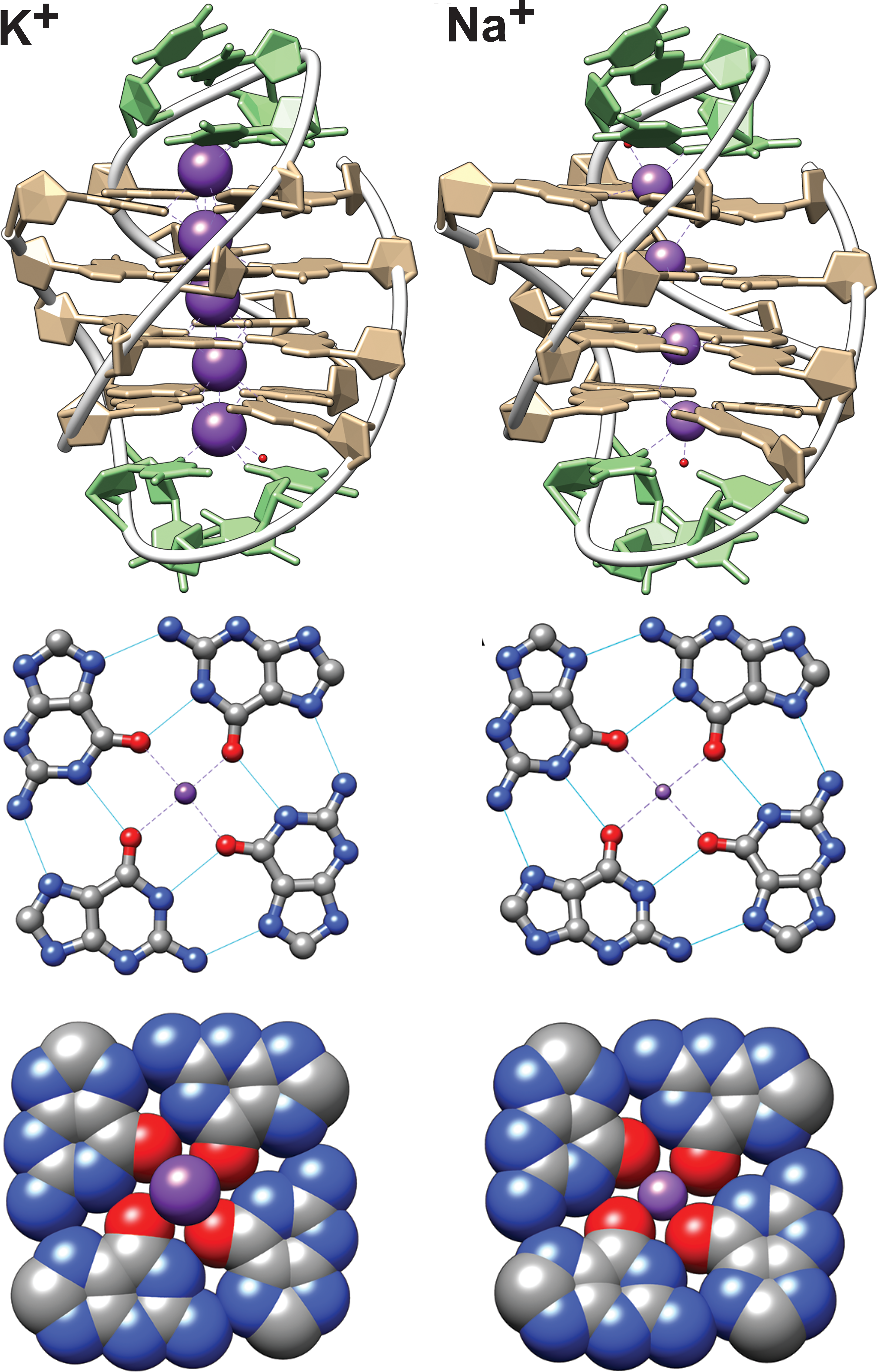 Les G4 sont formés par un empilement d’au moins deux G-quartets, également appelés G-tétrades (Figure 1.3A). Une tétrade est elle-même composée de quatre guanines associées par huit liaisons hydrogène sur leurs faces de Watson-Crick et de Hoogsteen. Un cation métallique (typiquement K+ ou Na+) est coordonné par le O6 de huit guanines appartenant à deux tétrades G empilées consécutivement (Figure 1.4) [10]. Par conséquent, un G-quadruplex contenant n G-quartets coordonne généralement \(n-1\) cations. Le rayon ionique influence grandement la capacité d’un cation à promouvoir la formation des G-quadruplexes, ce que j’exporerai plus tard dans mon parcours (Section 3.2) [10–13].