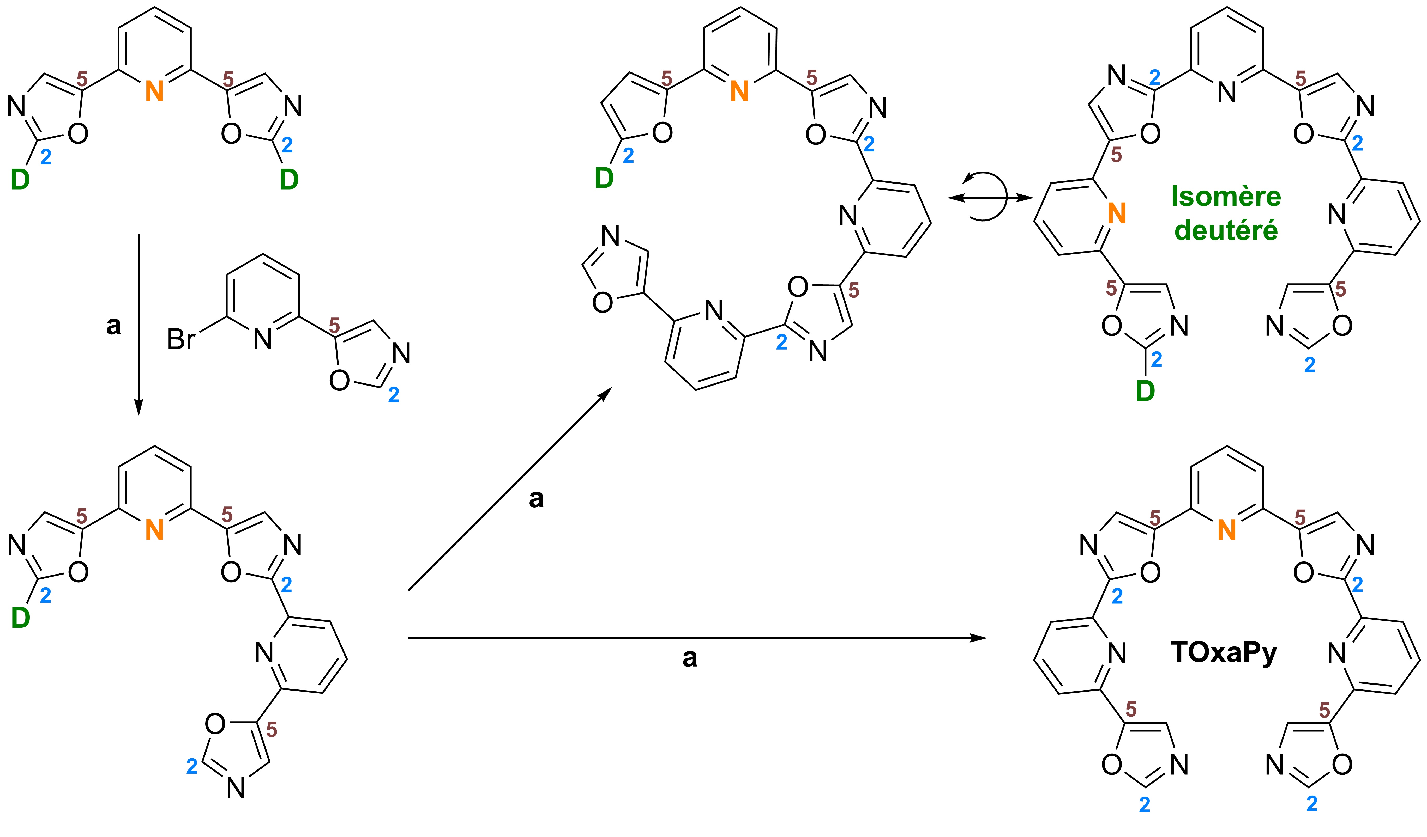 Nous nous satisfaisons de l’analyse en masse qui confirme l’obtention de TOxaPy. Cependant, un reviewer remarque, fort justement, qu’après la première condensation de 2-bromo-5-(pyridine-2-yl)oxazole, la seconde peut avoir lieu soit sur l’oxazole symétriquement opposé au premier site de condensation, soit sur l’oxazole qui vient d’être introduit (Figure 1.13). Cela produit un isomère géométrique de même masse, ne différant que par une jonction pyridine-oxazole. Nous avons confirmé la clairvoyance du reviewer par analyse LC et MS à partir de la 2,6-bis(oxazol-5-yl)pyridine deutérée sur les positions 2 des oxazoles : il y avait bien deux isomères en proportions 50/50 !