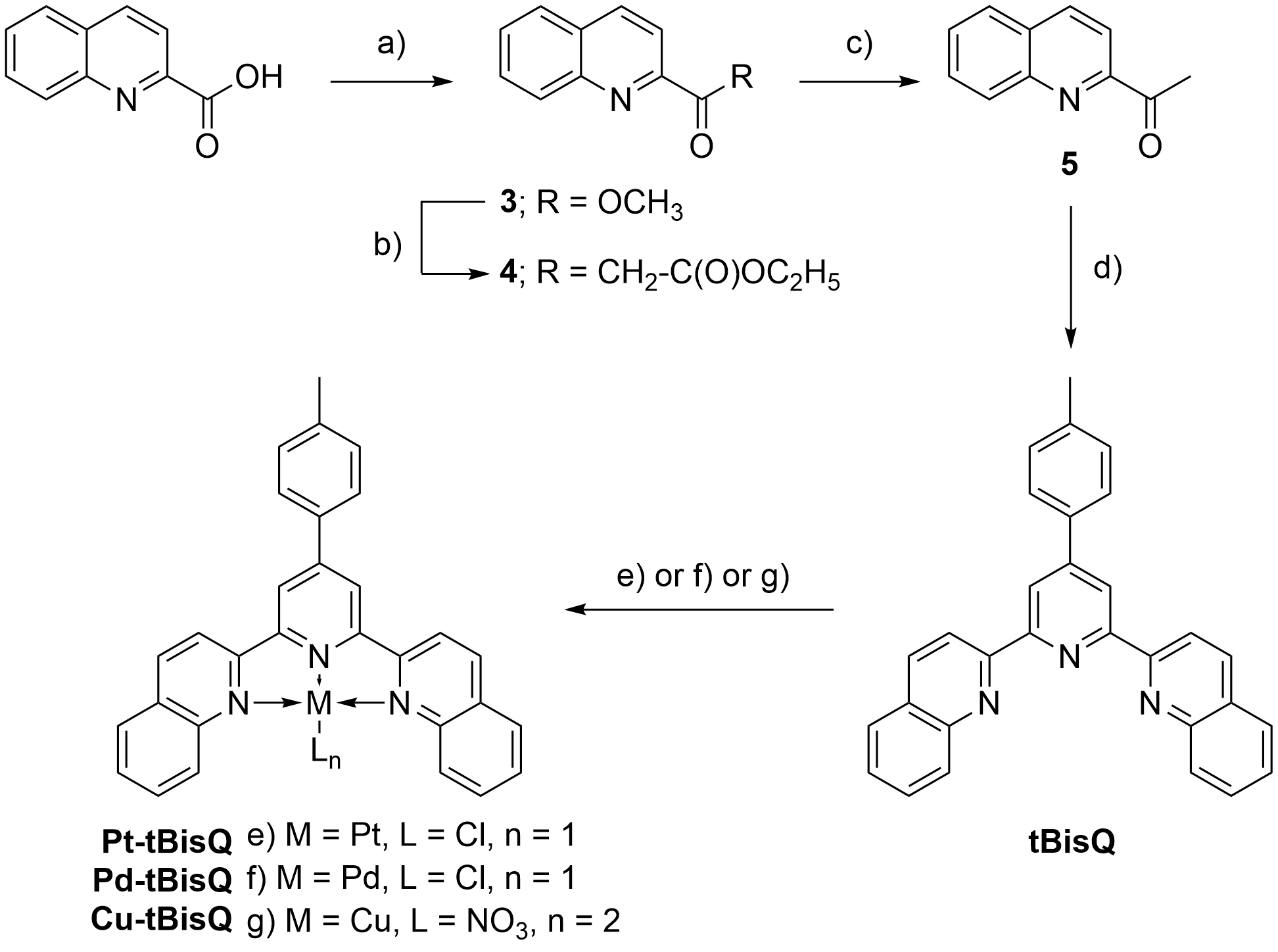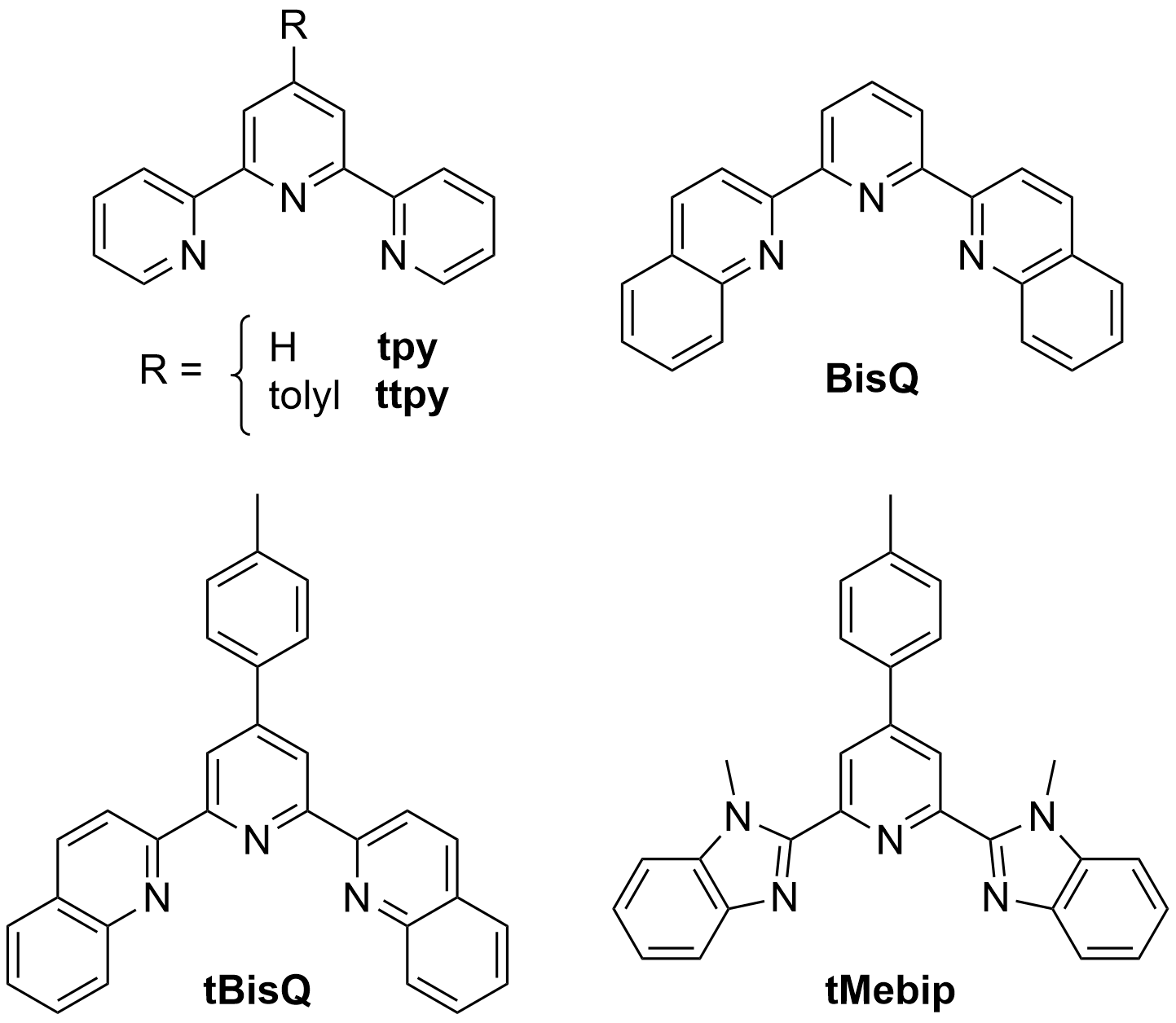 Une série de ligands hétérocycliques, azotés, tridendates commerciaux (terpyridine, tolylterpyridine) ou que j’ai synthétisés (BisQ, tBisQ, tMebip ; Figure 1.7) a été utilisée pour obtenir quinze complexes de palladium (II), platine (II) et cuivre (II) [62]. La synthèse de BisQ a déjà été décrite au laboratoire [52], en revanche celles de tBisQ et tMebip sont originales.