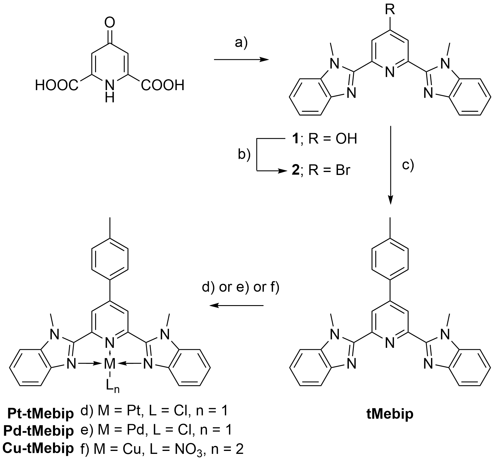 Le tMebip a été préparé en trois étapes à partir de l’acide chélidamique, avec un rendement global de 45% (Figure 1.9). La formation des benzimidazoles a été obtenue par cyclisation thermique de l’acide chélidamique et de la N-méthyl-1,2-phénylènediamine en présence d’acide polyphosphorique, qui a été utilisé comme solvant [64]. La position 4 de la pyridine a ensuite été bromée par l’oxybromure de phosphore [65], ce qui a permis d’introduire le groupe tolyle par un couplage de Suzuki [66]. Le produit final a été facilement obtenu car il précipite à température ambiante dans le mélange THF/eau utilisé comme solvant. Cette synthèse a être réalisée à l’échelle du gramme et nécessite peu d’étapes de purification.