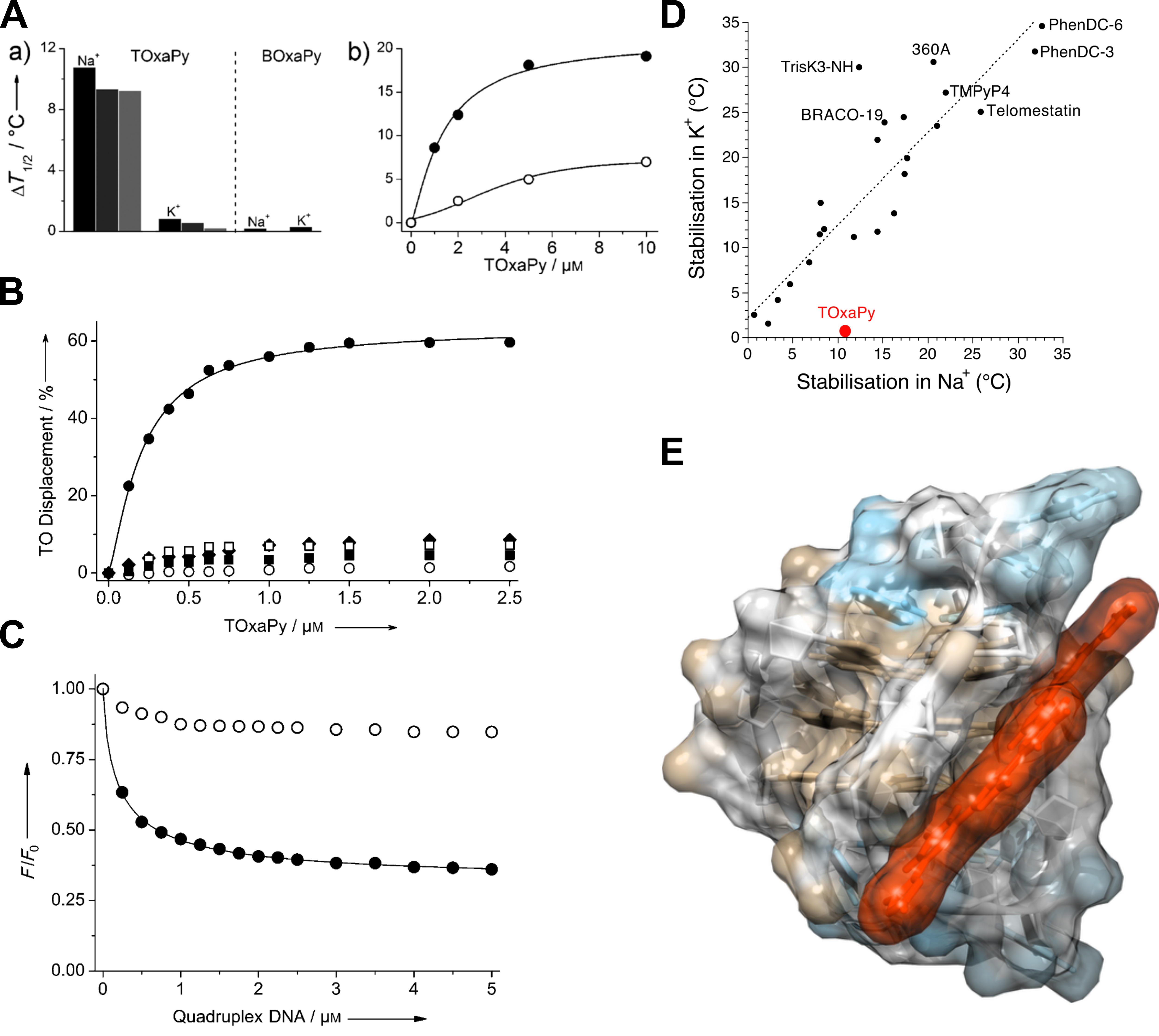On notera que, contrairement à la télomestatine, TOxaPy n’est pas un macrocyle. Malgré cela, il est présenté dans la publication (et ici) sous forme circulaire, sans doute pour ressembler à une télomestatine à laquelle il manquerait un hétérocycle. Cela induit un biais de communication visuel important, puisqu’il suggère au lecteur que ces molécules interagissent avec les G4s de façon similaire. Or, les expériences de G4-FID (Figure 1.15B), qui confirment l’absence d’interaction de TOxaPy avec les G4s télomériques en solution K+, suggèrent que la sélectivité de ce ligand s’explique par son interaction dans les sillons de G4, plutôt que par \(\pi\)-stacking sur les G-quartets. En effet, TOxaPy ne déplace que partiellement le thiazole orange, ce qui est cohérent avec une interaction n’ayant pas lieu sur les tétrades. L’interaction dans les sillons est possible, comme mis en évidence par docking par Nicolas Saettel, alors maître de conférences dans l’équipe, sans que cela ne présente une preuve formelle (Figure 1.15E).