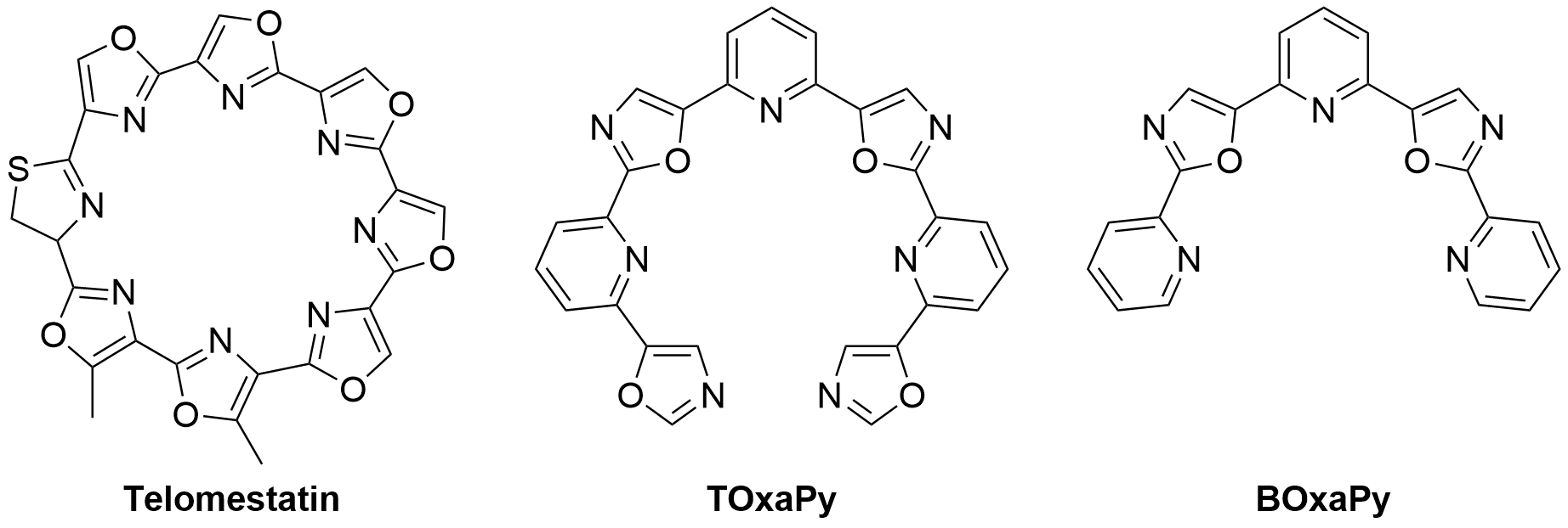 Dans l’optique de potentielles applications thérapeutiques, les ligands de G4 doivent présenter une forte affinité pour le G4 ciblé, combinée à une faible association avec l’ADN duplex. Parmi la pléthore de ligands déjà publiés au début de ma thèse, le premier à avoir répondu à ces critères est la télomestatine, un macrocycle naturel à base d’oxazole (Figure 1.11) [72]. La télomestatine est neutre, ce qui la différencie de la grande majorité des ligands de G4, qui présentent des squelettes aromatiques fusionnés avec des charges cationiques. Sa forme macrocyclique est suspectée d’être le déterminant principal de son interaction avec les G4s et de son absence d’affinité pour l’ADN duplex. Pour répondre à cette question importante dans l’établissement des règles de reconnaissance des G4s, nous avons synthétisé de nouveaux ligands neutres, mais non macrocycliques, à base de motifs oxazole et pyridine alternés (Figure 3A) [73, 74].