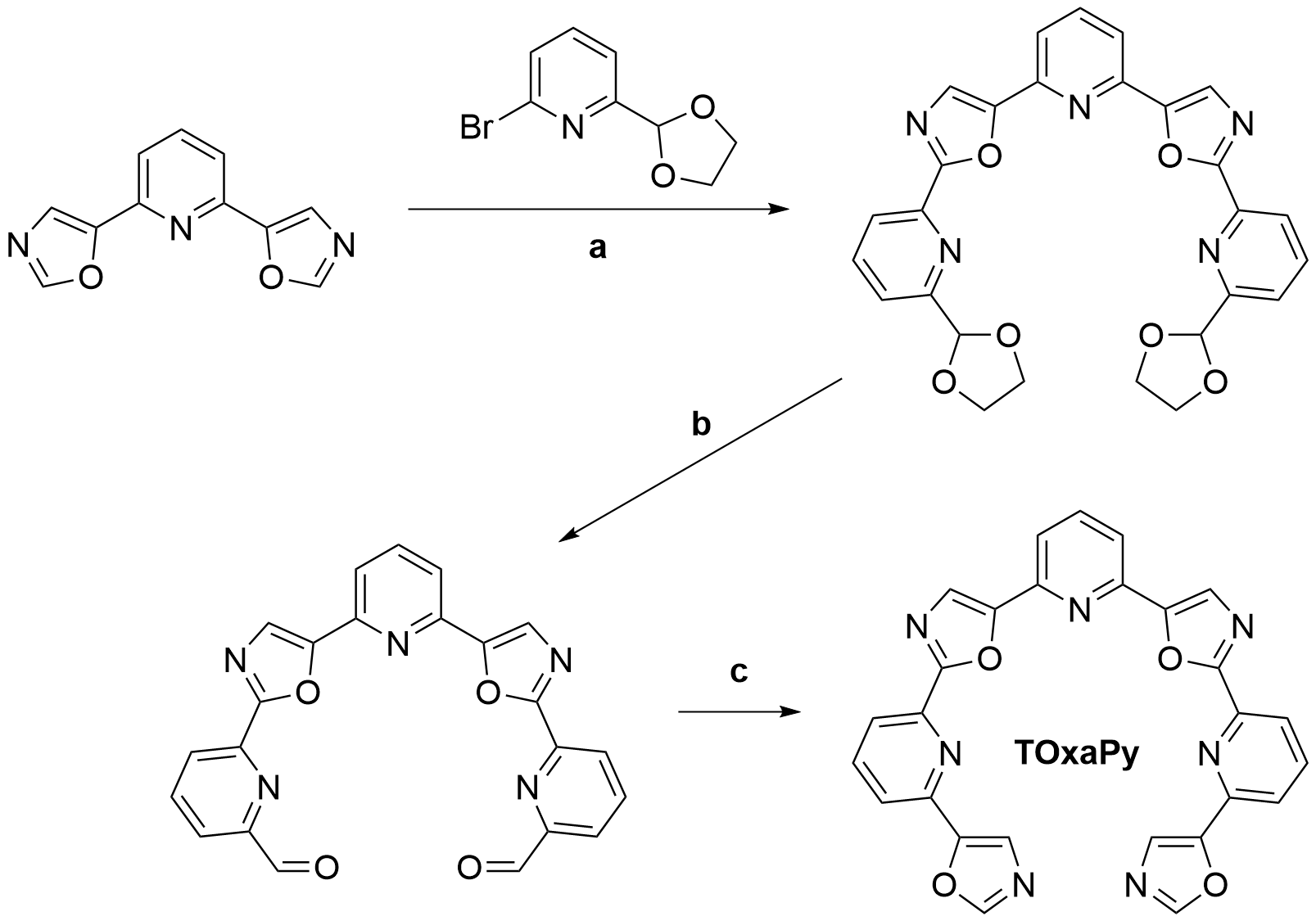 Pour obtenir le TOxaPy sans ambiguïté, Florian Hamon et moi avons suivi une nouvelle voie dans laquelle des groupements oxazoles terminaux ont été synthétisés à partir d’intermédiaire bisformyle pentacyclique correspondants (Figure 1.14). Dans cette approche, la 2,6-bis(oxazol-5-yl)pyridine a été couplé à la 2-bromo-6-(1,3-dioxolan-2-yl)pyridine pour obtenir le précurseur bisacétal qui, après déprotection puis traitement au TosMIC (isocyanure de p-toluènesulfonylméthyl) à produit TOxaPy avec un rendement global de 19%.
