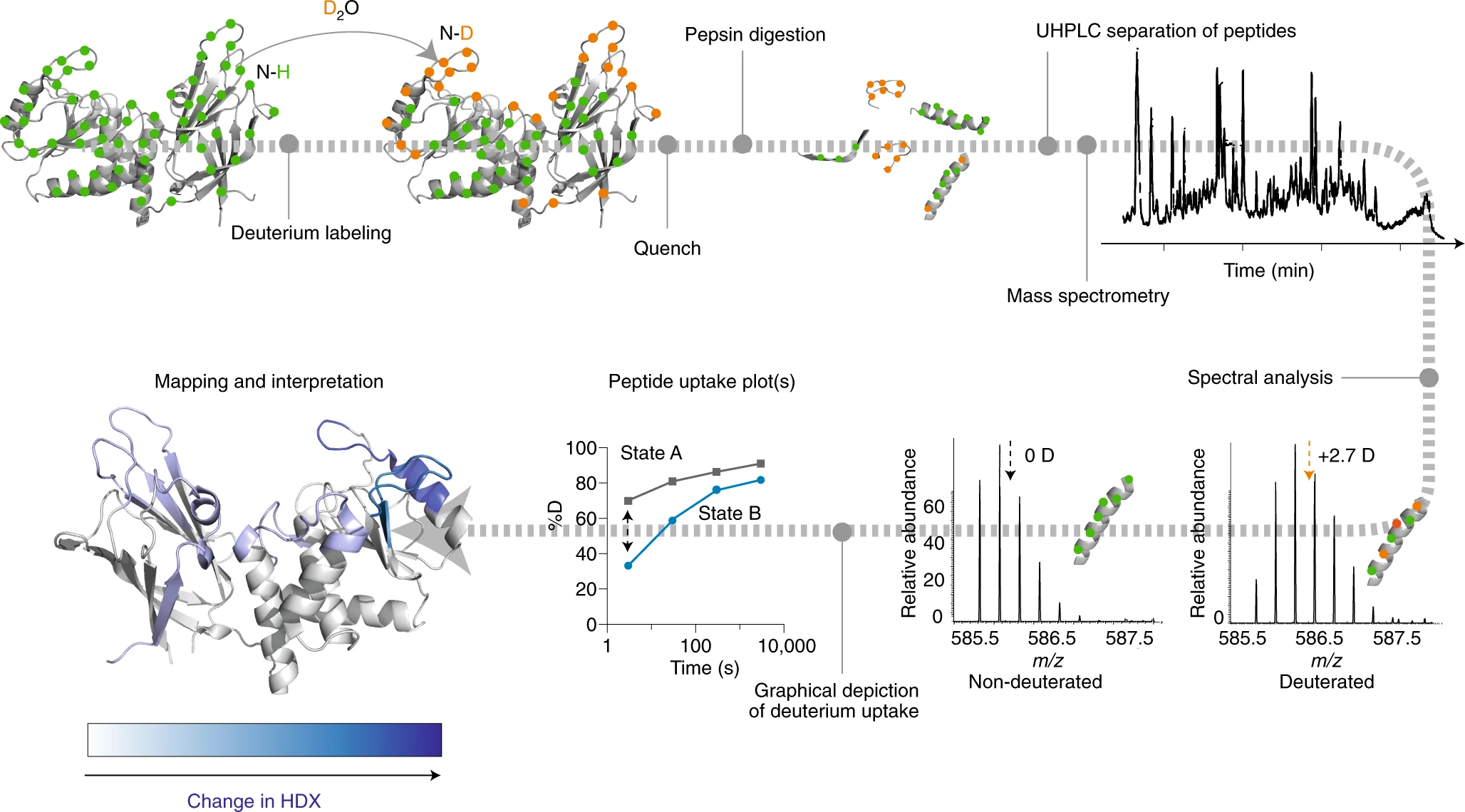 Lors de ma dernière année en poste, mes activités se sont centrées sur l’analyse de structures et interactions de protéines thérapeutiques par échange hydrogène-deutérium couplé à la spectrométrie de masse (HDX/MS). L’HDX repose sur la mesure des cinétiques d’échange des protons amides peptidiques par des deutérons du solvant, qui varient très fortement en fonction de leur structuration [21]. L’échange est ralenti en cas de formation de liaisons hydrogène et d’accès réduit du solvant. L’échange est quantifié par spectrométrie de masse en tirant partie de la différence de masse isotopique entre l’hydrogène et le deutérium.