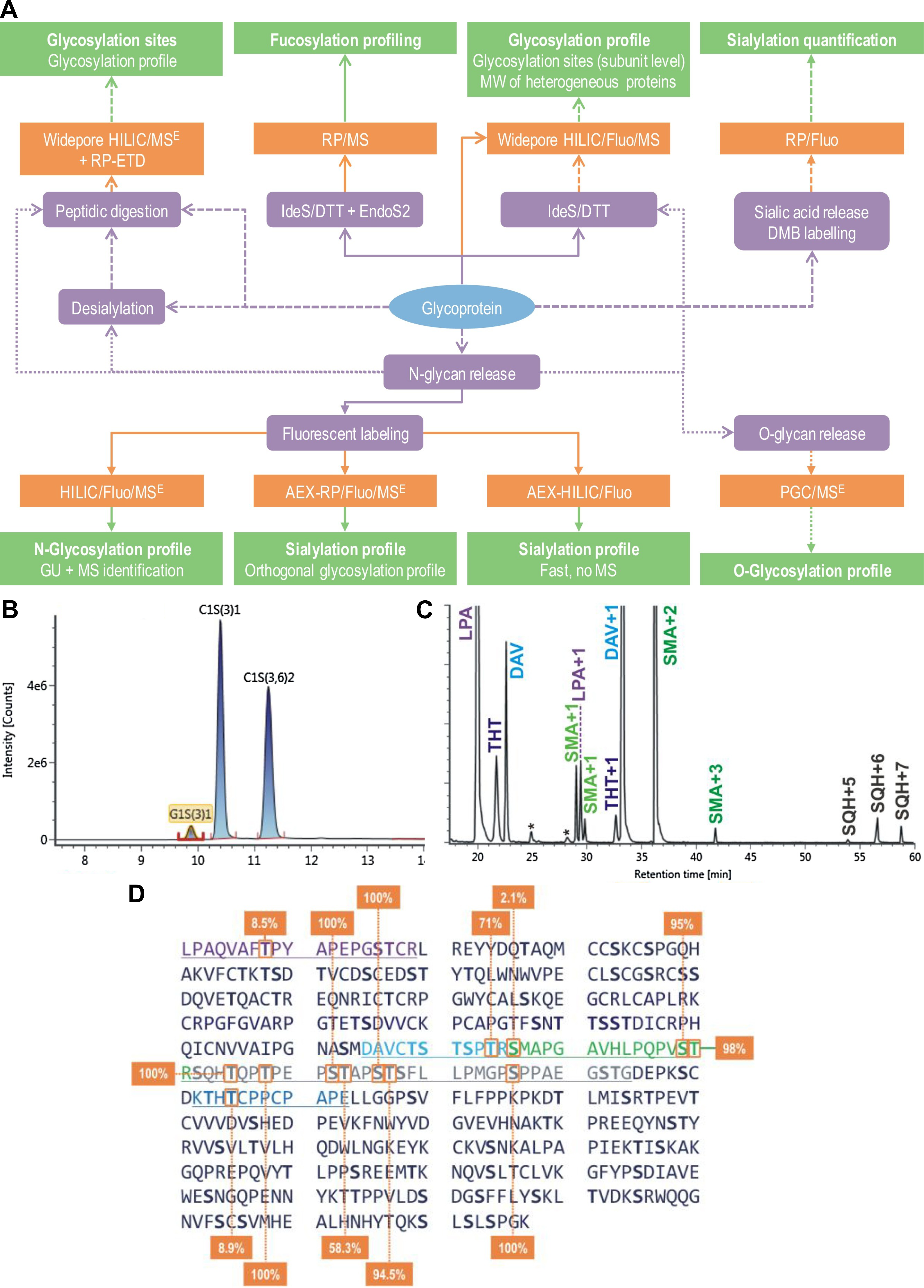 La glycosylation est l’une des modifications post-traductionnelles les plus courantes des protéines et joue un rôle essentiel dans leur fonction, immunogénicité, clairance plasmatique et résistance aux protéases [10]. Par conséquent, le profil de glycosylation des protéines thérapeutiques est considéré comme un attribut de qualité critique, tant pour les innovateurs que pour les biosimilaires, et doit faire l’objet d’une analyse approfondie [11]. Les protéines thérapeutiques sont généralement produites dans différents systèmes d’expression, dont les mécanismes de glycosylation fonctionnent par étapes séquentielles et compétitives, créant ainsi des micro- (nature des glycanes pour un site donné) et macro- (nombre et emplacement des sites) hétérogénéités de glycosylation [4]. En outre, la nature ramifiée des glycans crée un autre niveau de complexité par rapport aux séquences oligonucléotidiques et peptidiques linéaires avec lesquelles j’ai l’habitude de travailler.
