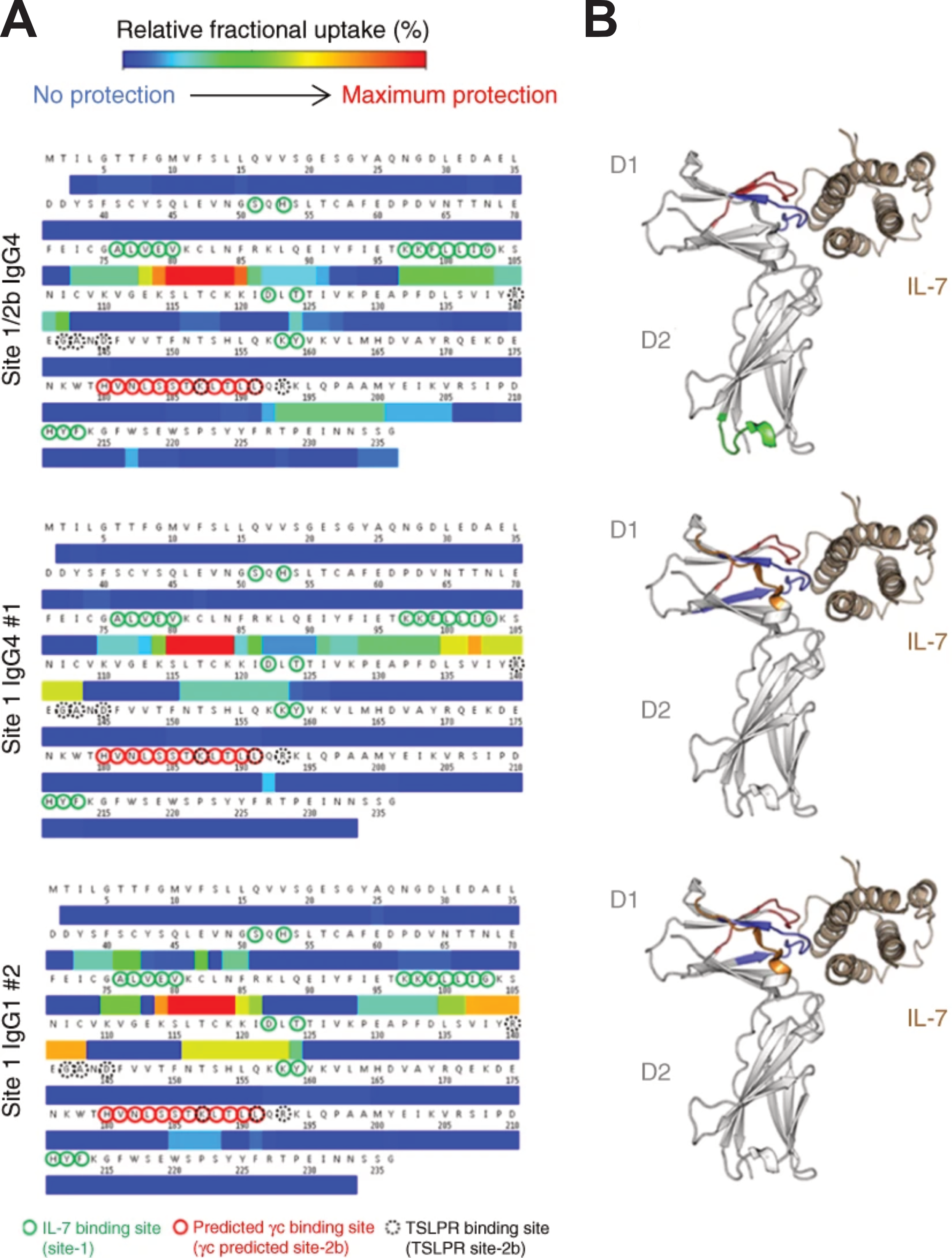 Enfin, j’ai mis en œuvre notre méthode de détermination d’épitope lors d’une collaboration avec l’entreprise Ose Immunotherapeutics (Nantes), qui souhaitait cibler l’expansion des cellules immunitaires « mémoires » pathogènes, comme stratégie thérapeutique prometteuse pour prévenir les attaques auto-immunes chroniques. Dans ce contexte, j’ai déterminé les épitopes de trois nouveaux anticorps monoclonaux anti IL-7R\(\alpha\) par HDX/MS (Figure 4.5) [26]. Grâce à cela, il a été montré que les anticorps liant le domaine d’interaction de l’IL-7 (site-1) ont des propriétés à la fois agonistes et antagonistes, tandis qu’un anticorps liant aussi le domaine d’hétérodimérisation de l’IL-7R\(\alpha\) /\(\gamma\)c (site-2b) présente une activité antagoniste stricte. Une seule injection d’anticorps monoclonaux antagoniste peut induire un contrôle à long terme de l’inflammation cutanée malgré des provocations antigéniques répétées chez des singes présensibilisés.