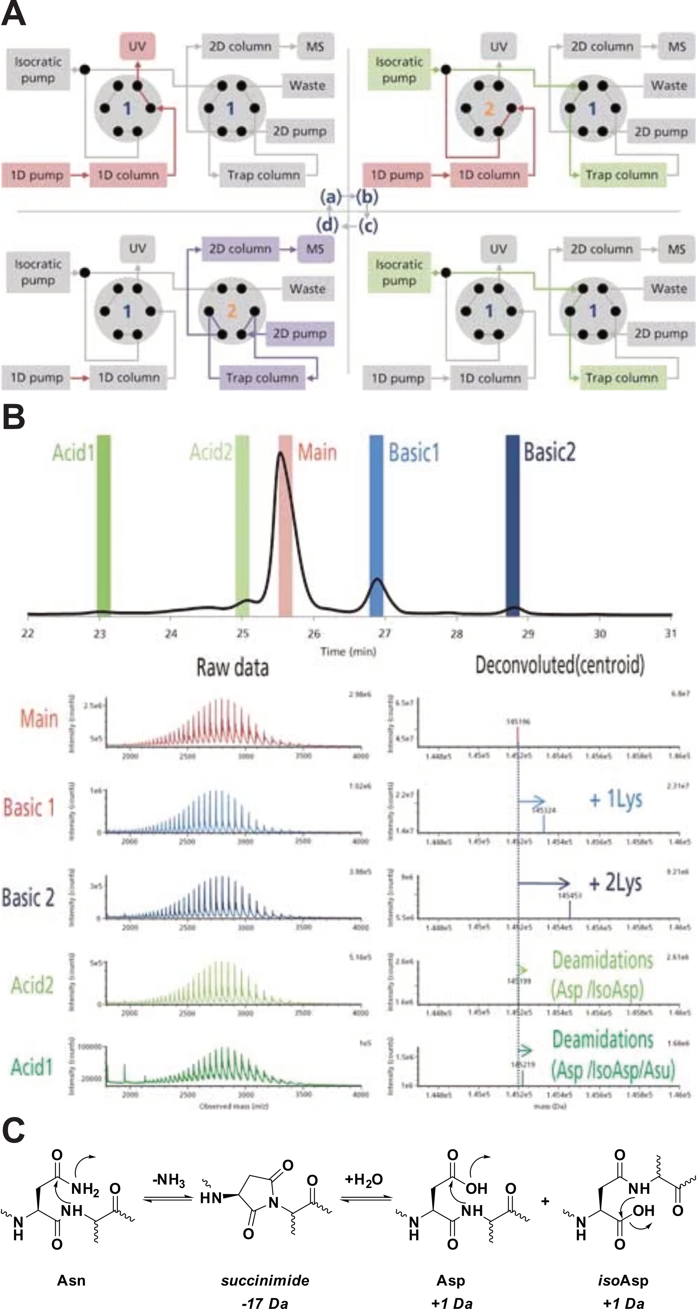 La Figure 4.2B montre l’exemple de l’analyse de variants de charges par couplage IEX-RP/MS, où la combinaisons de ces méthodes apparaît comme particulièrement nécessaire pour identifier des variants de charge. Les variants basiques sont formés suite à la perte de lysines C-terminales, avec une différence de masse assez simple à détecter par MS seule (- 128 Da). En revanche, les variants acides se forment consécutivement à des déamidations de résidus Asn, formant des résidus Asp et isoAsp (Figure 4.2C). La différence de masse entre Asn et Asp/isoAsp est minimale (une unité de masse sur une molécule d’environ 150 kDa !), et la séparation LC est alors très utile. Celle-ci permet aussi de quantifier les différents variants par simple détection UV, étant entendu que les pics ont été initialement identifiés par masse.