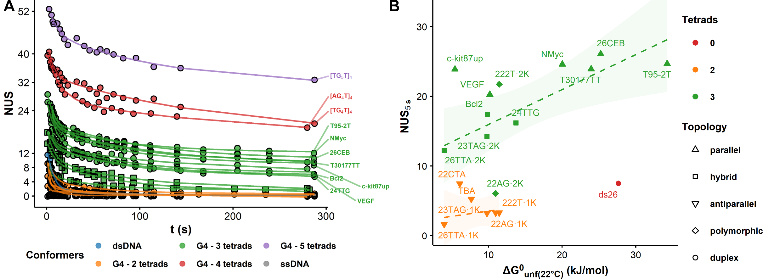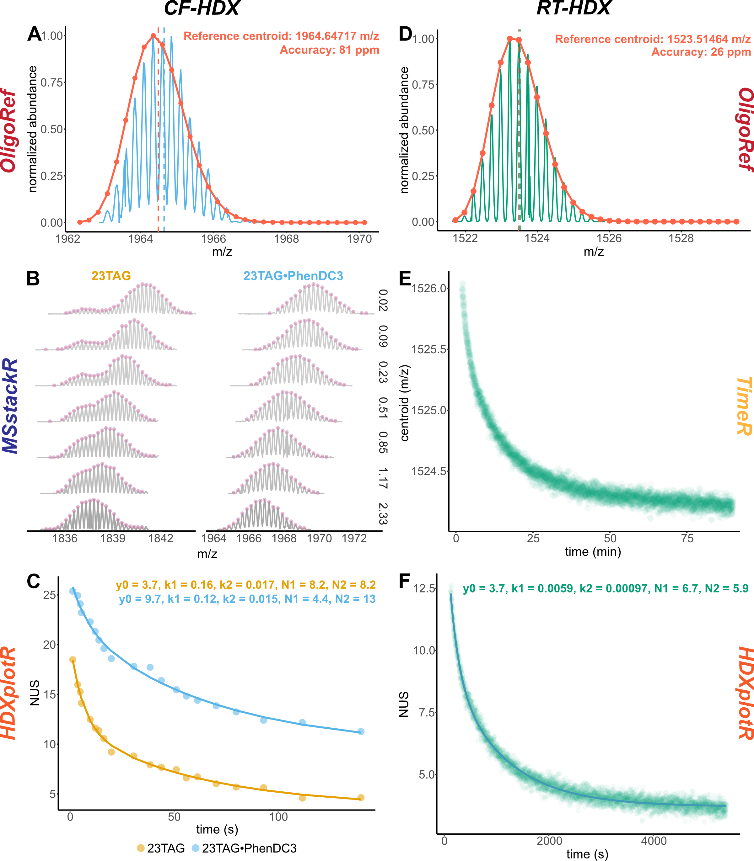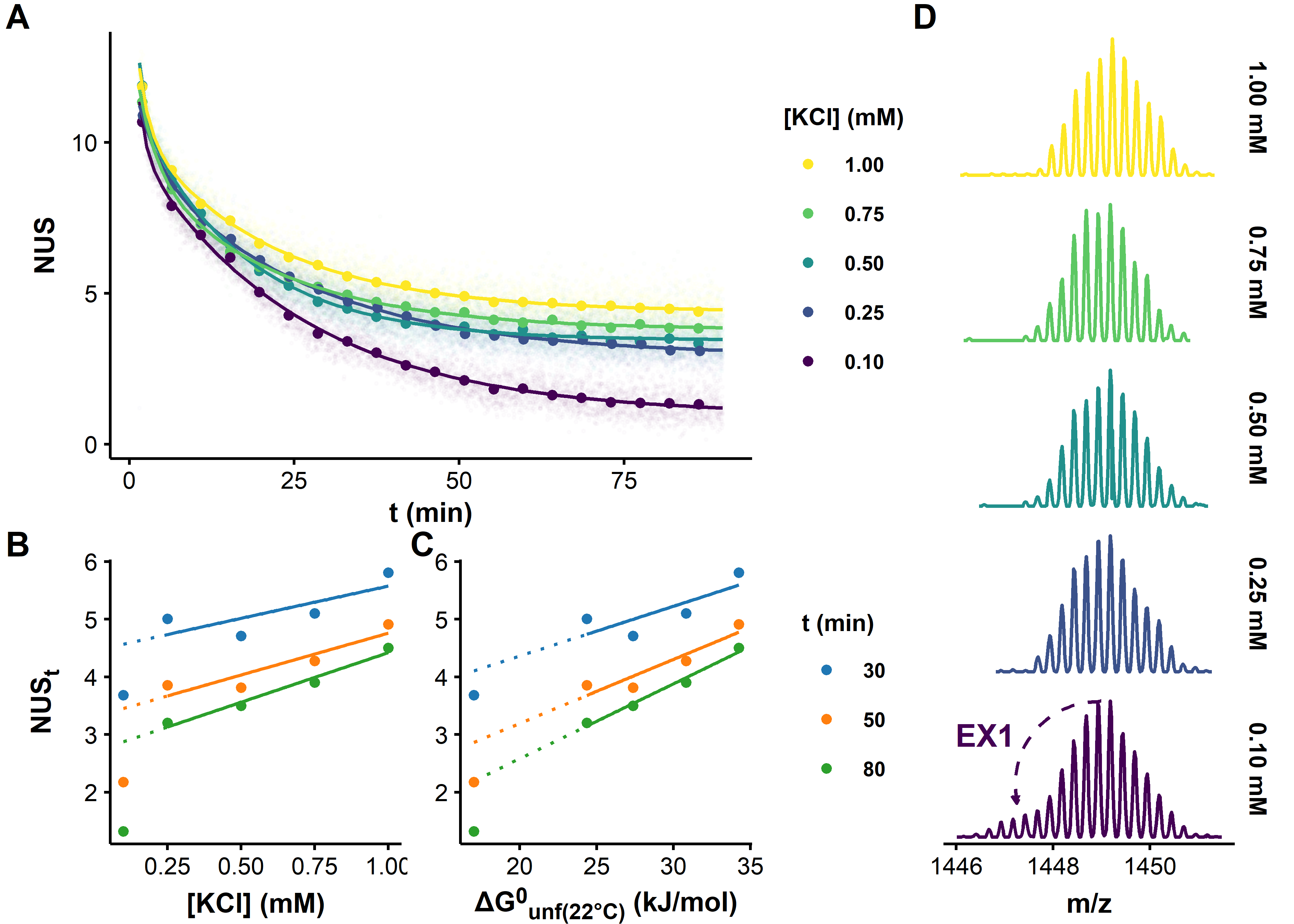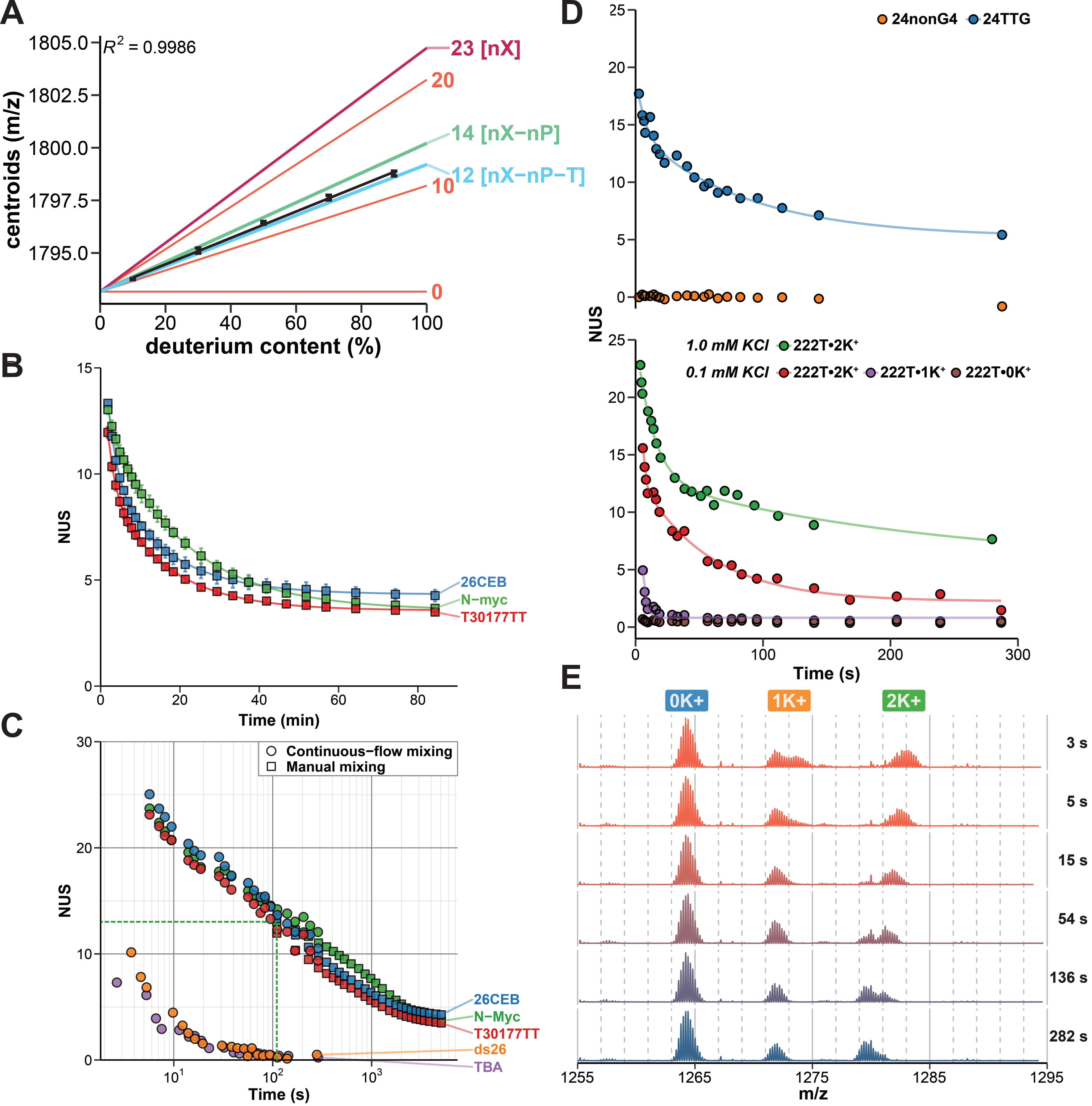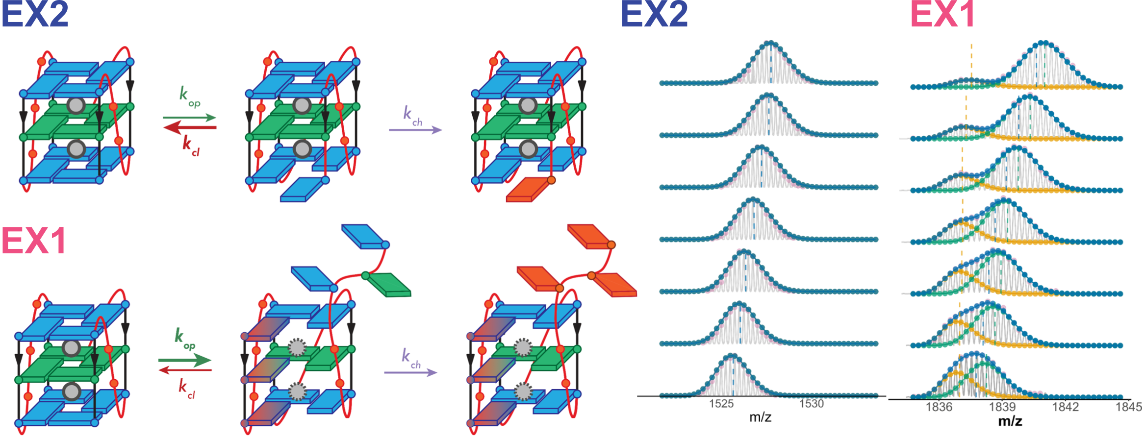 Le couplage à la spectrométrie de masse native permet de mesurer les cinétiques d’échange individuelles de complexes non covalents, pour ceux qui sont séparés en masse (Figure 5.4E). Cela permet l’utilisation de la méthode pour des études biophysiques d’acides nucléiques (Section 5.2.1.2).