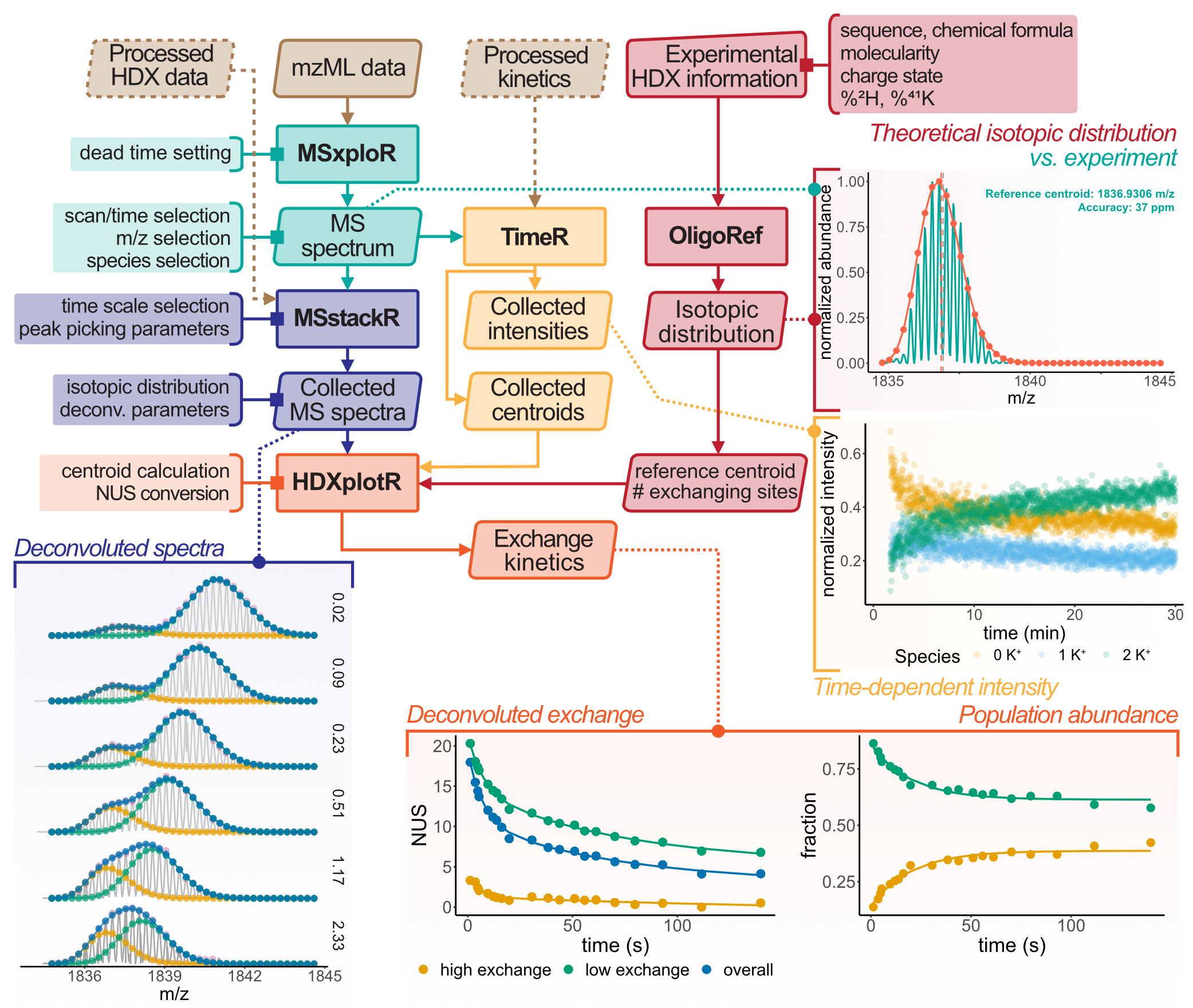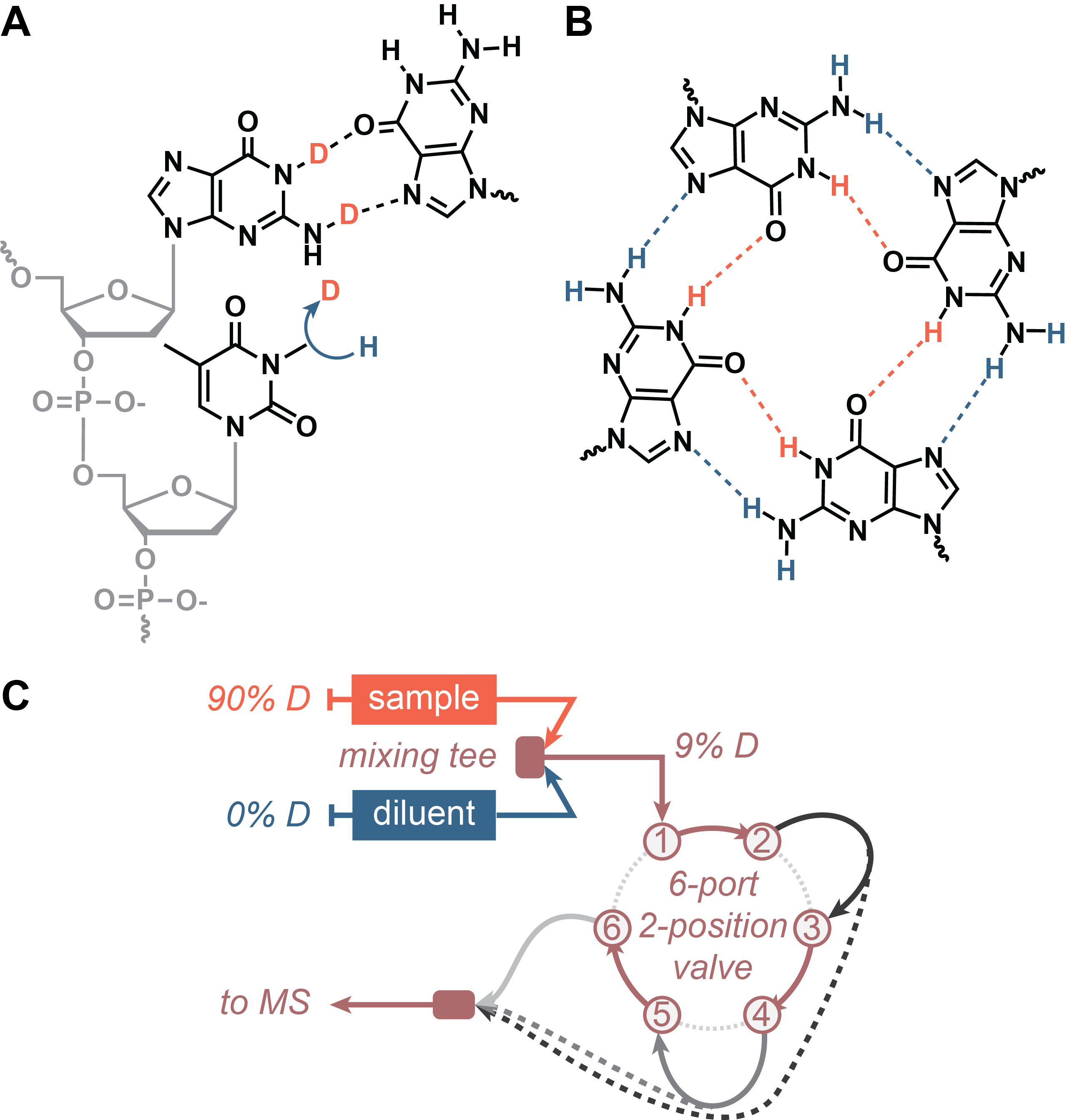 Alors que l’échange hydrogène-deutérium couplé à la spectrométrie de masse (HDX/MS) est relativement répandu pour étudier la dynamique de protéines (voir Section 4.4), il n’était cependant pas exploité pour étudier les acides nucléiques. Lors de ma prise de poste à l’Université de Bordeaux, je me suis attaché à montrer qu’il s’y prête, offrant des perspectives pour explorer les structure et dynamique d’acides nucléiques, et leurs interactions avec des protéines (Figure 5.3) [2].