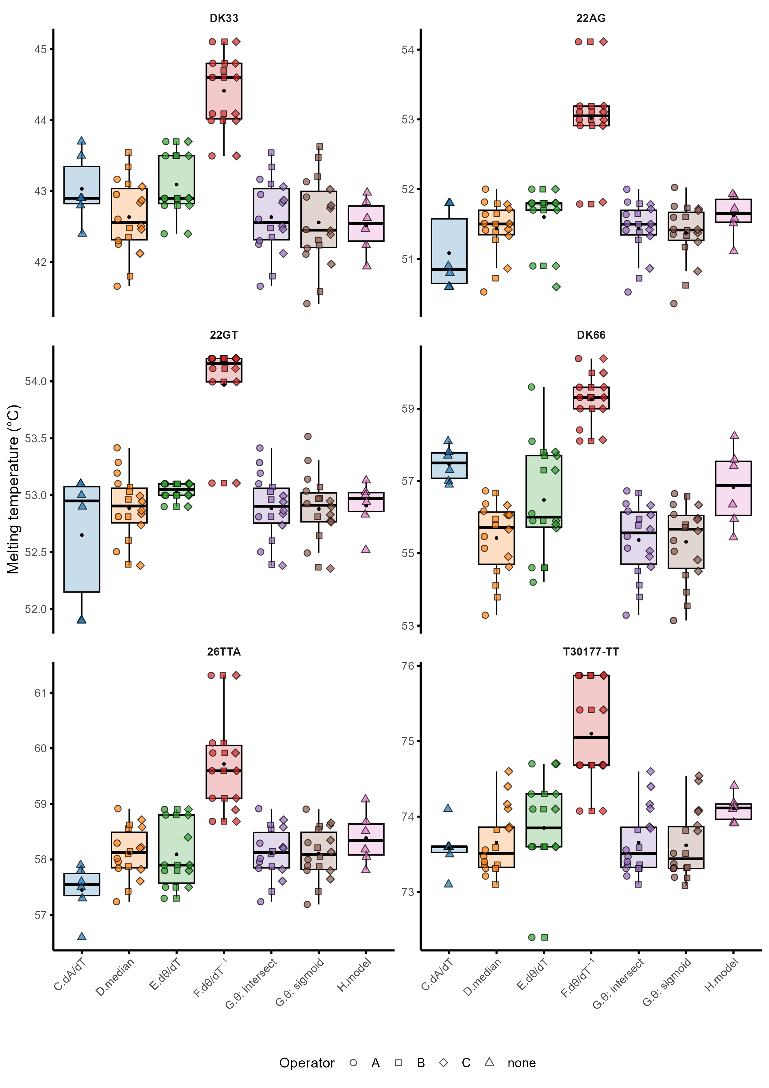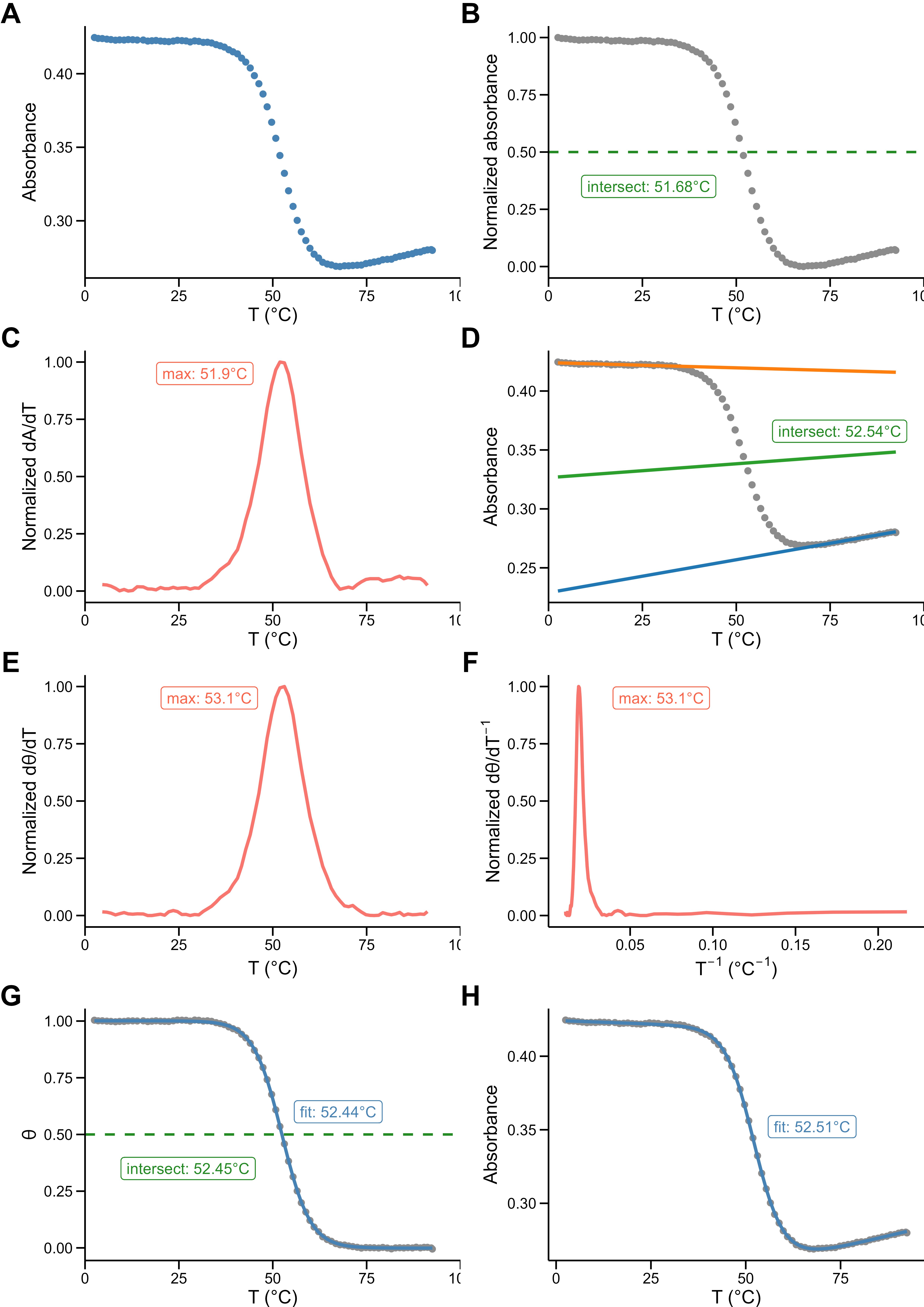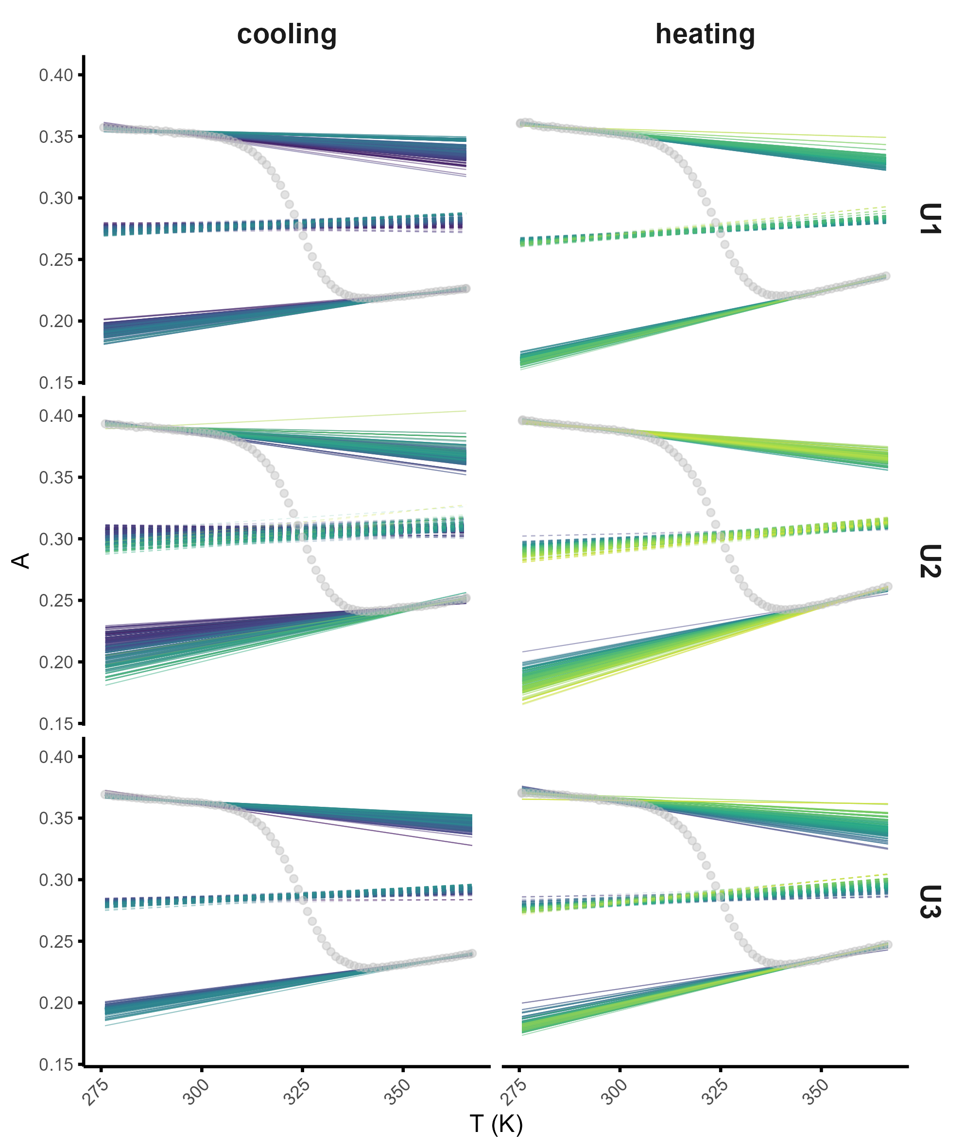 Détermination des fractions structurées et des \(T_m\) à partir des courbes de dénaturation thermique, avec l’Équation 5.9. Il s’agit de l’embryon de ce qui deviendra meltR (Section 5.4.2).