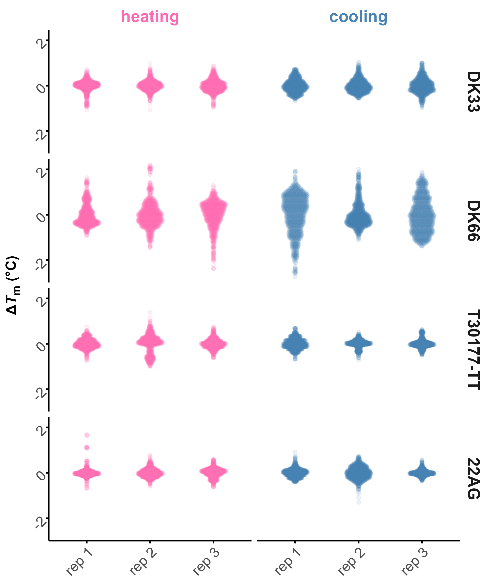 La vitesse d’échange diminue lorsque la stabilité (\(T_m\), \(\Delta G^0\)) d’un G4 augmente, mais elle dépend également de la dynamique conformationnel et de l’éventuel présence de motifs non canoniques (Figures 5.5B et 5.7A-C). Contrairement aux stabilités évaluées par melting, l’HDX/MS a l’avantage d’être une mesure isotherme, sans déplacement de l’équilibre conformationnel dû aux changements de température.