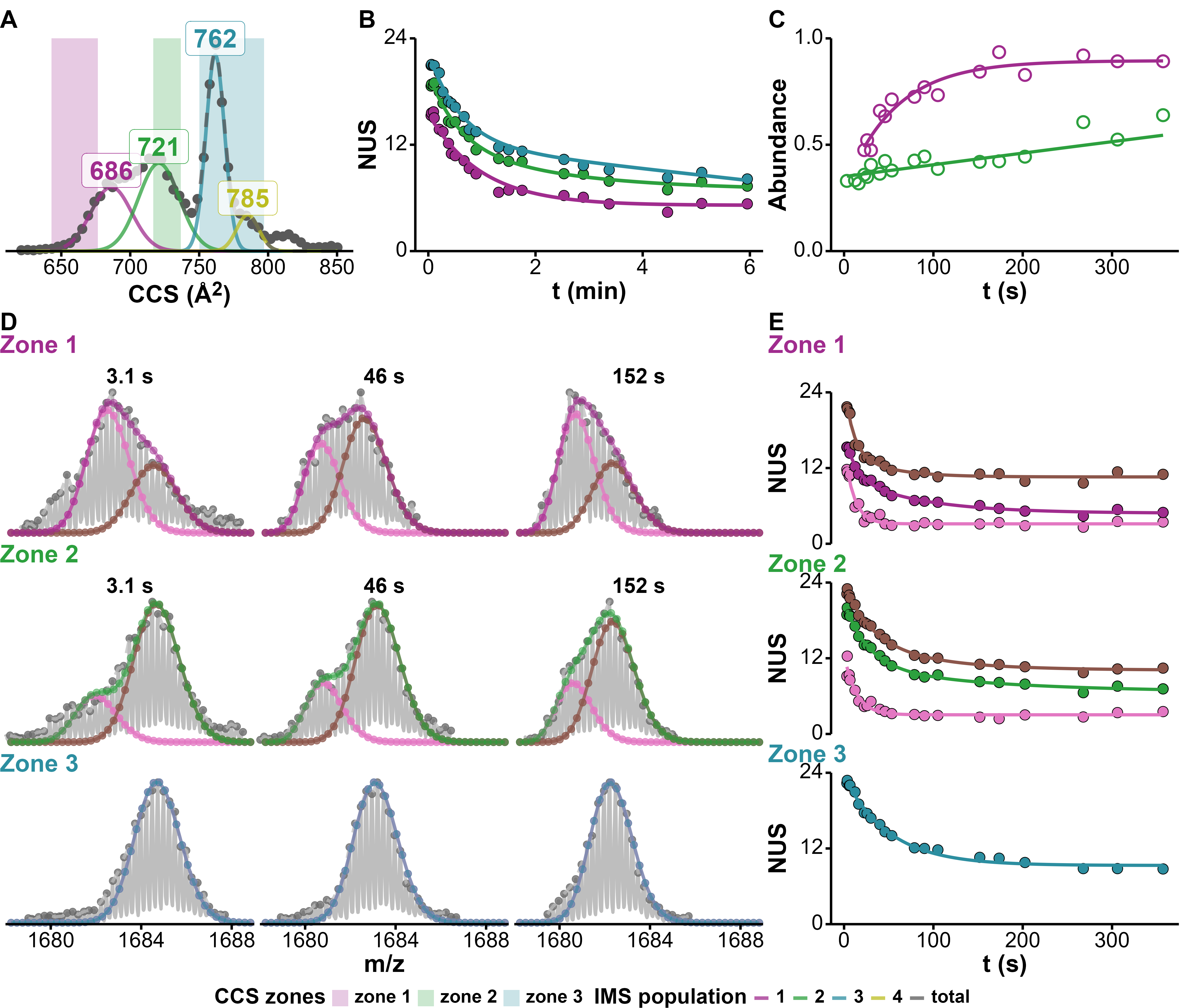 Il s’agit ici de filtrer les adduits non spécifiques, fréquents en ESI-MS native. Un seul exemple est déjà publié, où l’on s’intéresse à des complexes non-covalents de protéines [8]. Dans le cas des G4s, un oligonucléotide formant des conformères à 2 tétrades (“2T”) et 3 tétrades (“3T”) coordonne spécifiquement 1 et 2 K+, respectivement et ont donc des masses distinctes (MK et MK2, respectivement; Figure 5.11A,B). Cependant, 2T peut coordonner un potassium supplémentaire, non spécifiquement, et ainsi avoir la même masse que 3T. L’IMS permet de les séparer en phase gazeuse, et ainsi d’accéder à la cinétique d’échange “pure” de 3T (Figure 5.11C). De même pour 2T, on peut filtrer la contribution des brins non structurés (“U”). L’exemple de la Figure 5.11 illustre cette approche pour l’oligonucléotide 222T, qui forme des conformères U, 2T et 3T. Les distributions isotopiques observées pour MK2 sont particulièrement complexes, puisque 3T échange par EX2 et EX1 et que MK2 contient également un contaminant à 2 tétrades. On obtient donc une distribution trimodale, dont deux populations isotopiques sont corrélées (EX1 de 3T), et une indépendante (contaminant non spécifique de 2T) (Figure 5.11D, zone 2). La séparation IMS permet d’accéder aux contributions de 3T uniquement, et en particulier à son échange significatif par EX1 (Figure 5.11D, zone 3).