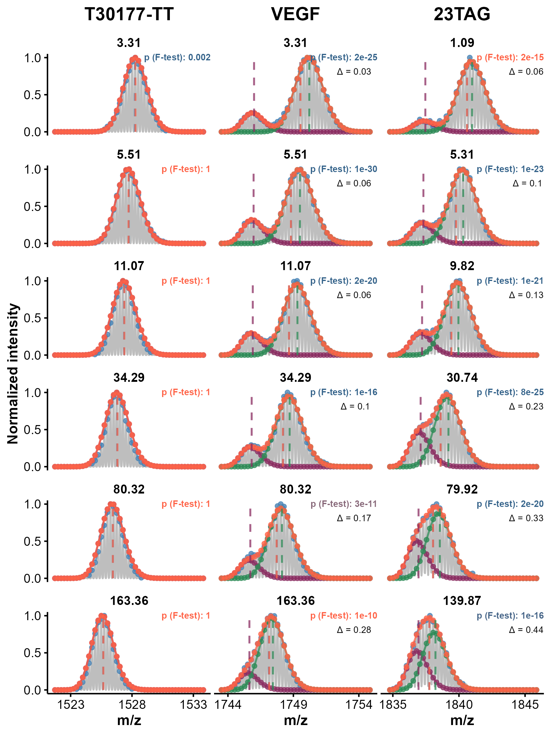 La beauté de cette approche est que seule des distributions physiquement possibles peuvent être générées, car les calculs sont bornés par les quantités de deutérium expérimentales et dépendent directement de la séquence de l’analyte. Seuls des résultats réalistes peuvent donc être obtenus. En outre, comme la largeur des distributions est fixe pour une séquence et une deutération donnée, ce que reflète parfaitement OligoR, il est possible de détecter des distributions “cachées”, c’est à dire deux distributions partiellement superposées qui apparaissent comme unique (voir les panneaux du bas de la Figure 5.32).