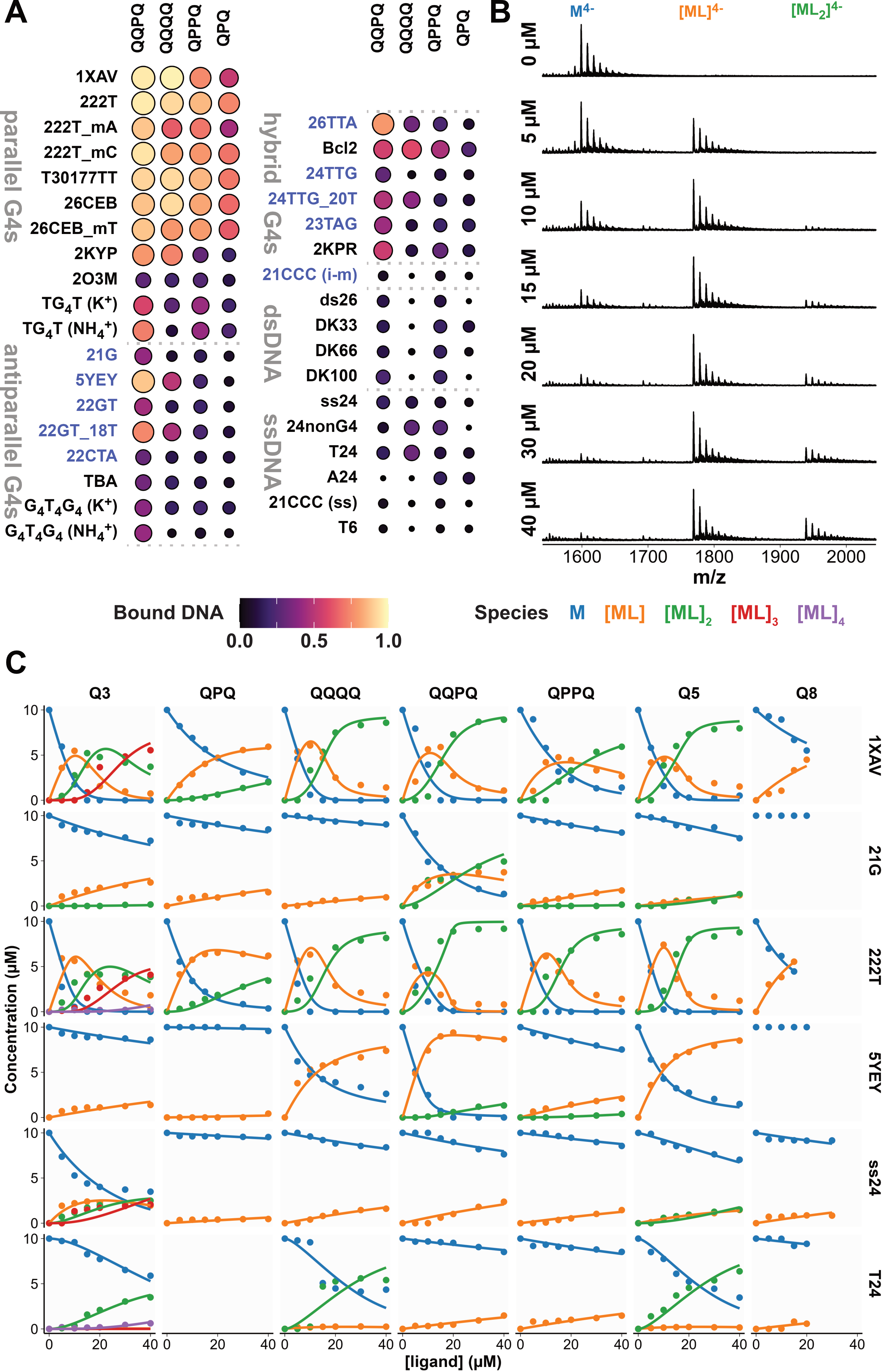 Grâce au coencadrement doctoral d’Alexander König, j’ai pu réexplorer ce thème de recherche pour tenter d’enfin sortir du paradigme du ligand aromatique plan condensé. Vincent Laffilé, doctorant de l’équipe de Y. Ferrand, a synthétisé une série de ces foldamères (Figure 5.14B), nous permettant de mieux caractériser les déterminants de cette sélectivité. Surtout, Alexander a souhaité tester un large panel de structures secondaires pour éviter les conclusions hâtives sur ladite sélectivité. Il a ainsi criblé par spectrométrie de masse native une large gamme de G4s et de contrôles non-G4, ce qui a permis de mettre en évidence la préférence marquée de QQPQ, Q4, QPPQ et QPQ pour la topologie parallèle (Figure 5.15A).
