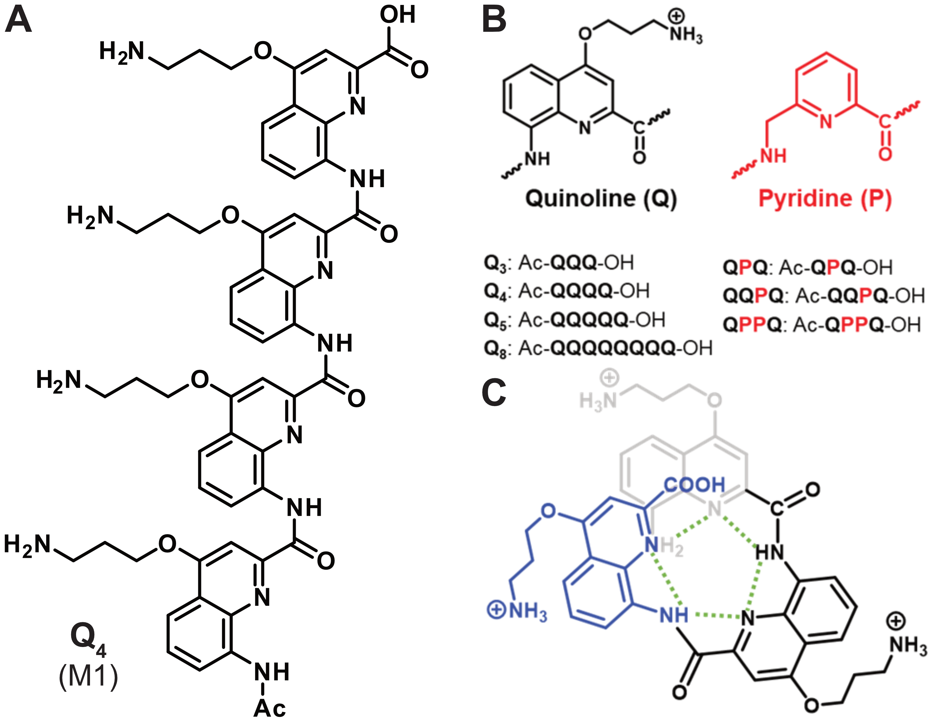Lors de son séjour sabbatique dans l’équipe, Liliya Yatsunyk (Professeure à Swarthmore, PA, USA) a observé par ESI-MS la formation d’un complexe entre un G4 de c-myc et une molécule inconnue contaminant le spectromètre de masse. Après que Liliya a identifié le propriétaire de la molécule, l’équipe de Yann Ferrand (IECB, Bordeaux), et la nature de celle-ci, je me suis retrouvé le chanceux propriétaire du foldamère M1, plus tard rebaptisé Q4 (Figure 5.14A).1 Moore définit les foldamères comme “tout oligomère qui se replie dans un état conformationnel ordonné en solution, dont les structures sont stabilisées par un ensemble d’interactions non covalentes entre les unités monomères non adjacentes” [31]. Il existe deux grandes classes de foldamères : les foldamères à brin unique qui se replient uniquement sur eux-mêmes (peptidomimétiques) et les foldamères à brin multiple qui peuvent également s’associer (nucléotidomimétiques). Ici, c’est de la première que j’hérite, puisque Q4 fait partie d’une série de foldamères formés d’hétérocycles pyridine (P) et quinoline (Q) liés par des amides, ce qu’un cerveau contaminé par les ligands de G4s pourrait aussi interpréter comme des oligomères de 360A (Figure 1.6).