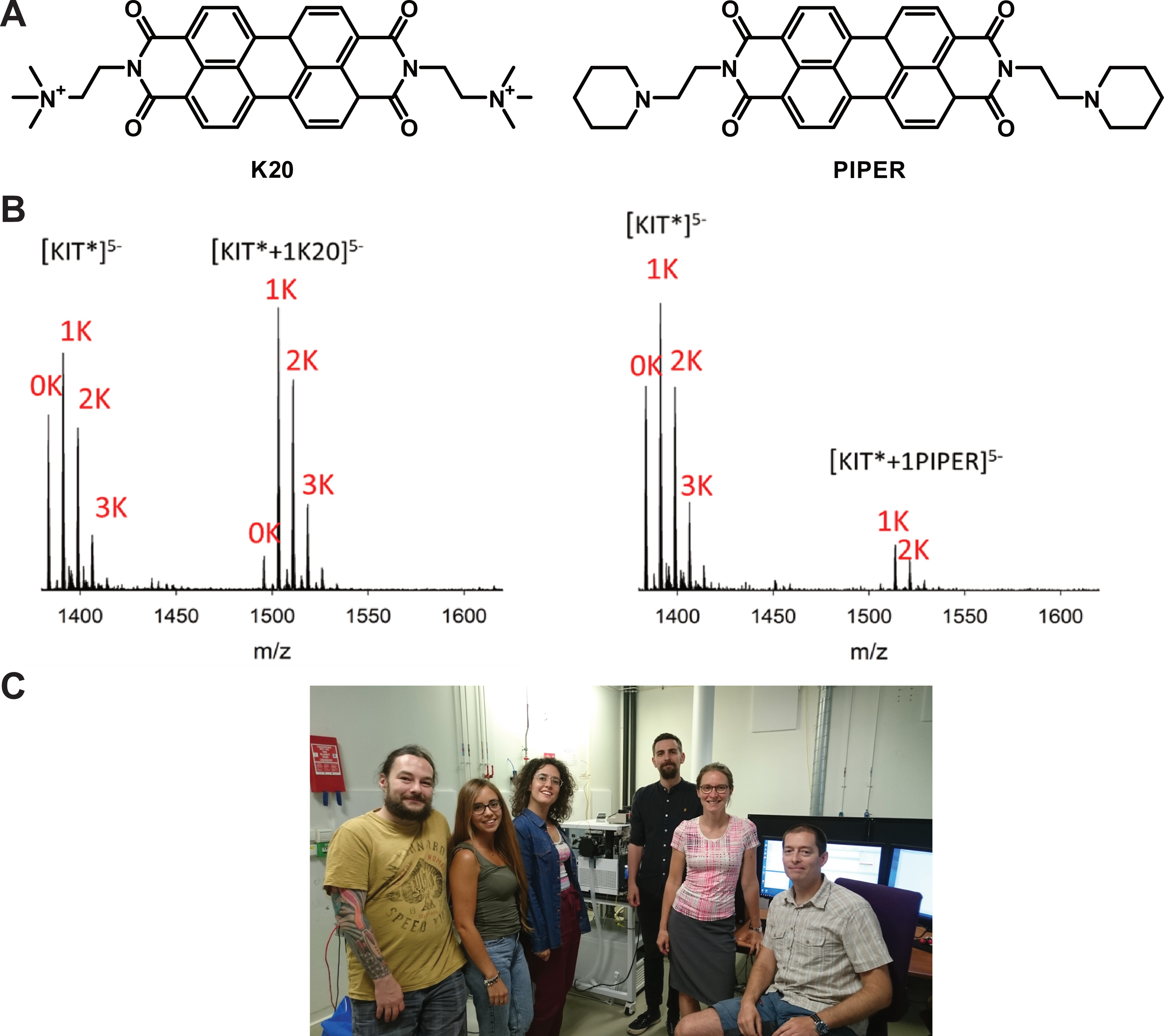 Durant mes activités de caractérisation de ligands de G4 par spectrométrie de masse, j’ai également encadré Silvia Ceschi, une étudiante de thèse de l’université de Padoue (Figure 5.20C ; maintenant postdoc au Massachusetts General Hospital), lors de son séjour de 6 mois au laboratoire pour ses travaux sur la séquence KIT2 du promoteur d’oncogène humain c-KIT [39]. Plus précisément, l’étude était centrée sur la sélection d’un intermédiaire structuré en G4, à long temps de vie, pour lequel un rôle physiologique est possible compte tenu de la vitesse des processus transcriptionnels [40].