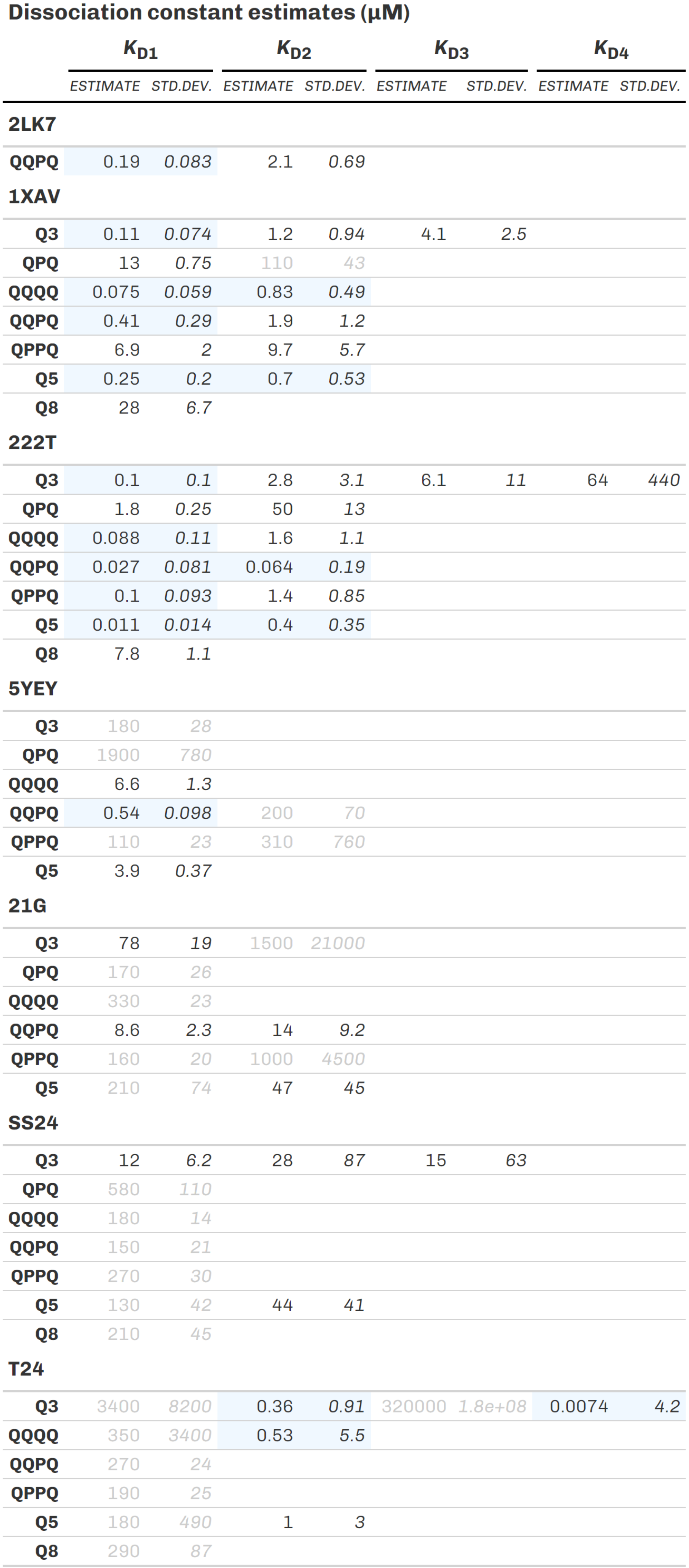 J’ai développé un script pour la quantification semi-automatisée de chacune des espèces (les différentes stœchiométries d’interaction) de ces 144 spectres de masse, et le calcul subséquent des affinités. J’ai également utilisé ce script pour quantifier les espèces des titrations entre sept foldamères et six oligonucléotides (294 spectres ; Figure 5.15B, C). J’ai ensuite écris un script générant… des scripts servant d’input pour le logiciel DynaFit, permettant la modélisation dynamique de ces titrations sur la base des équations chimiques de réactions [35, 36]. L’exécution de ces scripts automatiquement et l’extraction des résultats (\(K_d\), coopérativités, paramètres de fit) ont également été scriptées. Cette automatisation du traitement des données a permis un gain de temps notable et des gains de robustesse et répétabilité. Ces titrations ont permis la détermination de \(K_d\) de l’ordre de la centaine de nanomolaires pour les G4s parallèles, plusieurs ordres de grandeur de mieux qu’avec les autres topologies, bien que des exceptions existent (Figure 5.16).