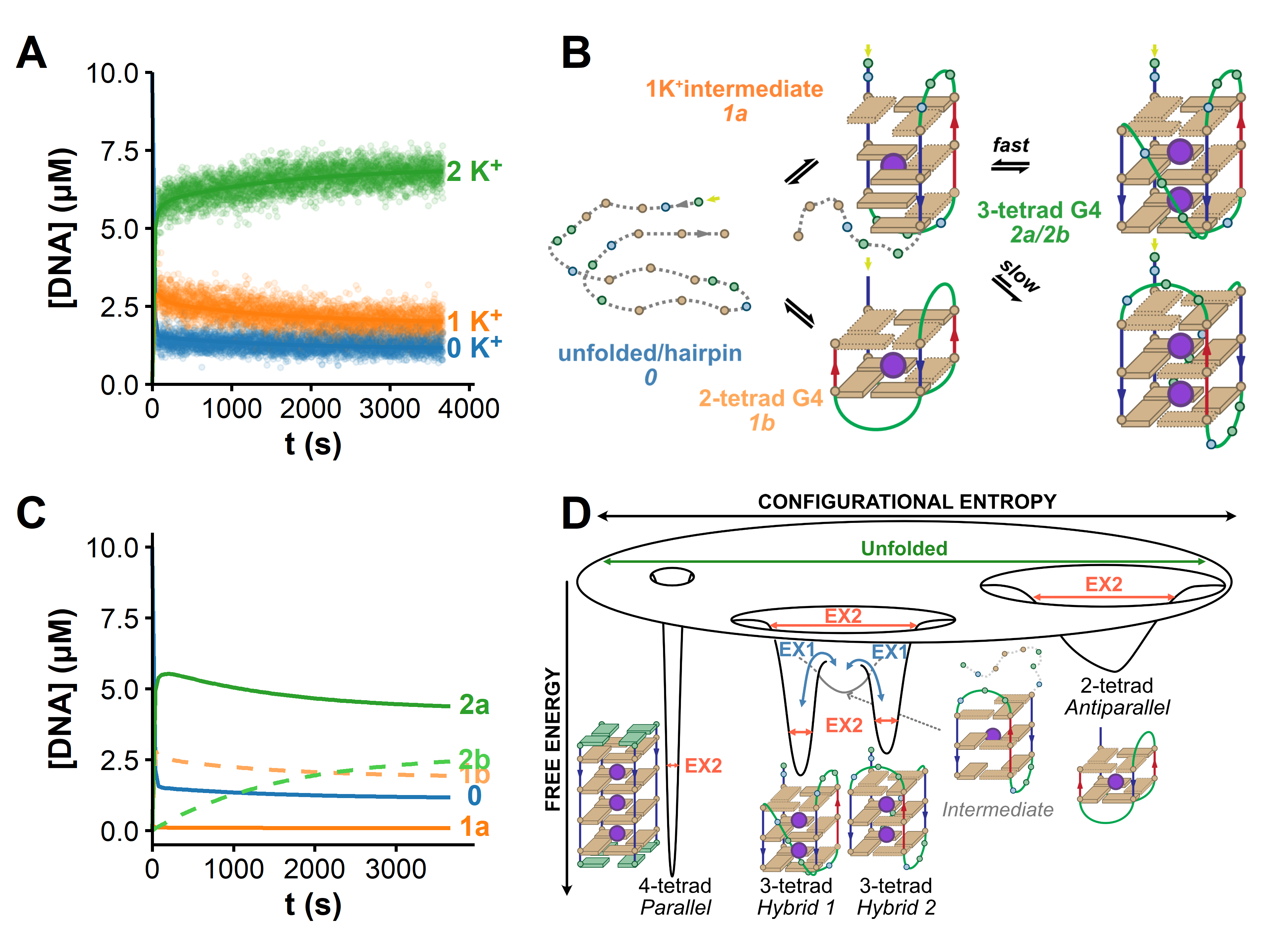 Le mécanisme de l’échange dépend donc de la stabilité, du nombre de tétrades et de la topologie des G4s. Nous avons identifiés deux cas limites (Figure 5.6) :