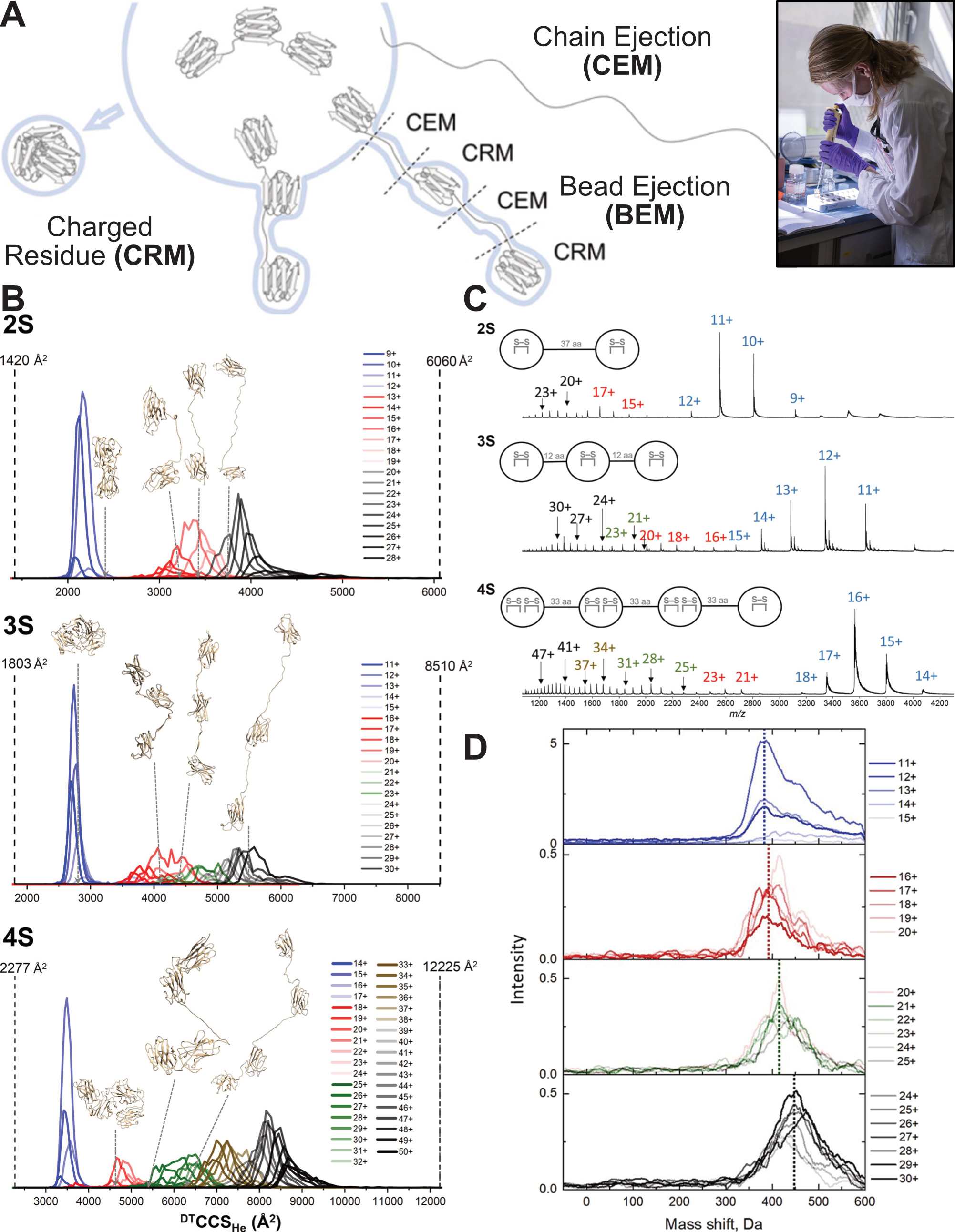 Le mécanisme d’ionisation électrospray est intrigant : une fraction de la population ne suit pas le mécanisme des résidus chargés (CRM) mais ne peut pas non plus s’ioniser par pure éjection de chaîne. Nous en avons déduit qu’un mécanisme hybride est possible, dans lequel les domaines globulaires sont éjectés un à la fois d’une gouttelette mère. Les corrélations entre la charge et la surface accessible au solvant de protéines dénaturées ou intrinsèquement désordonnées sont également compatibles avec ce “mécanisme d’éjection de perles” (BEM), que nous avons proposé comme principe général de l’électrospray des biomolécules.