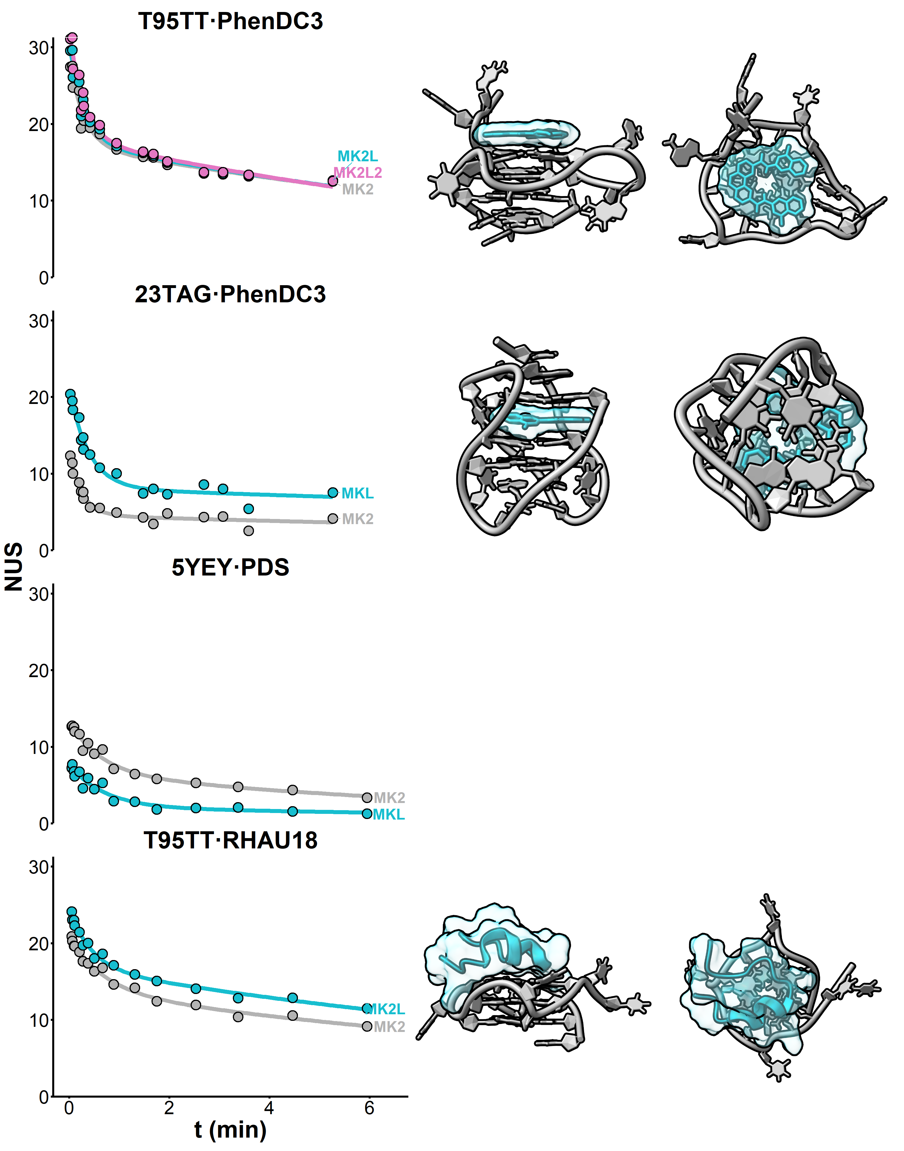 Nos premiers résultats montrent que les ligands interagissant par \(\pi\)-stacking sur les tétrades externes induisent un ralentissement de la cinétique d’échange dans les premières secondes/minutes par rapport au G4 libre, puis convergent vers des valeurs similaires (Figure 5.12; T95TT/PhenDC3). Cela s’explique par une protection accrue des tétrades externes, qui échangent normalement dans les premières secondes à minutes, mais pas des internes.