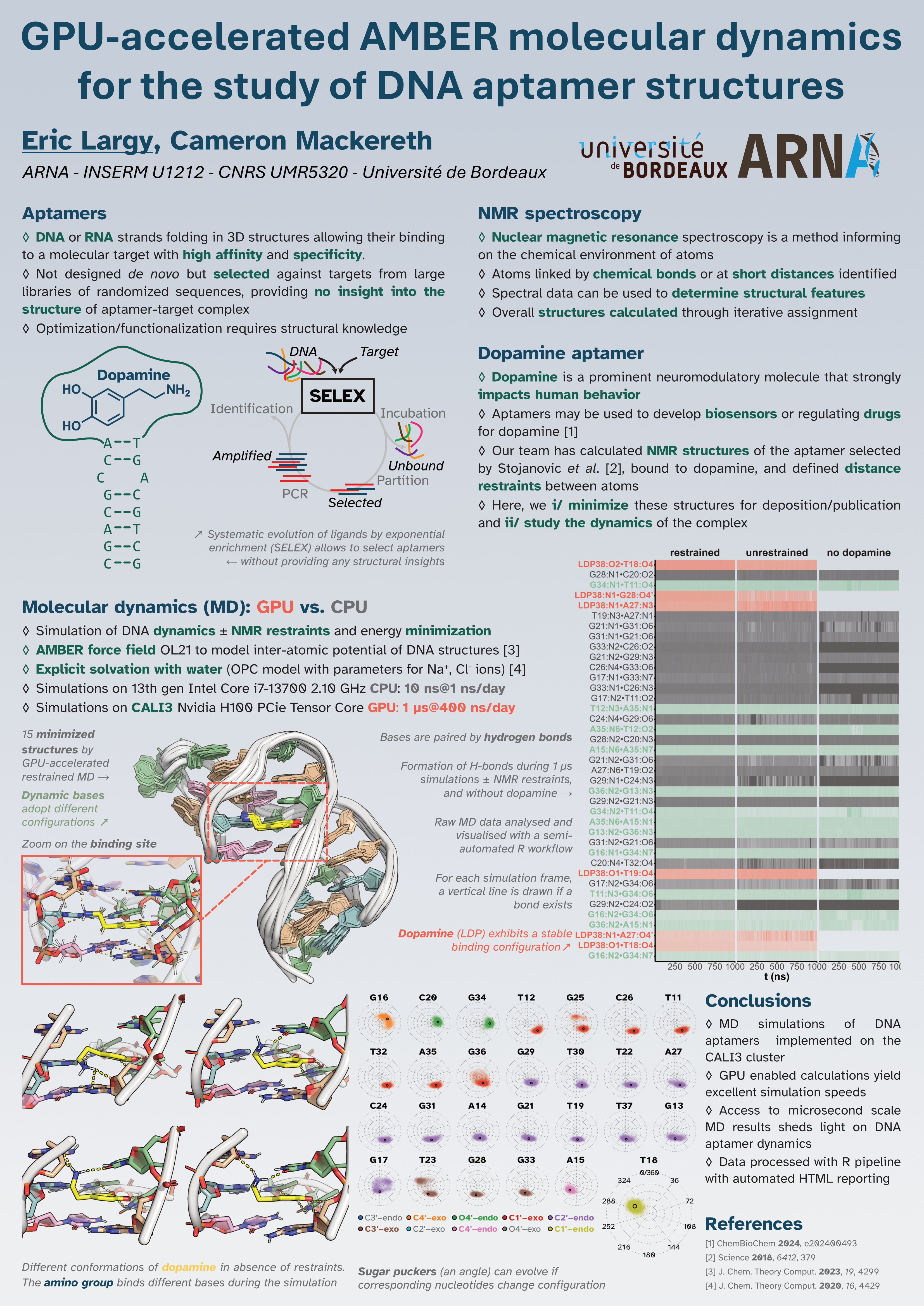 Les systèmes présentés ici sont composés d’une ou plusieurs chaînes ADN ou ARN (ou protéique) comprenant plusieurs dizaines de résidus. Ils doivent être simulés dans un solvant explicite et en présence de sels, impliquant la présence de plusieurs dizaines de milliers d’atomes (~ 40 000 pour le complexe RKEC1·dopamine). Pour des calculs de trajectoires courtes (de l’ordre de 10 ns), ce qui est suffisant pour un dépôt de structure sur la PDB, les calculs de rMD peuvent conceptuellement être effectués sur un CPU d’ordinateur de bureau. Par exemple, avec mon CPU 13th gen Intel Core i7-13700 2.10 GHz, le complexe RKEC1·dopamine est simulé avec des vitesses de l’ordre de la nanoseconde par jour de calcul. Plusieurs calculs peuvent être facilement lancés en parallèle en allouant un cœur CPU par structure, ce qui m’a permis de générer 15 structures en une dizaine de jours.