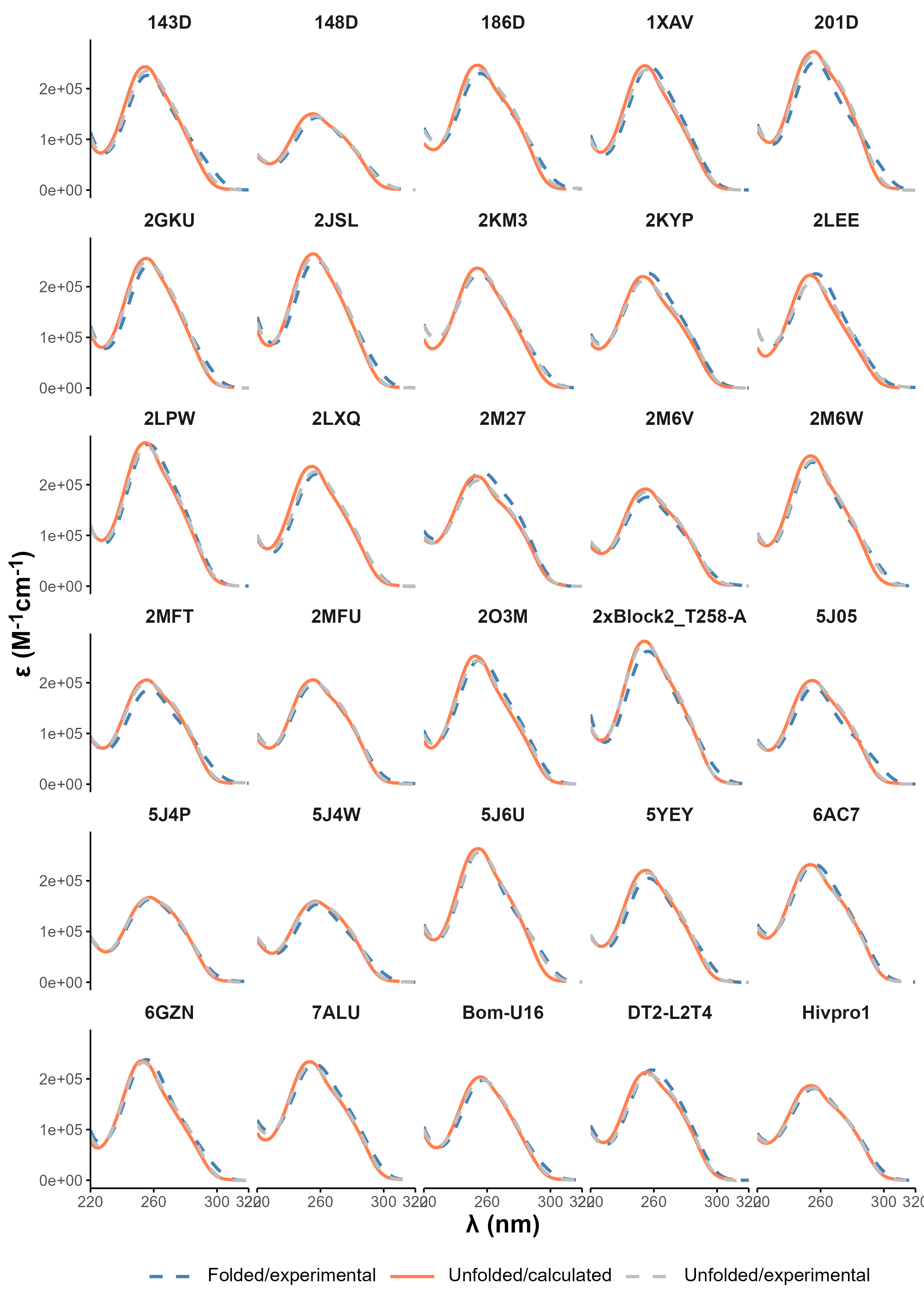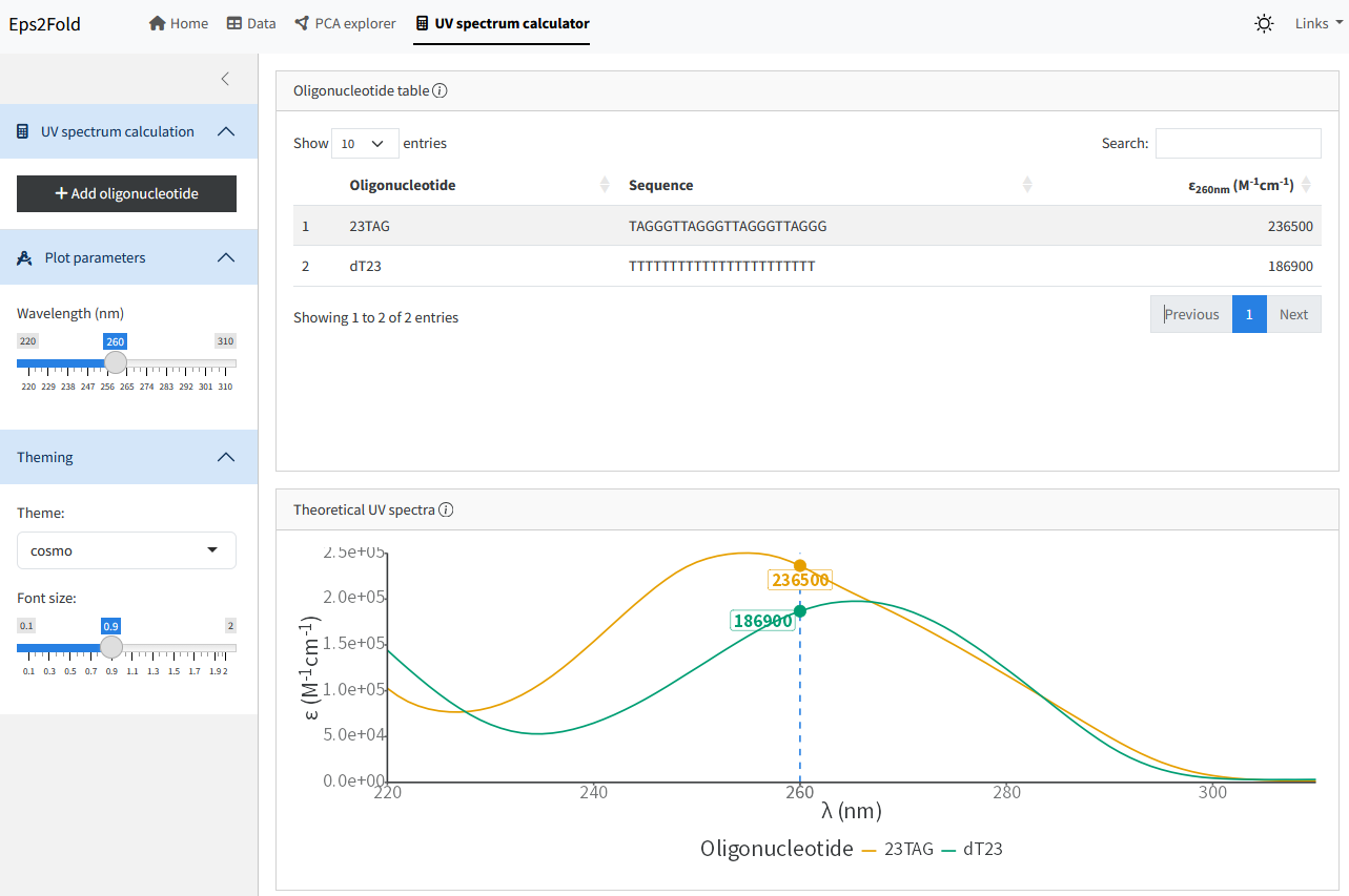 Calcul des coefficients d’extinction molaire à 260 nm \(\varepsilon_{260 nm}\) des oligonucléotides, par la méthode de Tataurov et al. [96], c’est à partir de leur séquence et de l’Équation 5.16, où \(\varepsilon_i\) est le coefficient du nucléotide \(i\), \(\varepsilon_{i, i+1}\) celui du doublet de nucléotide en position \(i; i+1\) et \(N_b\) le nombre total de nucléotides. C’est cet algorithme que j’ai ensuite utilisé pour le projet Eps2Fold décrit en Section 5.4.1. Le logiciel associé dispose d’un onglet dédié pour le calcul des coefficients d’extinctions molaires (et de spectres d’absorbance) à partir de séquences oligonucléotidiques (Figure 5.34).