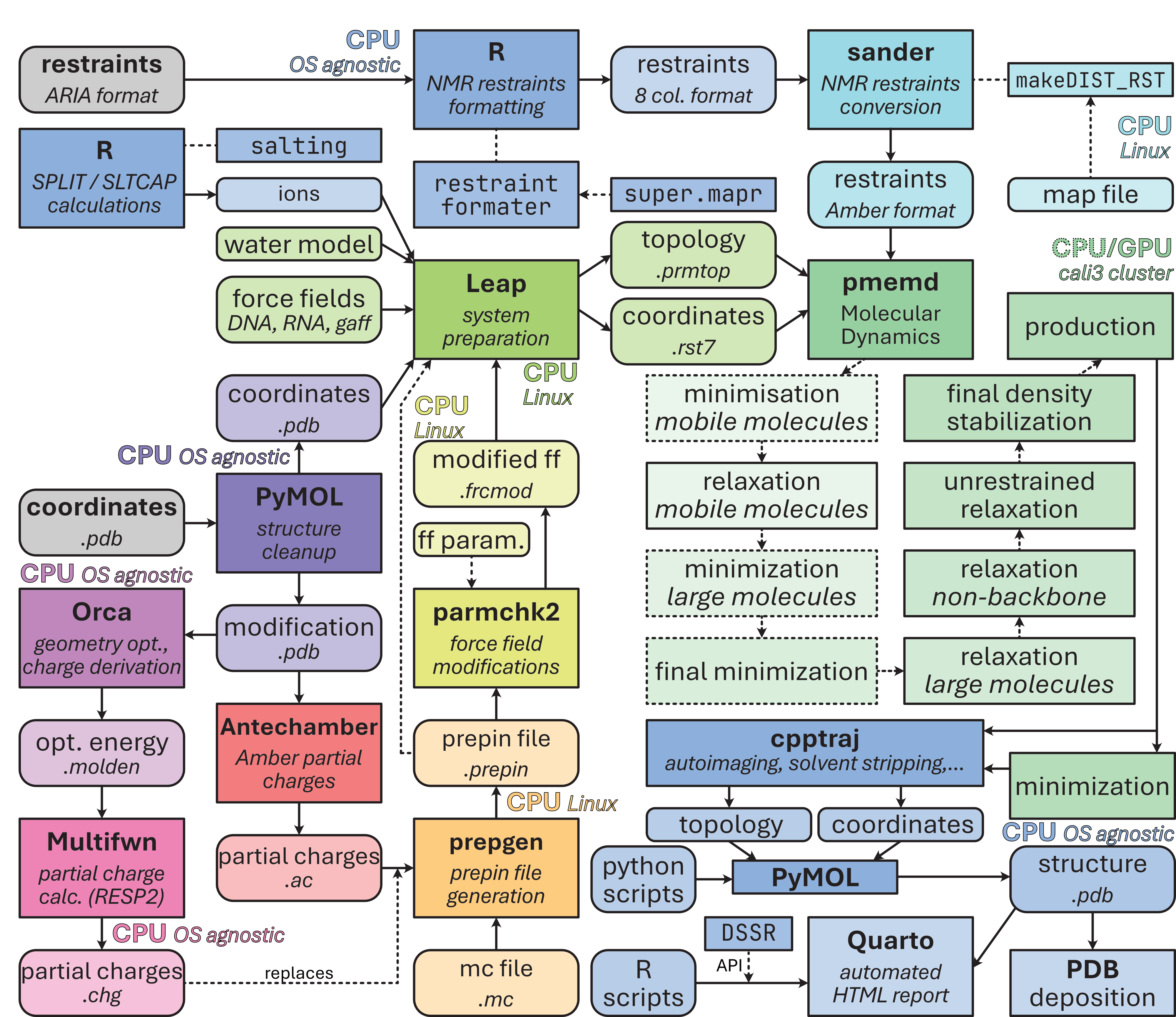 Amber24, pouvant tenir compte de i. contraintes RMN et ii. modifications non-canoniques et ligands. Les coordonnées en entrées peuvent être le résultat de calculs consécutifs à des expériences RMN, ou tout autre source (pdb, structure “dessinées” manuellement). Après nettoyage de la structure dans PyMOL, les coordonnées peuvent êtres préparées dans Leap, où les champs de force ad hoc, le modèle de solvatation et les ions sont ajoutés. Le nombre de ces derniers doit permettre de neutraliser les charges des acides nucléiques. Pour ajuster la force ionique, les calculs de nombre de cations et anions à ajouter par les méthodes SPLIT/SLTCAP ont été implémentés dans R. Dans le cas de modification des acides nucléiques, ou de ligands non décrits dans les champs de force d’acides nucléiques (OL21, OL3), des modifications au champs de force doivent être importées dans Leap. Pour cela, la modification est isolée dans PyMOL, coiffée par des atomes permettant de correctement simuler son environnement chimique, si nécessaire, puis sa géométrie est optimisée par mécanique quantique, ici dans le logiciel ORCA. Après calcul de l’énergie de la structure optimisée et convertie en .molden, les charges partielles des atomes sont calculées par la méthode RESP2 implémentée dans le logiciel Multifwn. Un fichier de charges partielles compatible avec Amber est généré avec Antechamber, puis les charges y sont substituées par les charges RESP2. Enfin, prepgen et parmchk2 sont utilisés pour générés les fichiers permettant à Leap de lire les modifications et de les implémenter pour les atomes de la modification, sans importer les atomes de la coiffe, comme défini dans le fichier .mc. Les fichiers de topologies et coordonnées générés dans Leap sont soumis aux différentes étapes de dynamique moléculaire avec pmemd. Une préparation robuste du système en 10 étapes (ici présentée de façon simplifiée) a été implémentée à partir du protocole de Roe et Brooks [97]. Les étapes de relaxation et production MD utilise l’implémentation CUDA de pmemd que j’ai installé sur les serveurs de calculs DOREMI CALI v3 du Mésocentre de Calcul Intensif Aquitain de l’Université de Bordeaux. Les étapes de minimisation sont faites sur CPU à double précision pour éviter des overflow numériques si les forces mises en jeu sont élevées. Pour l’application de contraintes RMN, le fichier initial les décrivant est converti dans un format Amber via un script R, pour générer un fichier à 8 colonnes qui peut être lu et converti par le module pmemd au format Amber. Après production, une minimisation finale peut être effectuée si un ensemble doit être produit. Un pré-traitement des trajectoires est effectué en C++ avec cpptraj, puis les coordonnées finales sont converties en fichier pdb dans PyMOL. Les figures sont enfin générées avec des scripts Python et R dans un notebook Quarto permettant d’automatiser le traitement, la visualisation et la publication des données.
