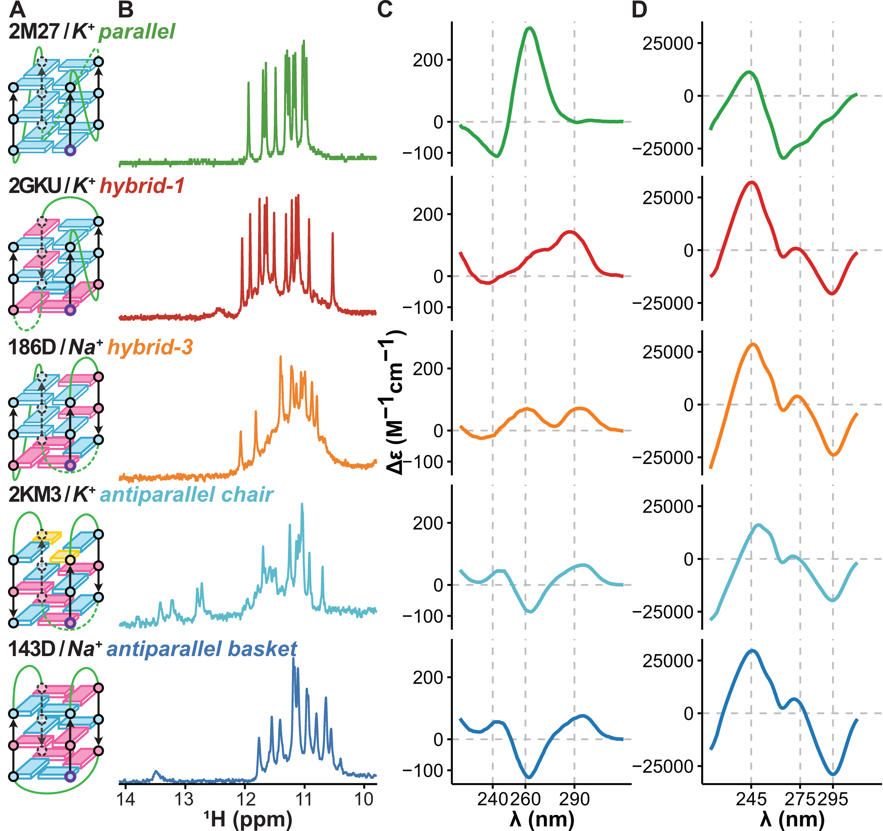 Nous avons donc souhaité établir une base de données de séquences formant des G4s, pour lesquelles il est établi que leurs structures dans le tampon “Native MS” (100 mM TMAA + 1 mM KCl) correspond à celles de référence, c’est à dire résolues par RMN et déposée dans la PDB [95]. Pour cela, Anirban Ghosh, un postdoctorant de l’équipe (désormais Senior Staff Scientist au CEITEC, République Tchèque), à fait l’acquisition des spectres de spectrométrie de masse native, de RMN du proton, de spectroscopie CD, et les courbes de dénaturation thermiques (par UV) en conditions Native MS et de référence (dépendantes des conditions expérimentales reportées dans la PDB). Le but a ensuite été de sélectionner les séquences ayant des spectres RMN et CD similaires dans ces deux conditions (Figure 5.33), puis de publier une base de données comprenant l’ensemble de ces données expérimentales.