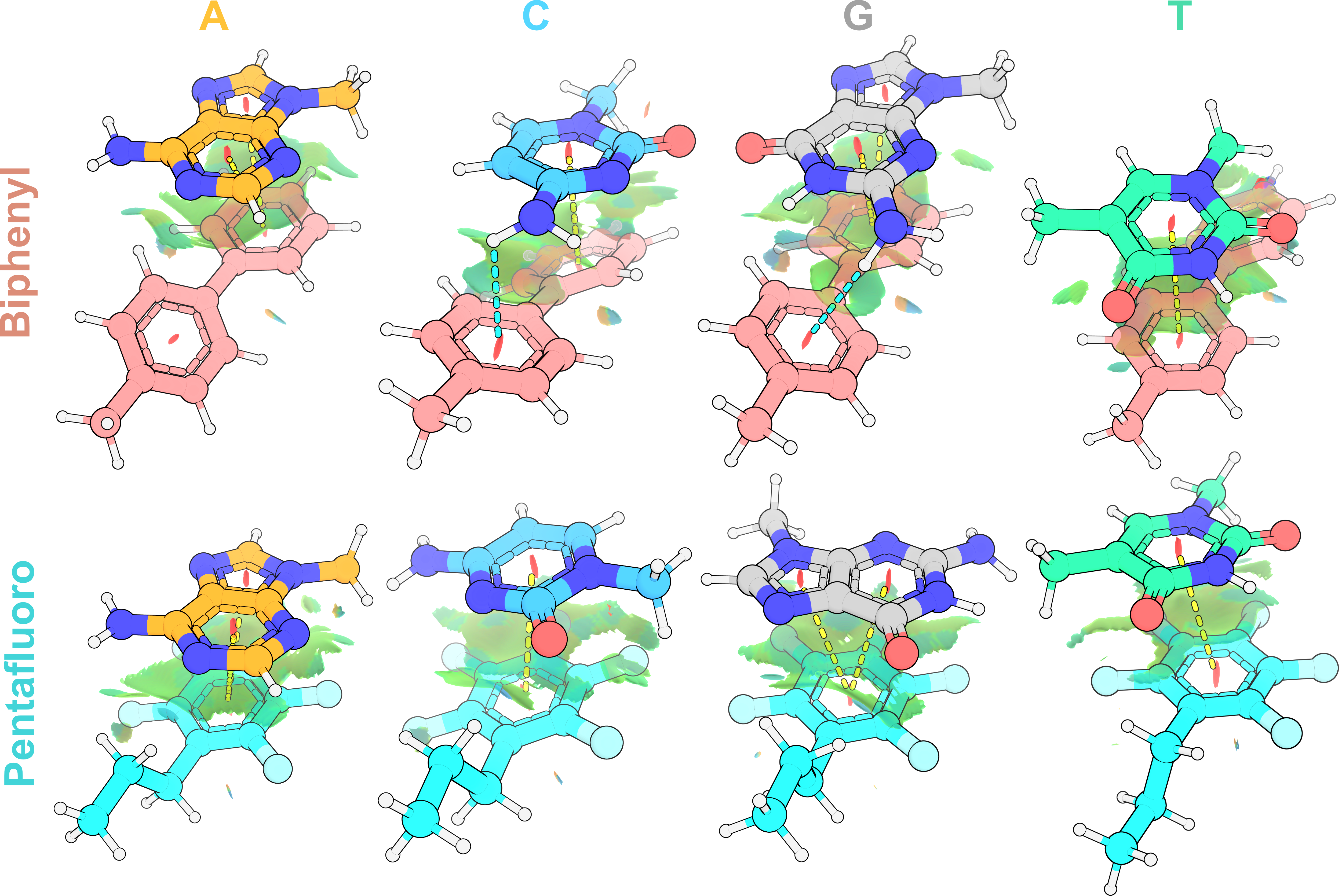 Pour répondre à ces questions, j’ai construit des séries de complexes entre les 4 nucléobases d’ADN et 2 ligands de colonne, un biphényle et un propyl-pentafluorophényle. Pour chaque combinaison nucléobase/ligand, j’ai préparé 4 géométries par rotation de 90° de l’angle de twist, tel que définit dans un duplex [129], pour un total de 32 complexes. J’ai ensuite optimisé la géométrie de ces complexes avec la fonctionnelle hybride B3LYP (jeu de bases def2-TZVP + def2/J) avec une correction non-locale de la dispersion (DFT-NL), ce qui est nécessaire pour correctement tenir compte des forces de dispersion de London dans ces systèmes dominés par des interactions attractives de van der Waals [130]. Les énergies de ce type de systèmes sont généralement surestimées à cause de la superposition des jeux de bases (Basis Set Superposition Error, BSSE), que j’ai corrigée en implémentant une correction BB-CP (Boys-Bernardi Counterpoise Correction) [131]. Aux aspects quantitatifs, j’ai ajouté une étude qualitative de la nature de l’interaction en calculant les potentiels électrostatiques (ESP) et les indicateurs de régions d’interaction (Interaction Region Indicator, IRI, Figure 5.48)
