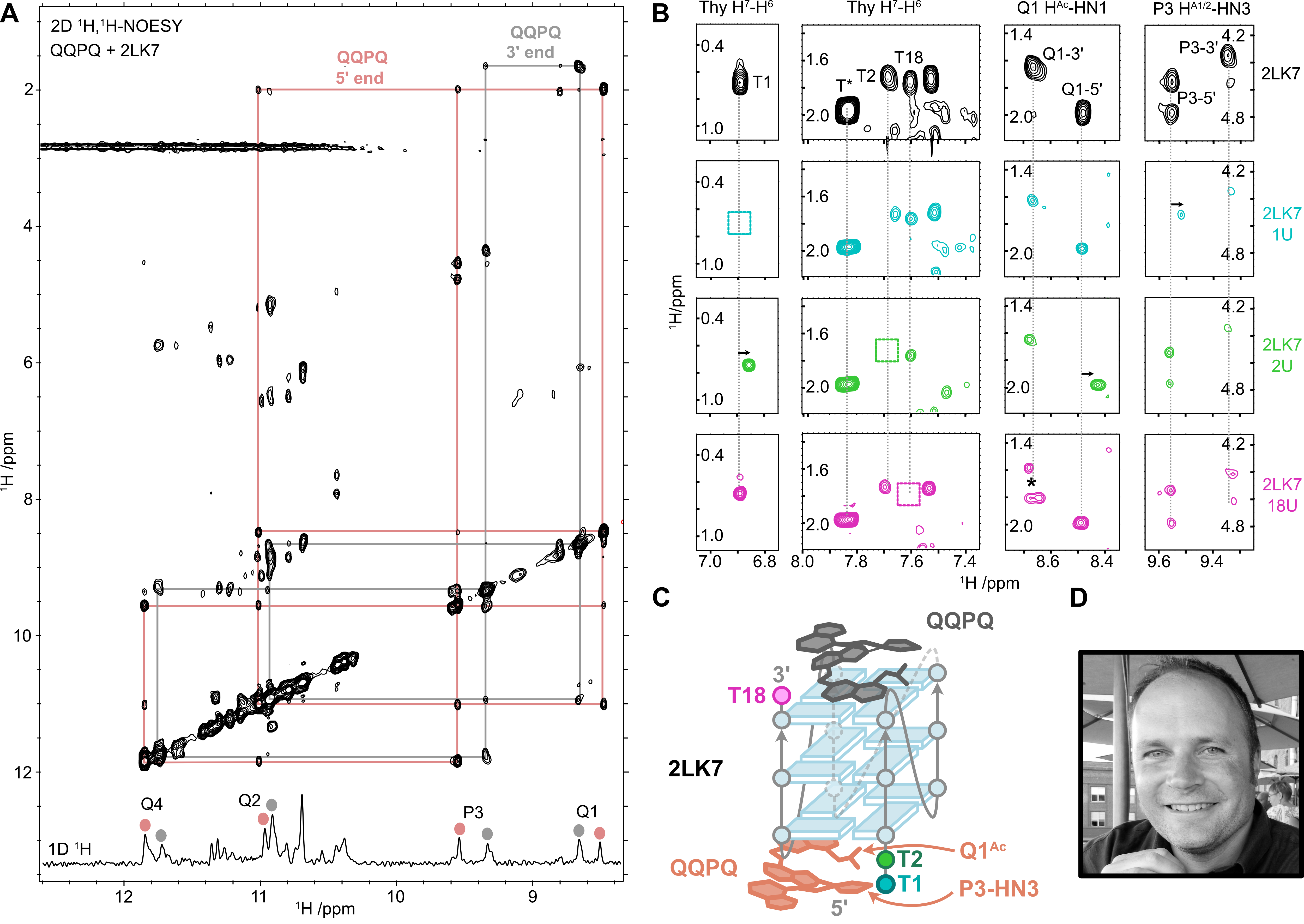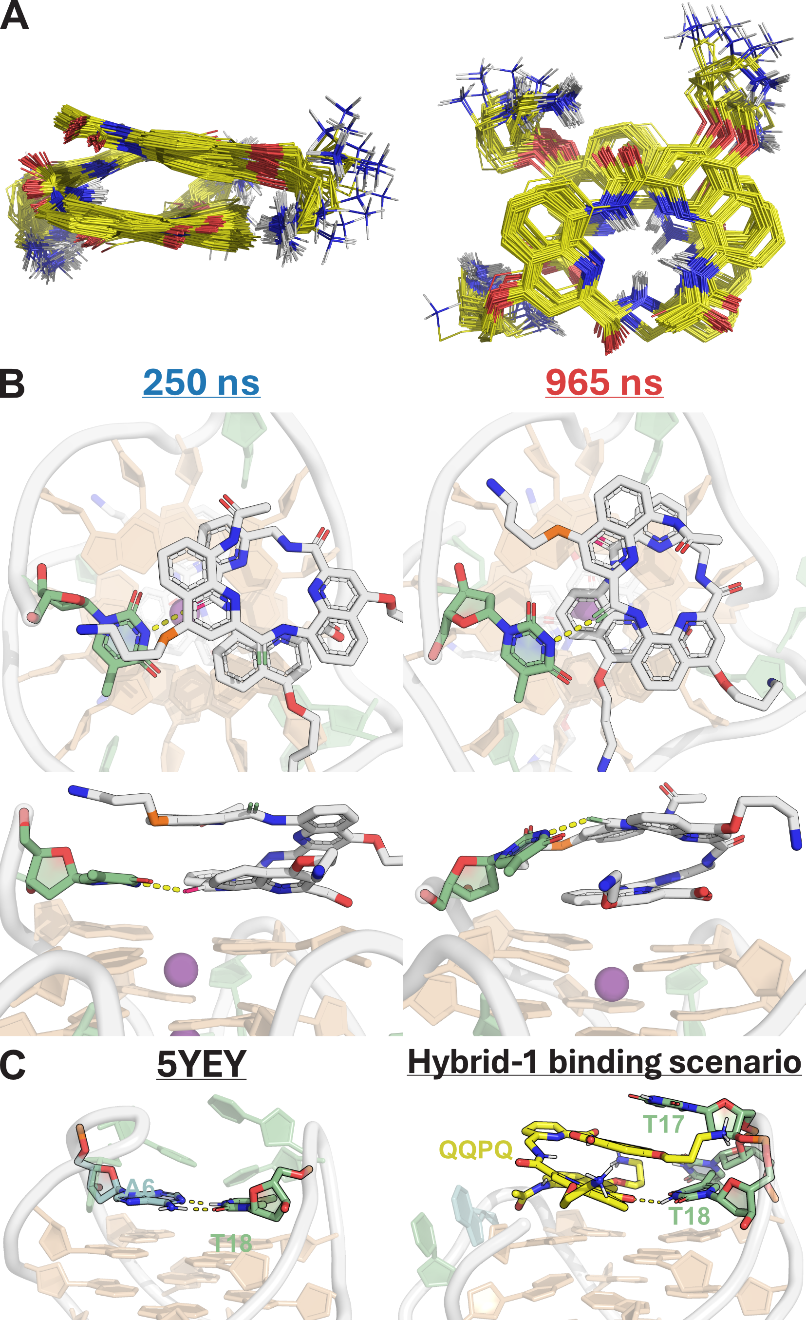 Les amides de QQPQ peuvent interagir de façon discrète avec des thymines de boucles (Figure 5.19B), venant confirmer la tendance de ces foldamères à lier des oligonucléotides riches en T. Cette interaction particulière a également été observé pour 5YEY (Figure 5.19C), amenant un élément d’explication de l’affinité particulièrement bonne de QQPQ pour ce G4 non parallèle dont la topologie est altérée par l’interaction.