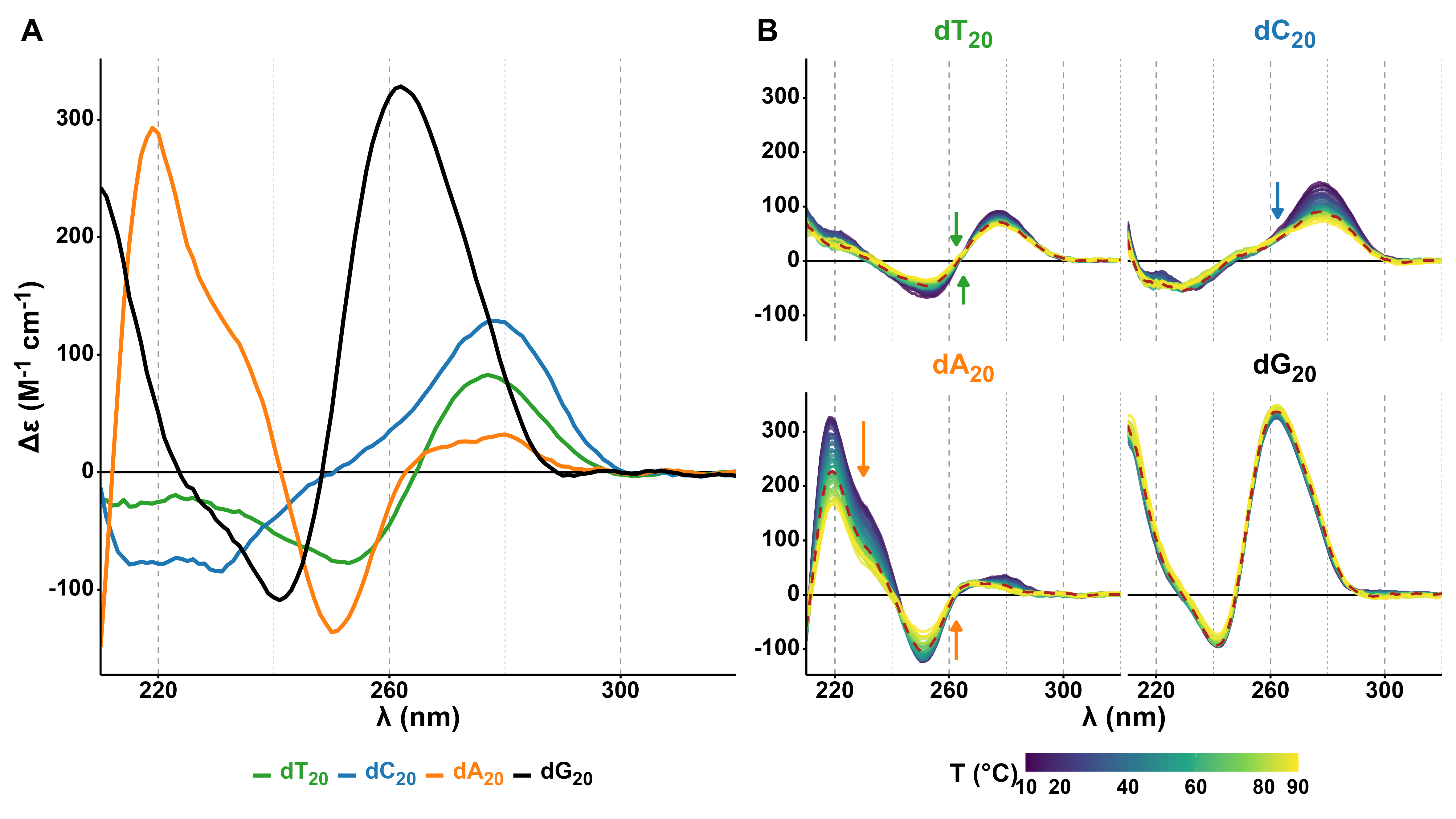 Cela ne suffit pas, cependant, à expliquer l’ordre rétention des oligonucléotides modèles en fonction de leur structure primaire. L’exemple le plus criant est dG20, puisqu’il est très peu retenu alors que les guanines forment les complexes les plus stables. Bien sûr, les effets hydrophobes (C < G < A < T) contribuent très probablement [133]. Mais le lecteur attentif aura compris que le problème majeur réside dans le choix des séquences, que j’ai décidé d’illustrer par CD, car il s’agit bien ici d’une question de structure secondaire.